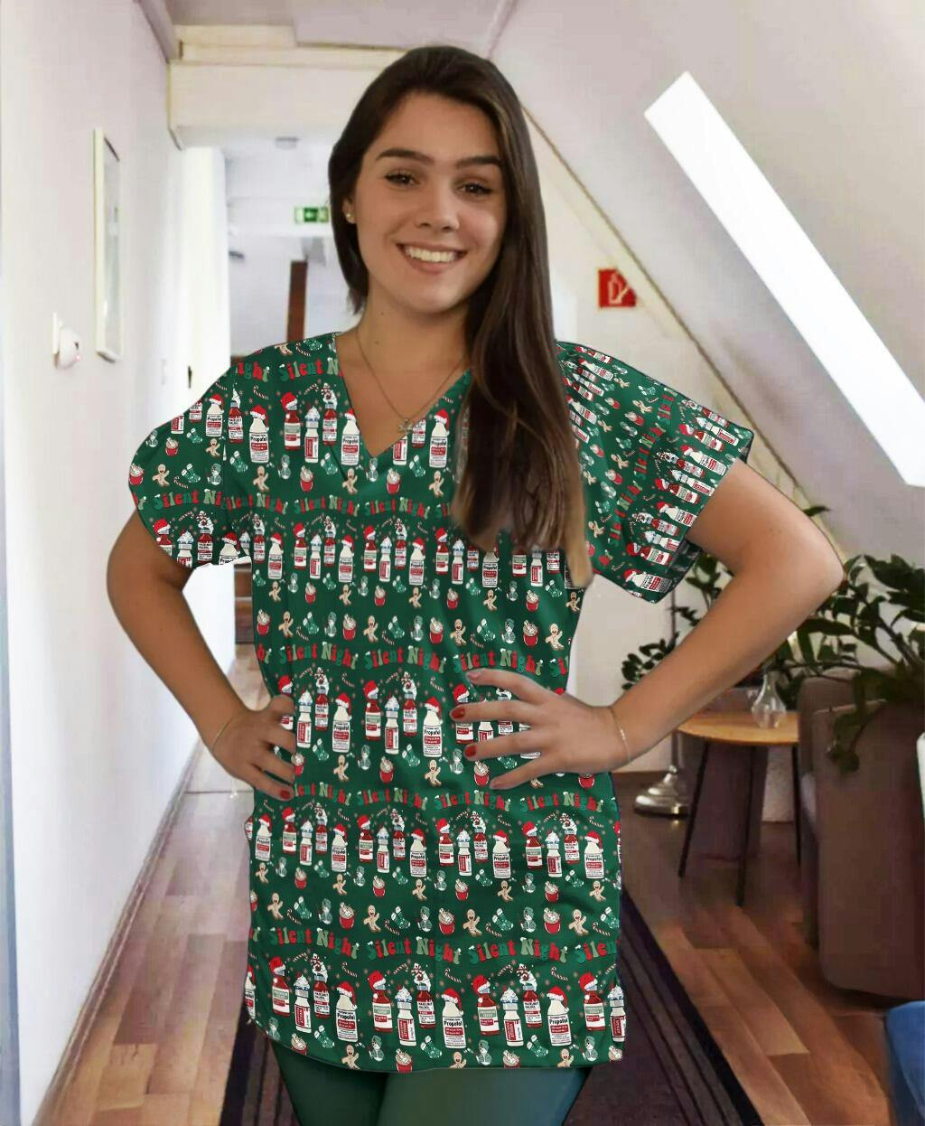Absolutely love this Christmas scrub top! The green color with holiday prints is super festive and makes my shifts feel a lot more cheerful. The fabric is breathable and comfortable to wear all day. I've gotten so many compliments from coworkers already.