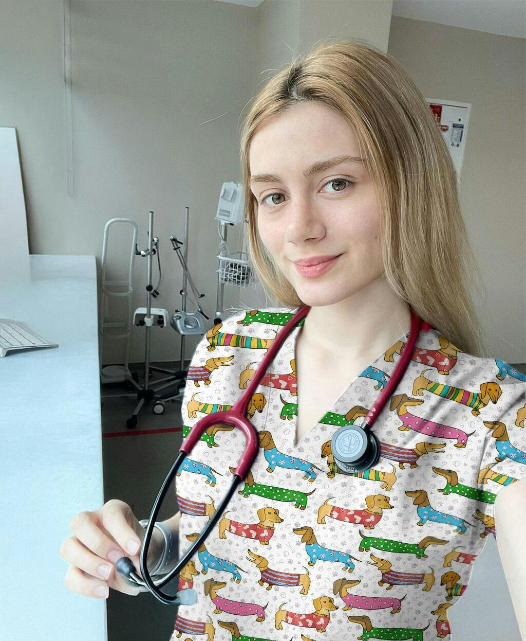 This scrub is adorable! The dachshund print is so fun and bright, and the pink color really stands out. The fit is perfect and the material feels soft but durable. Even my pediatric patients get excited when they see it.
