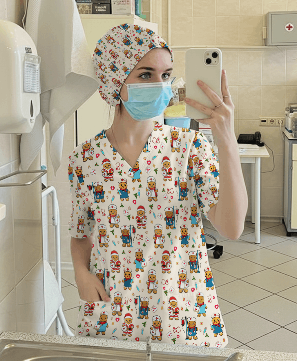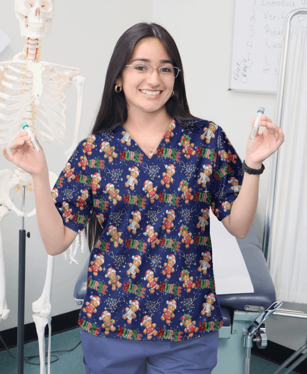 Love this scrub! The gingerbread pattern makes everyone smile and adds a little joy to work. The quality is really nice and it fits perfectly. Washed it a few times already and still looks brand new.