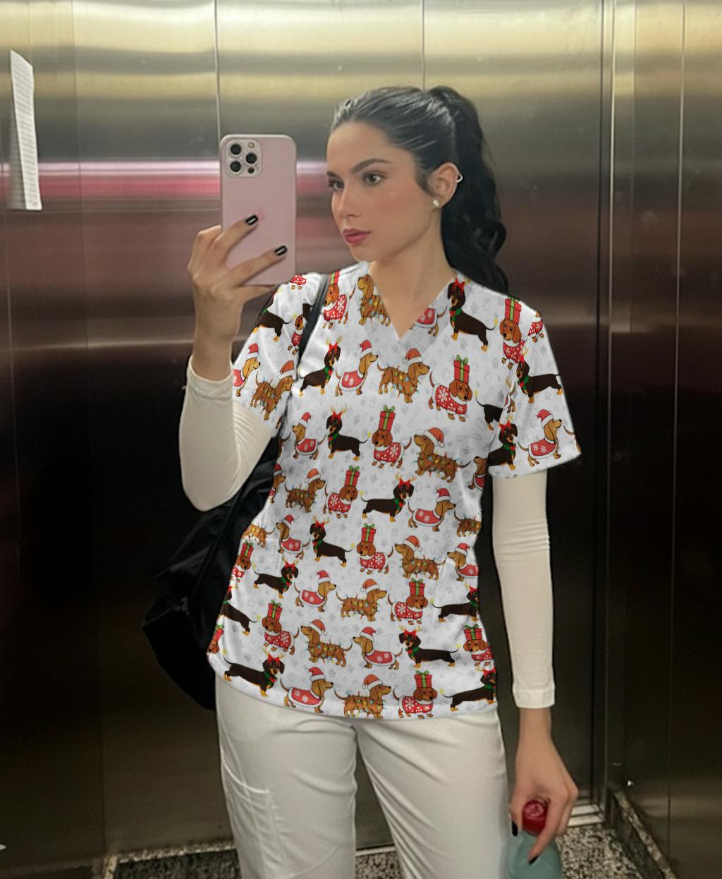 Love this festive dachshund scrub! Perfect for holiday season at work. Fabric feels durable and the design makes everyone smile.