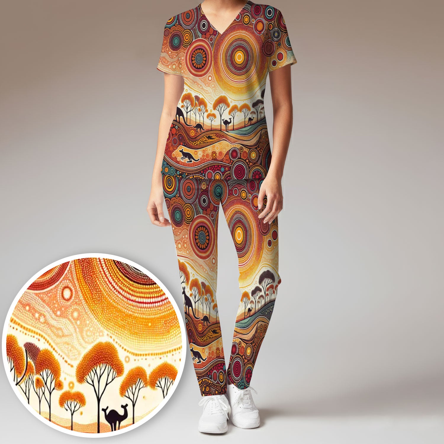 Aboriginal Kangaroo Art Women's Scrub Set, Scrub Pants and V Neck Top