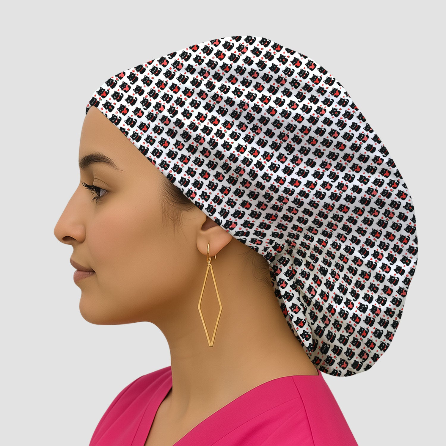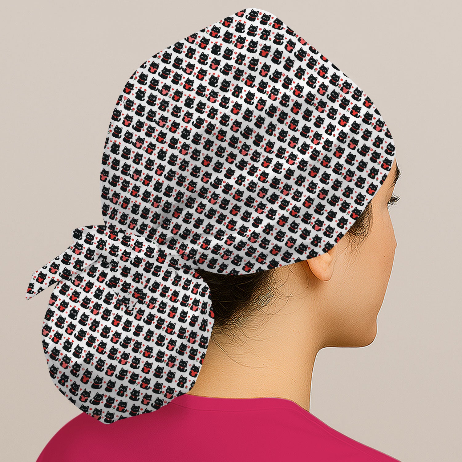 Black Cat Valentine Nurse Scrub Cap, Cute Heart Pattern Medical Hat, Breathable Fabrics Nursing Uniform