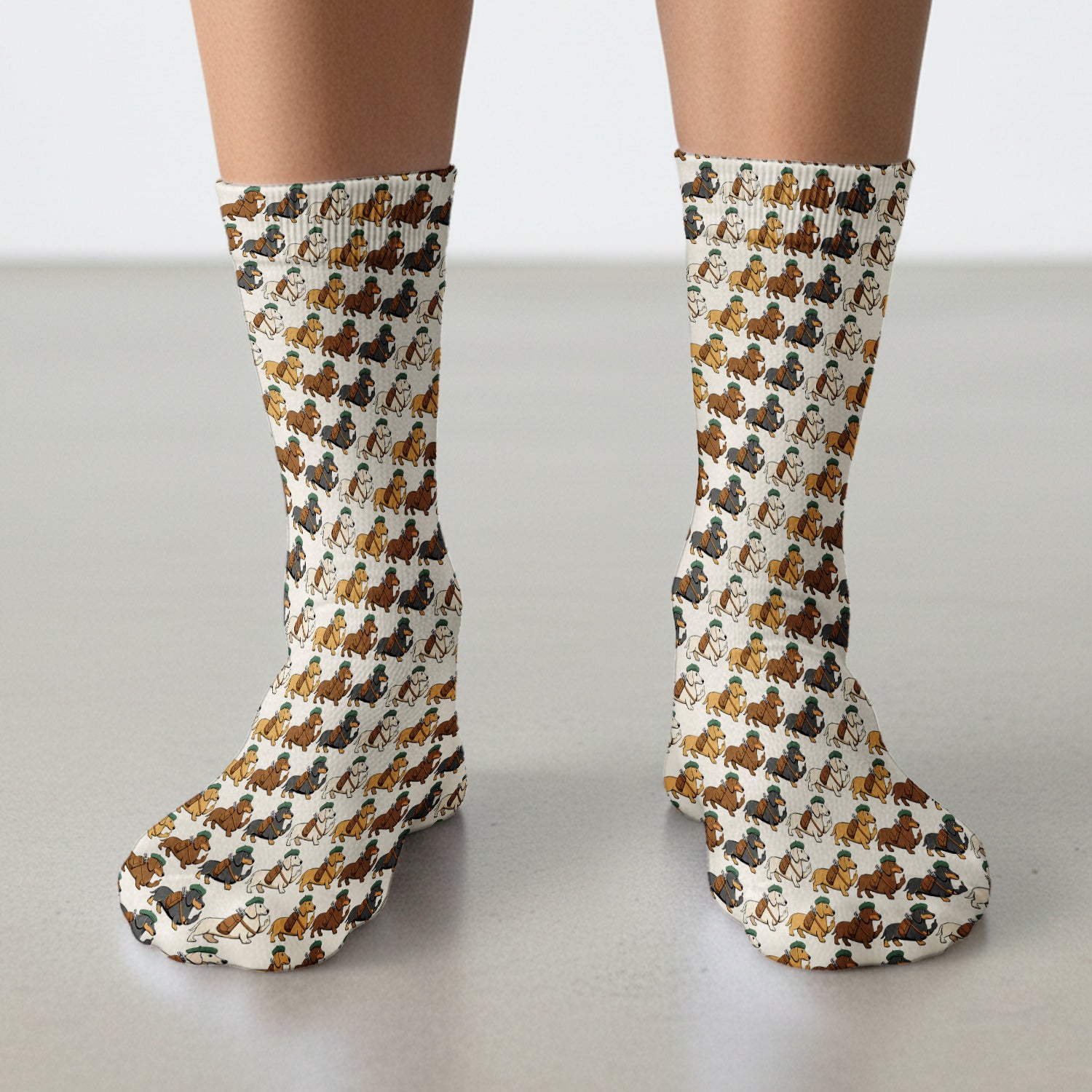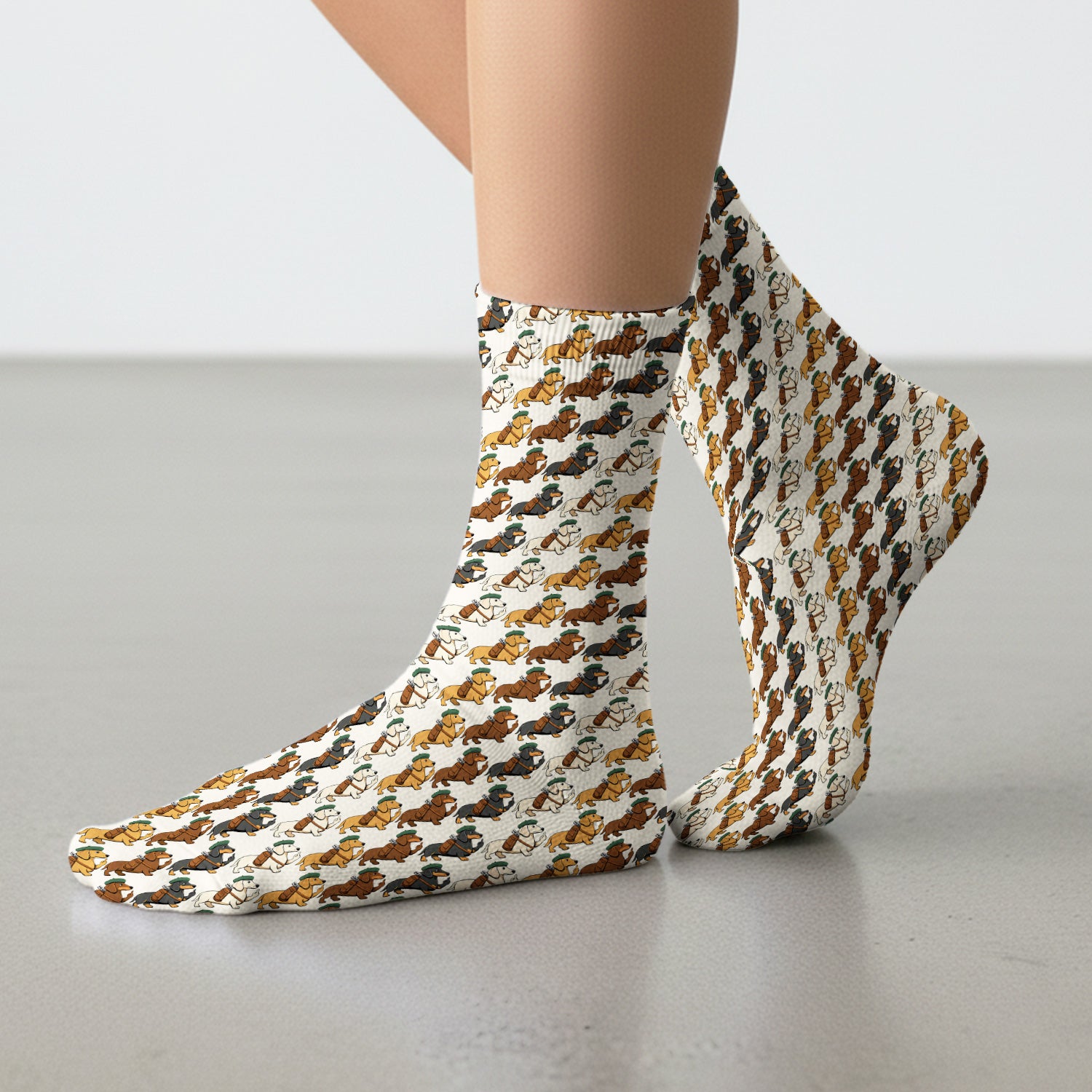 Cartoon Dachshund Dog Wearing Hat And Backpack Pattern Socks, Adult Socks for Men and Women