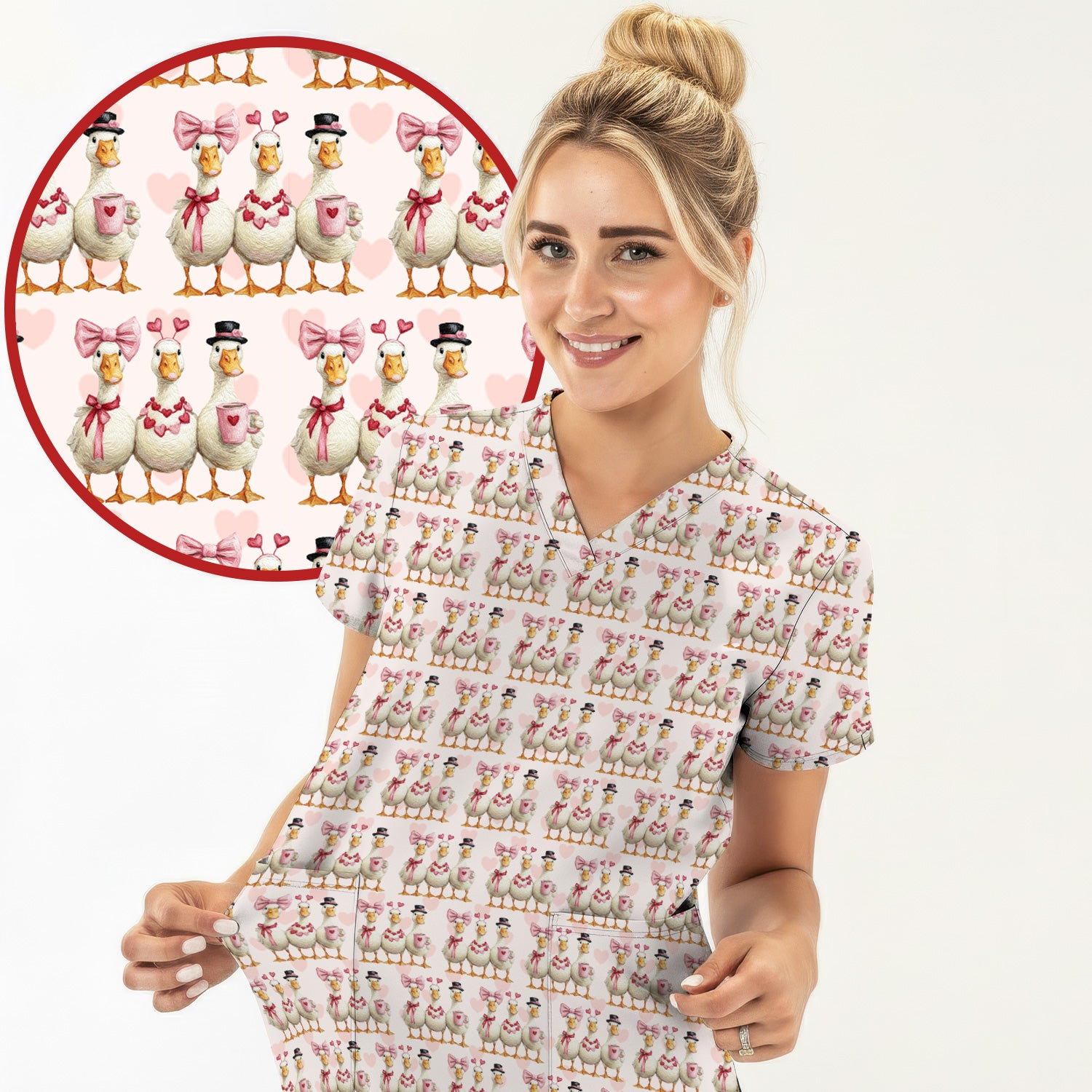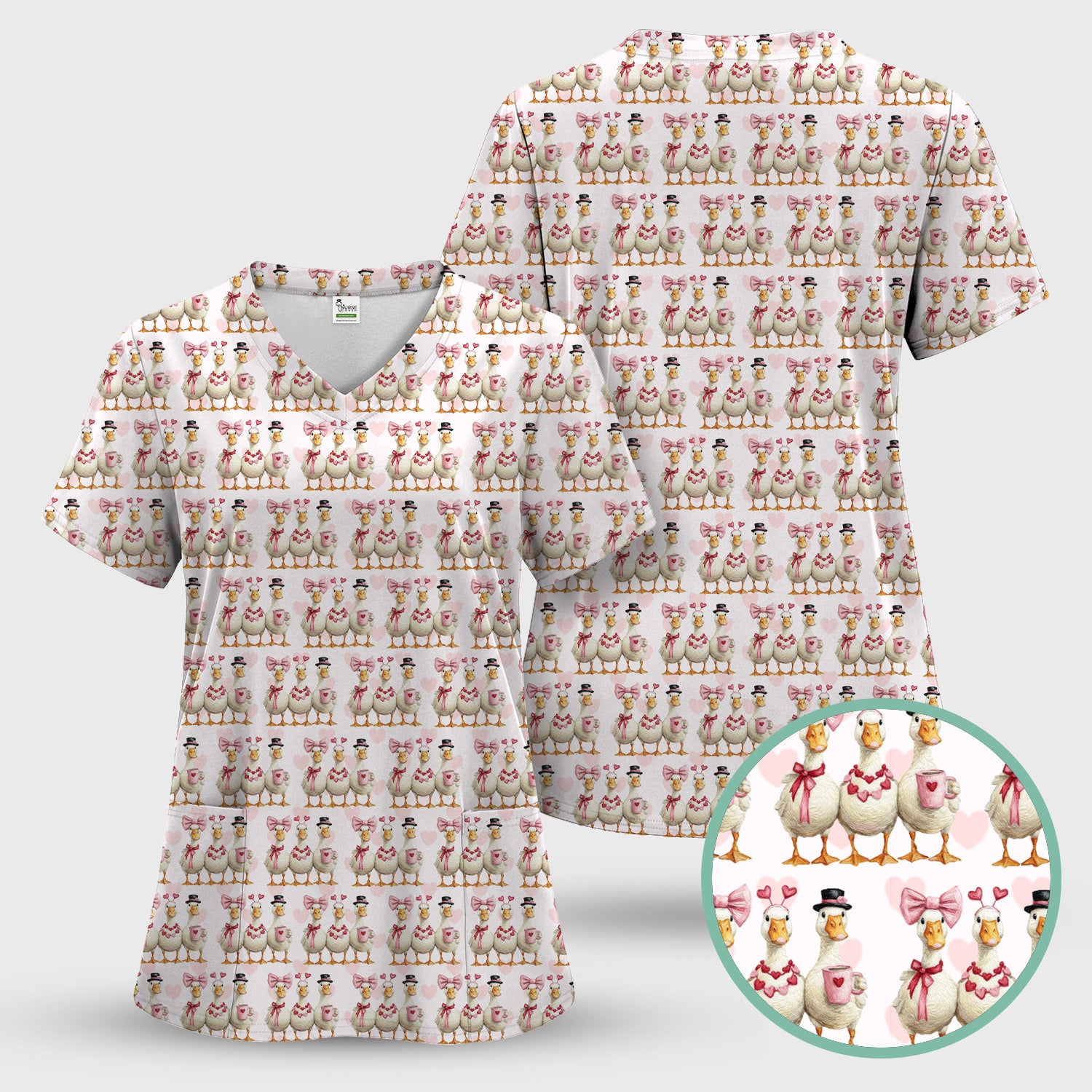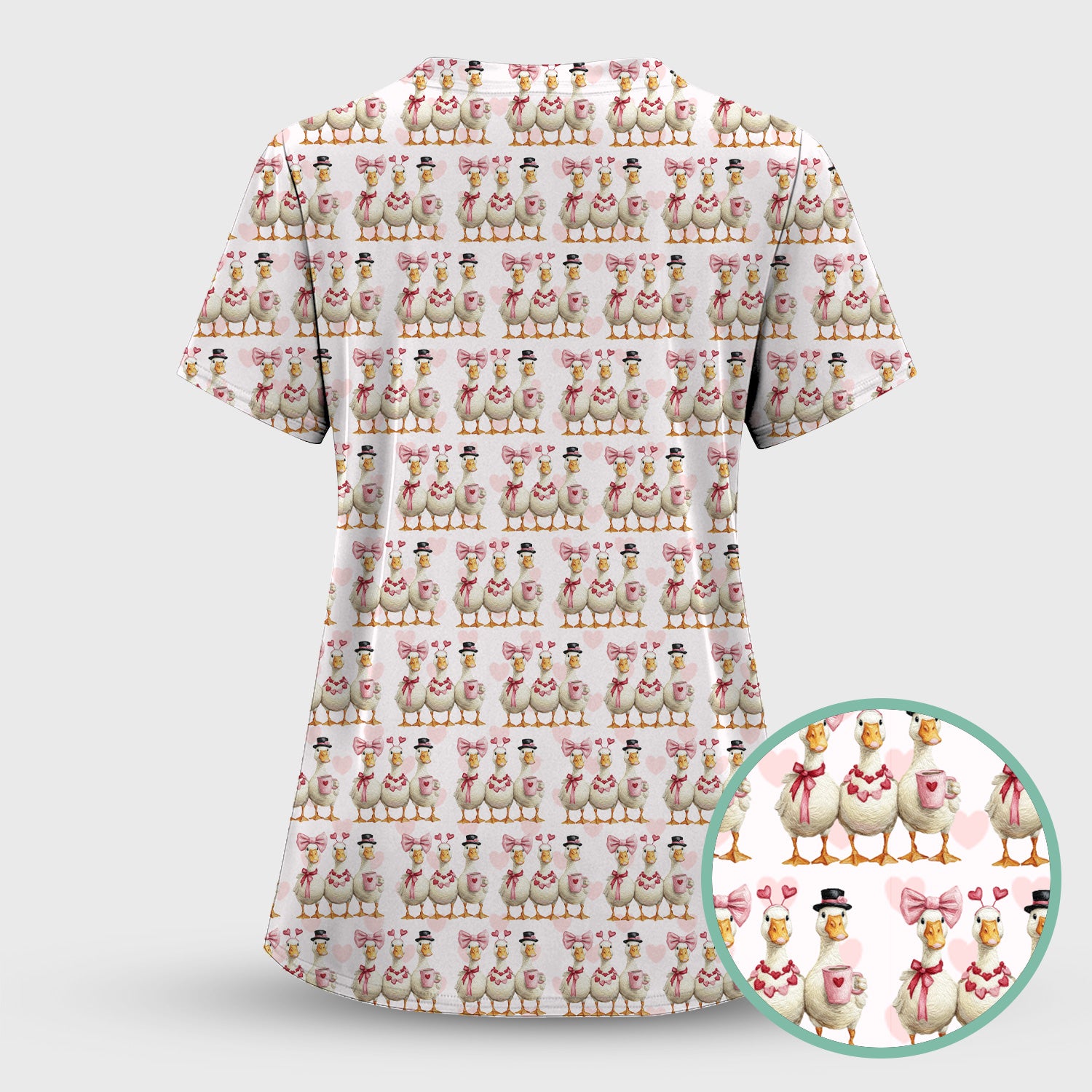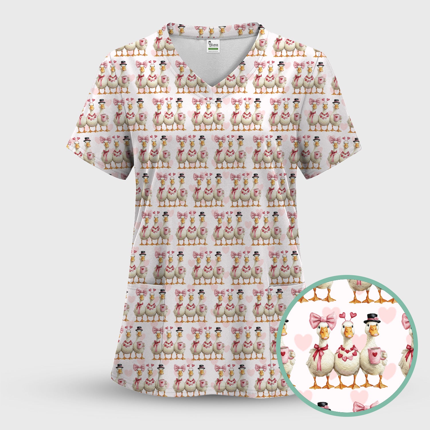 Charming Valentine Goose Heart Pink Design Scrub Top, Comfortable Scrubs for Nurses