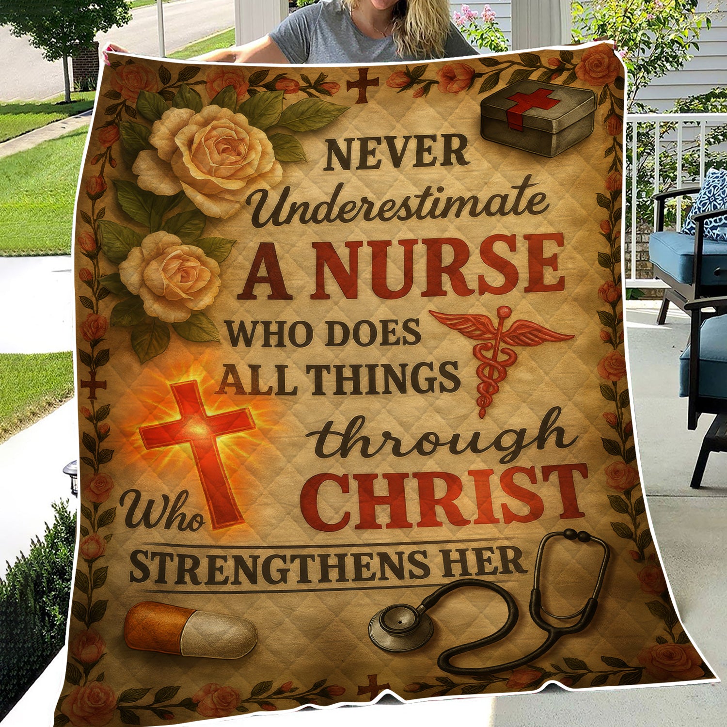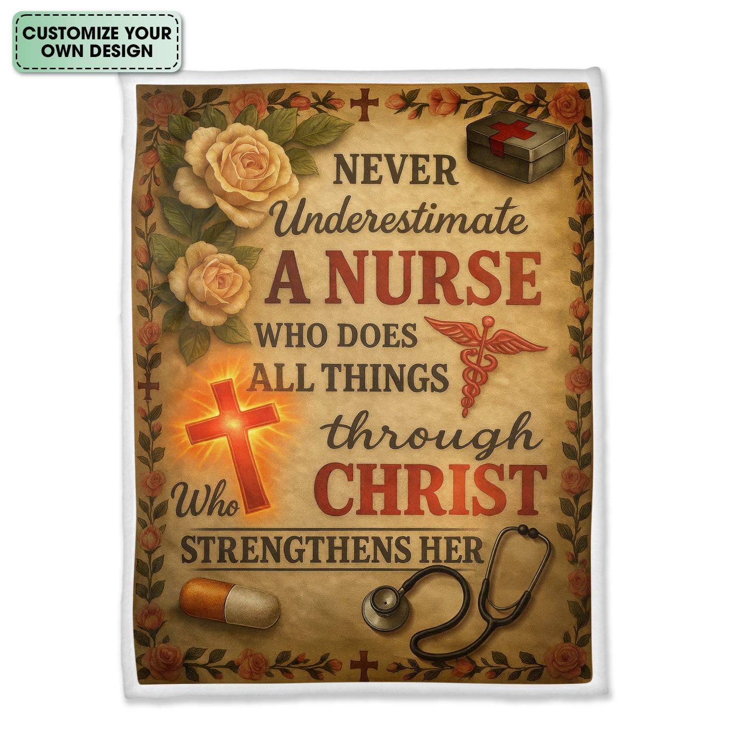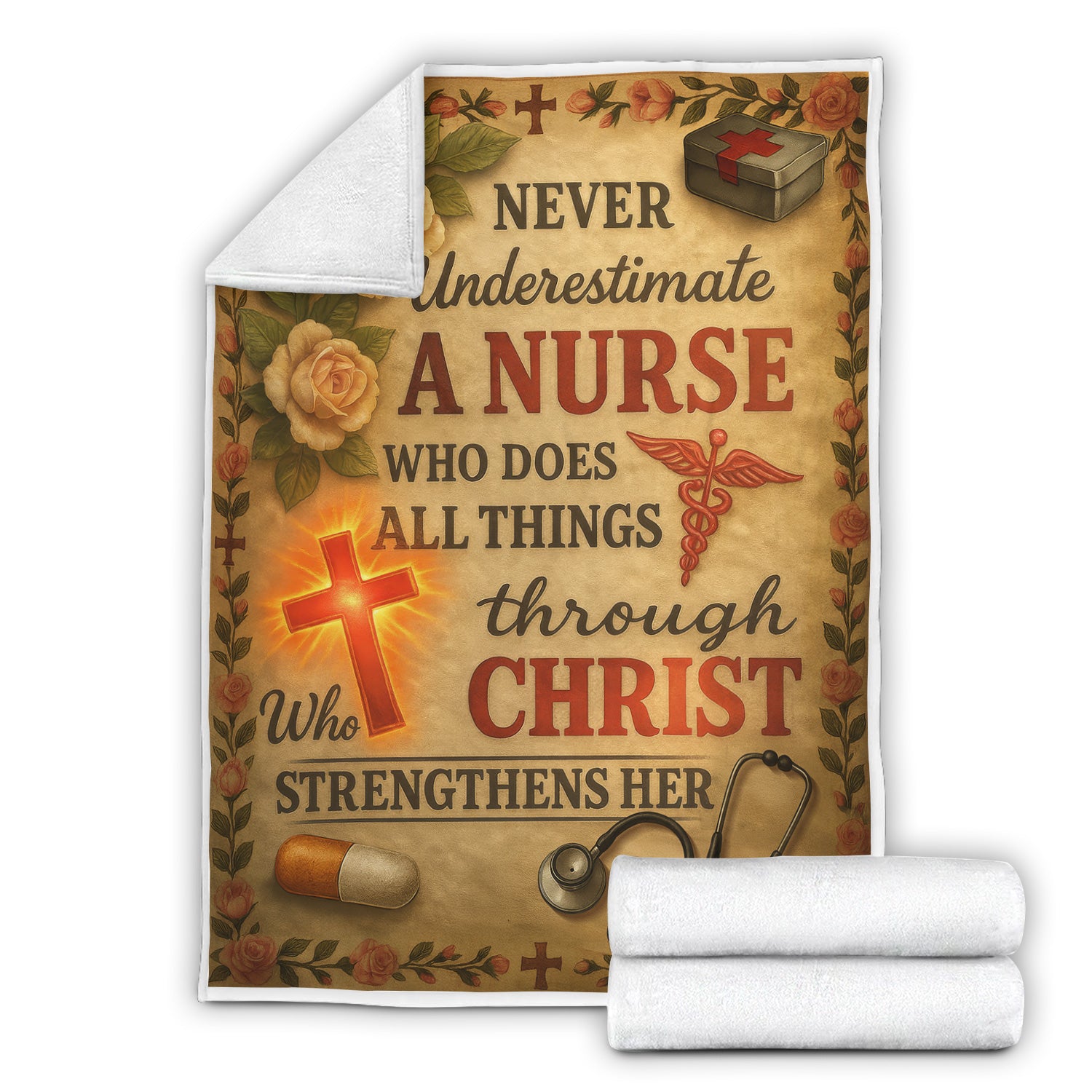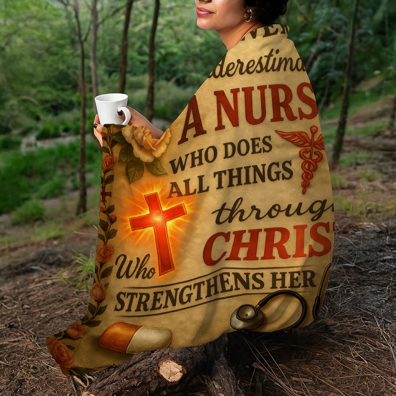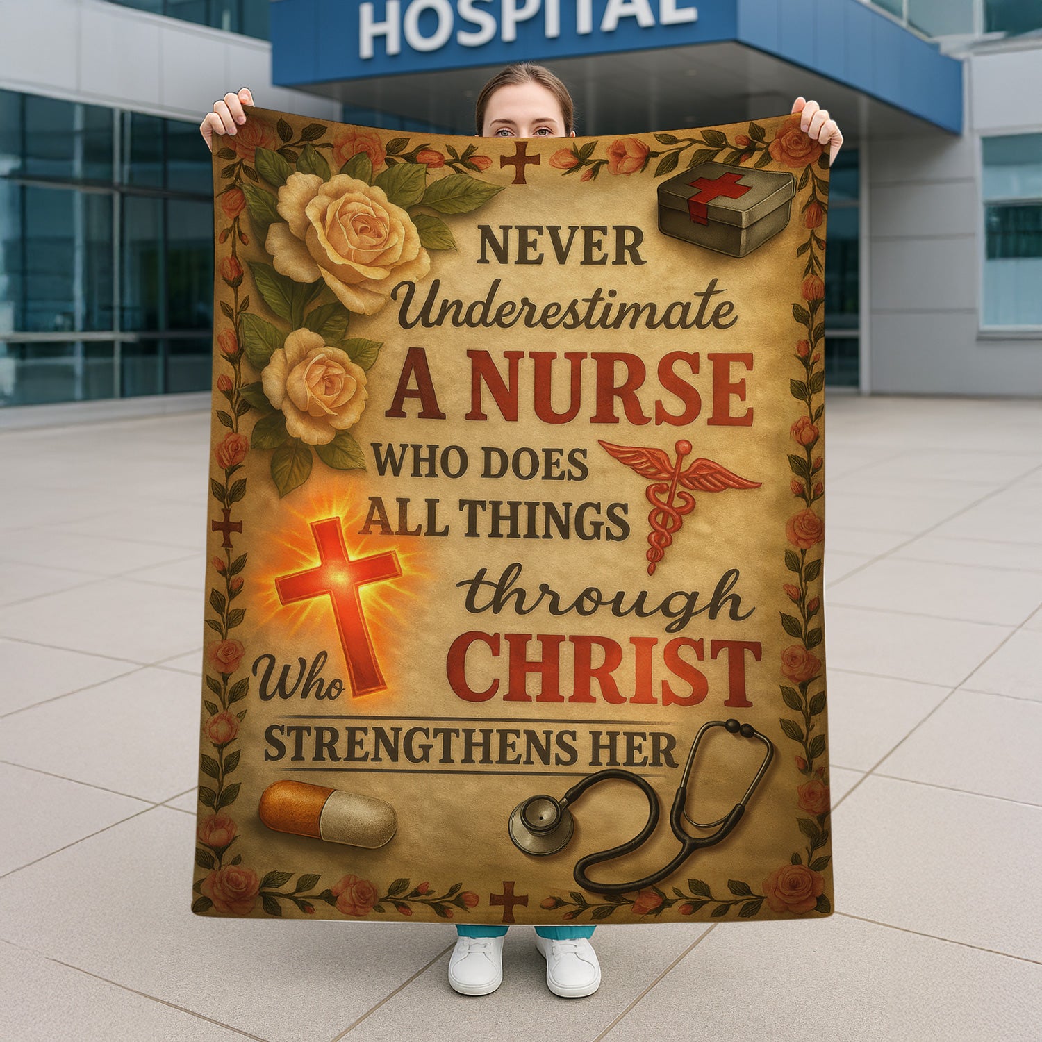 Christian Nurse Blanket - 'Through Christ Who Strengthens Her' Quote with Floral & Medical Design - Gift for RN, CNA, LPN