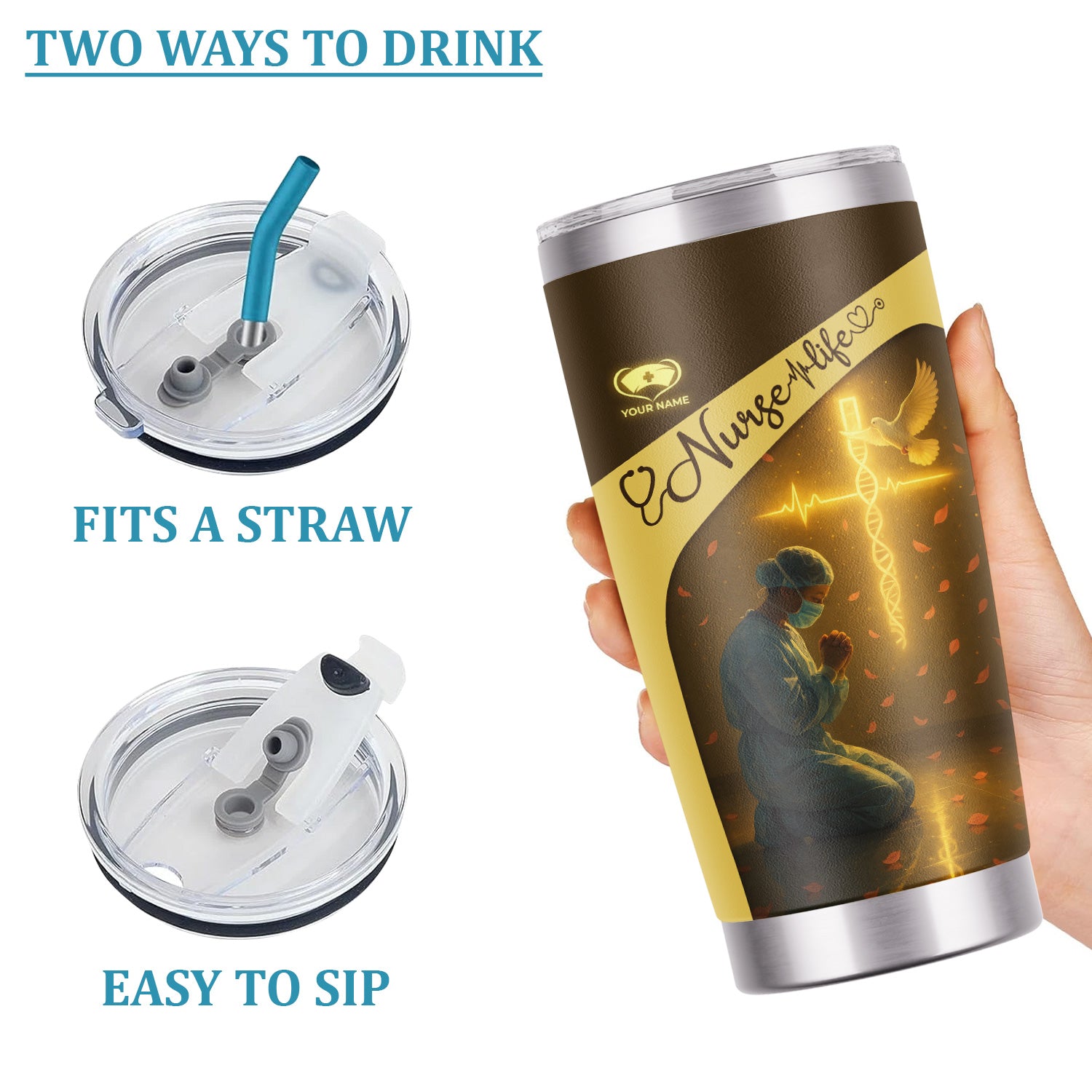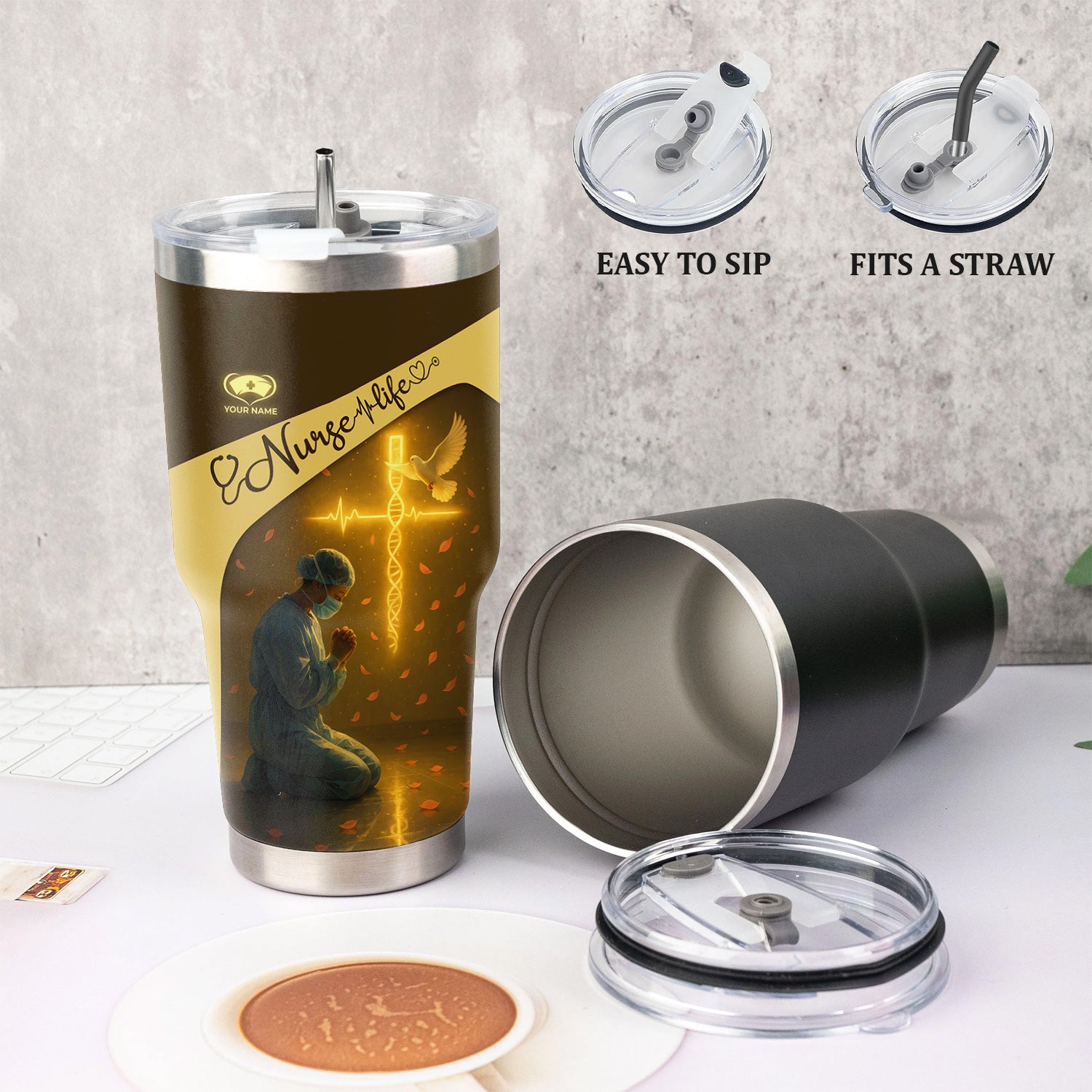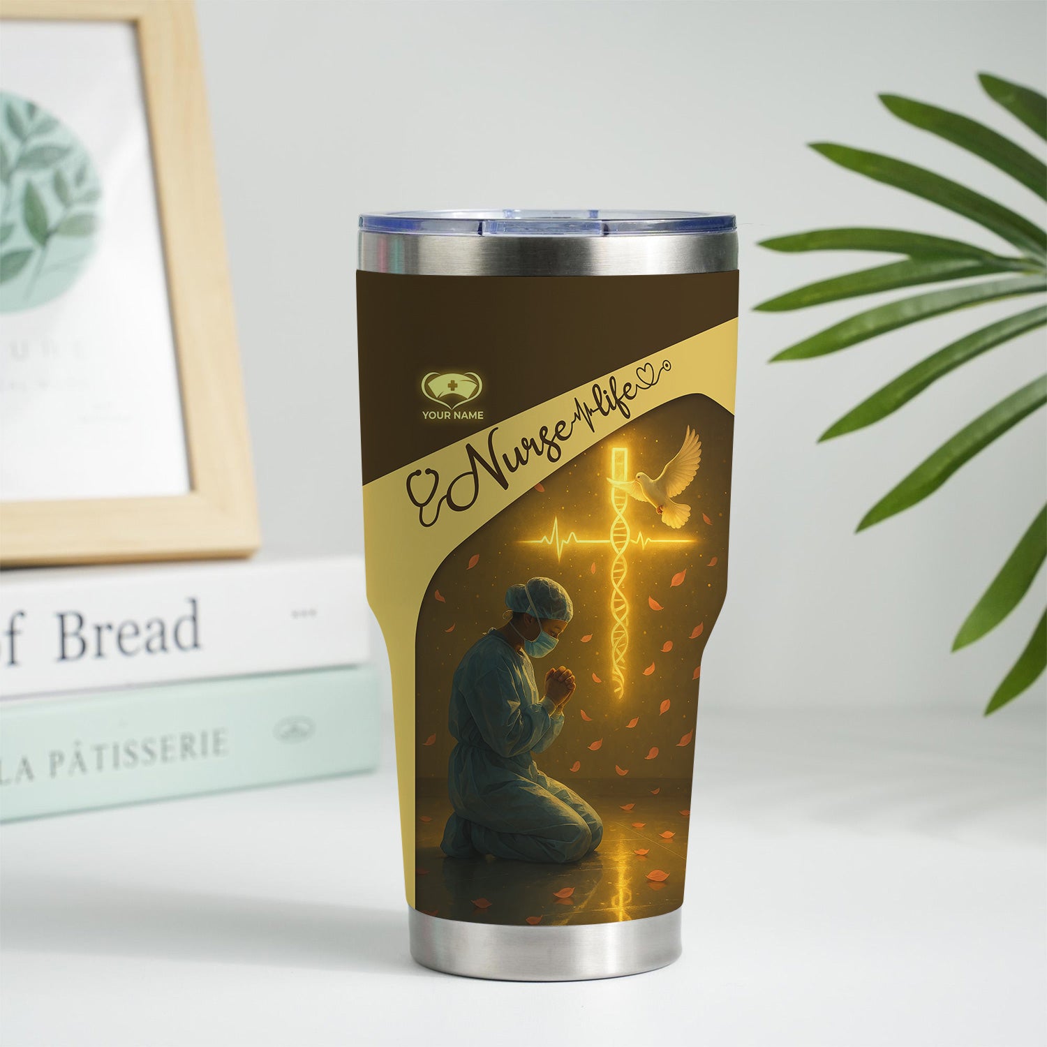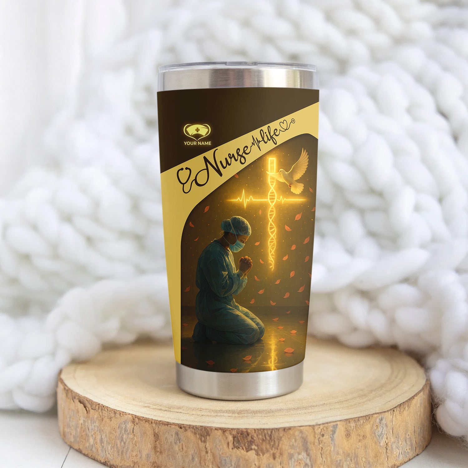 Christian Nurse Tumbler for RN LPN CNA - Personalized Prayer Design with Dove and Cross - Inspirational Gift for Women in Healthcare