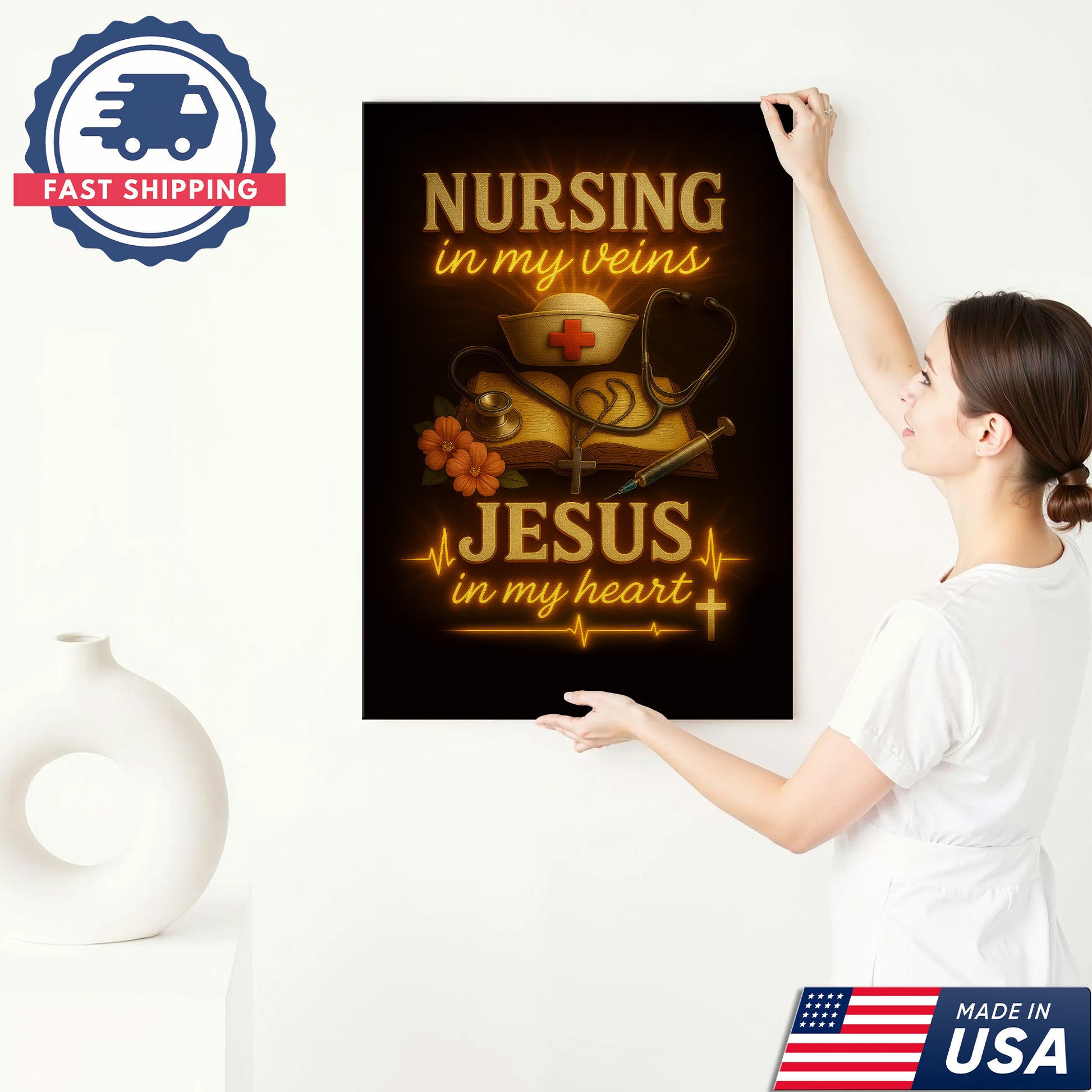 Christian Nurse Wall Art Canvas, Nursing in My Veins Jesus in My Heart, Gift for RN CNA LPN Women