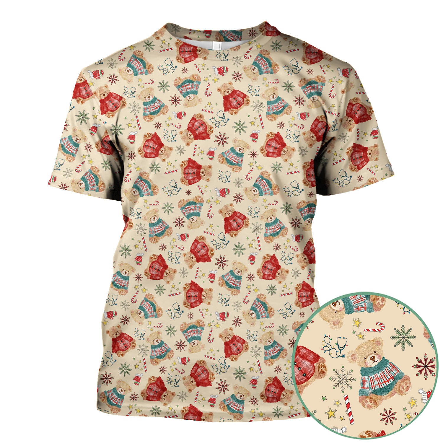 Christmas Bear Scrub Top - Cute Holiday Teddy Print Scrubs for Nurses - Funny Xmas Medical Scrub Shirt Gift for Women CNA RN