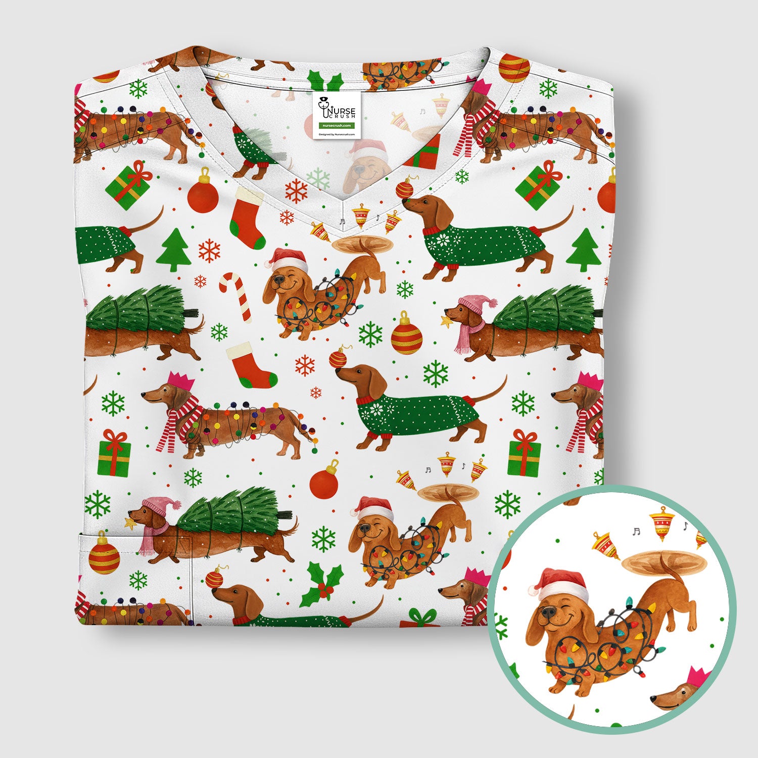 Christmas Dachshund Scrub Top - Funny Dog Scrub Shirt Multi Color - Holiday Medical Scrubs Gift for Nurse, CNA, RN, Doctor, Vet