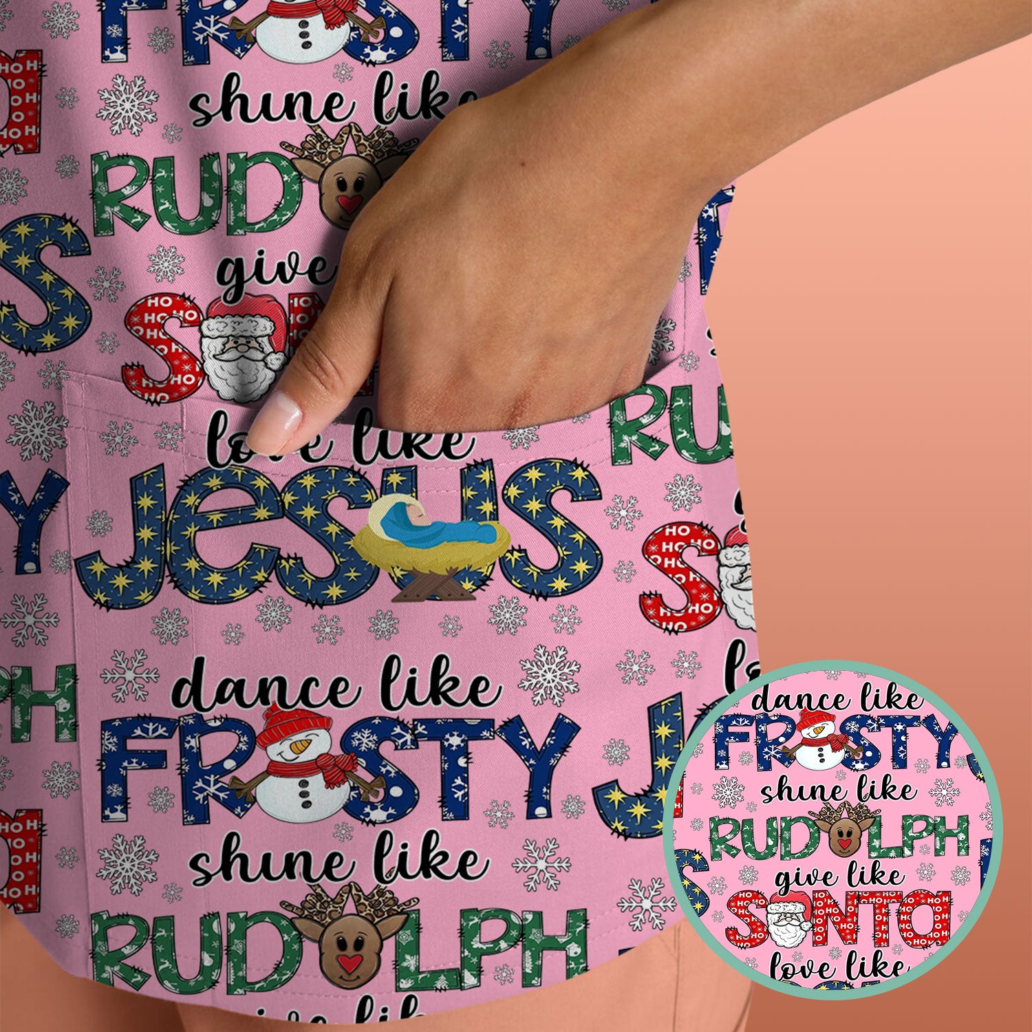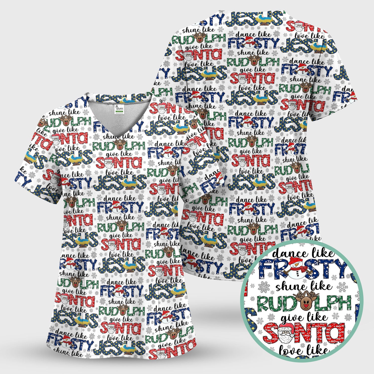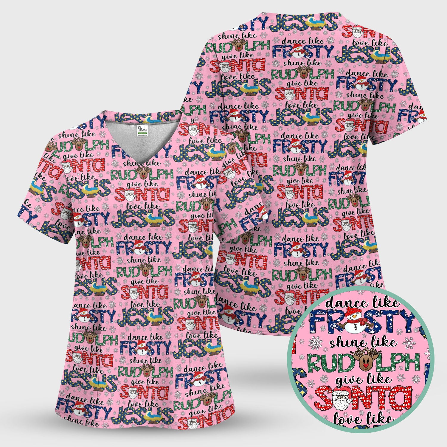 Christmas Rudolph Nurse Scrub Top for Women - Dance Like Frosty Shine Like Rudolph Give Like Santa Love Like Jesus - Holiday Med Shirt