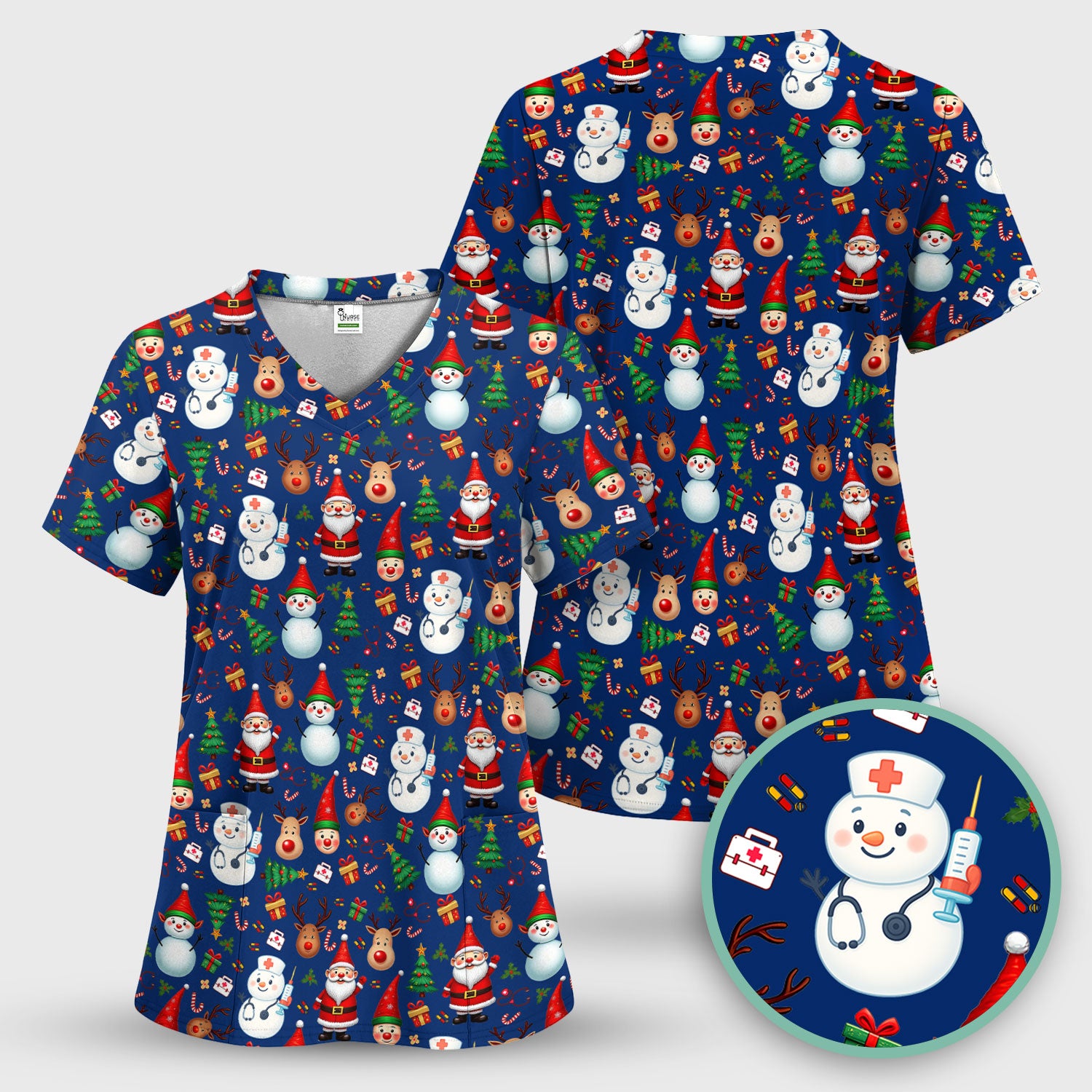 Christmas Scrub Top for Nurses - Cute Snowman Reindeer Santa Pattern - Holiday Medical Uniform RN CNA LPN Gift