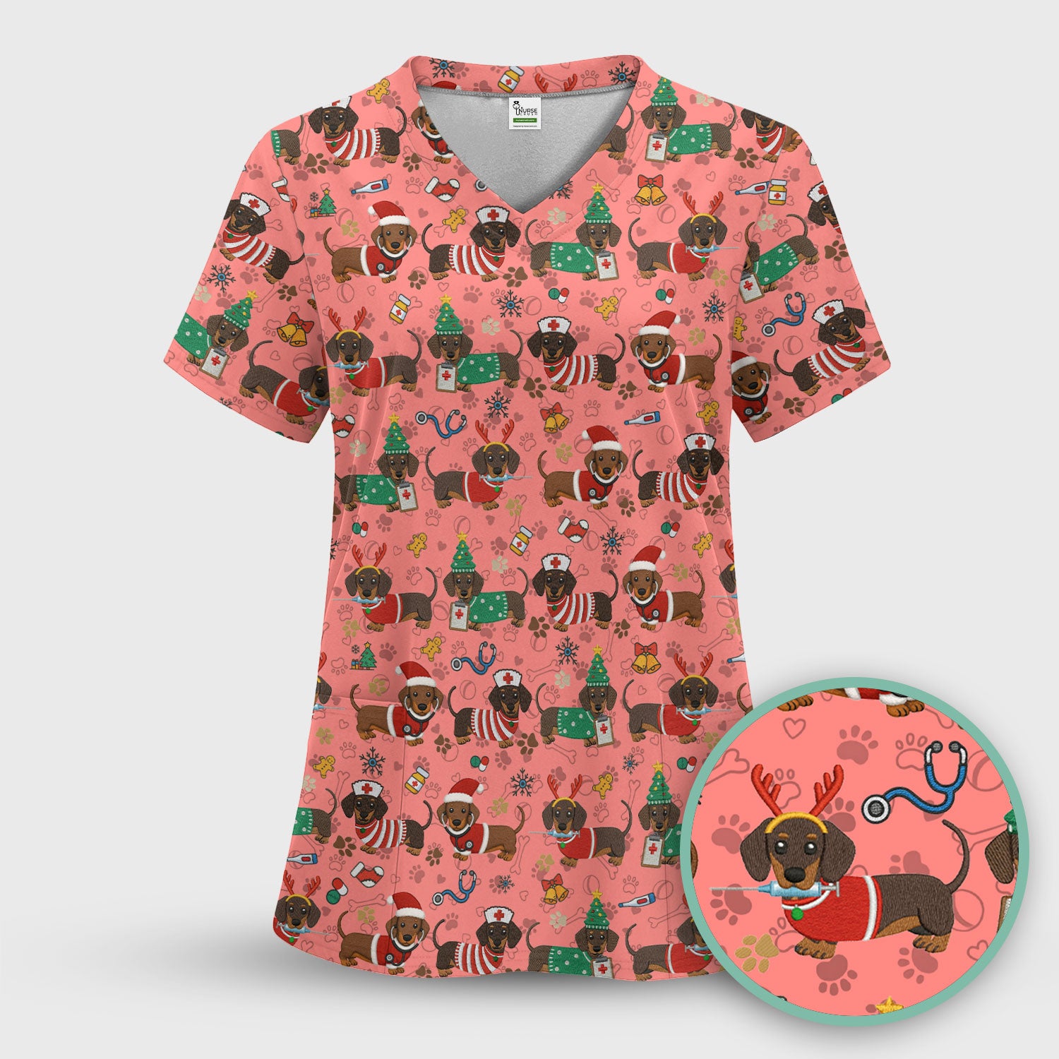 Christmas Wiener Dog Scrub Top for Nurses - Cute Dachshund Medical Shirt - Fun Holiday Scrubs Gift for Women RN CNA LPN