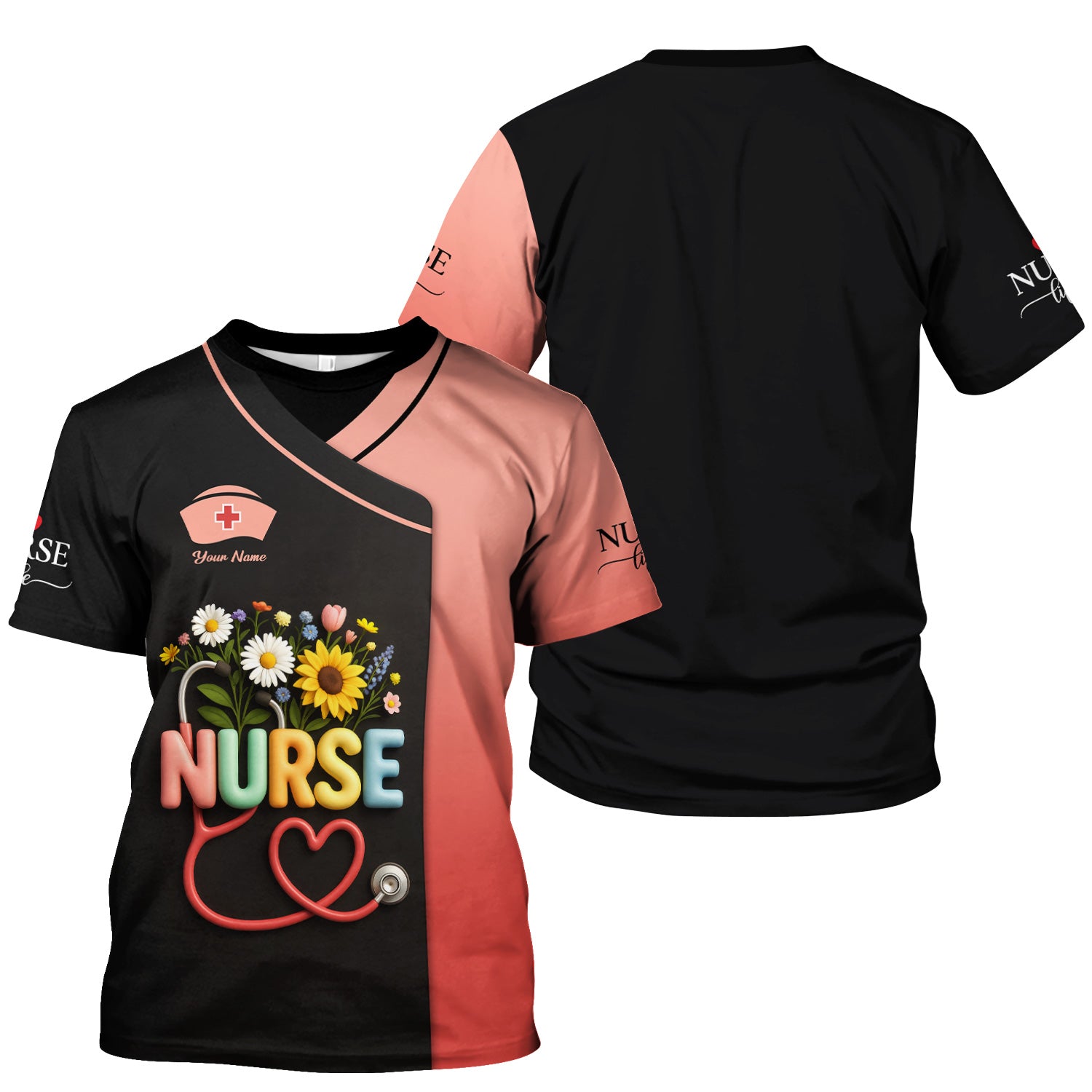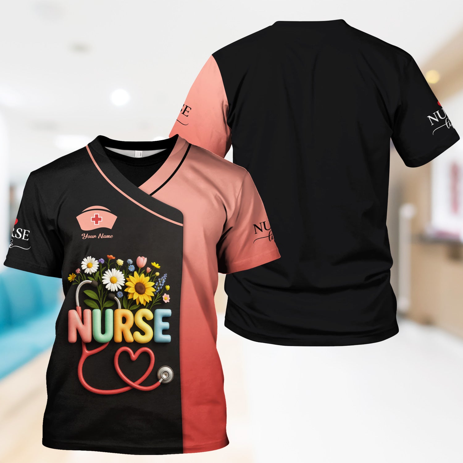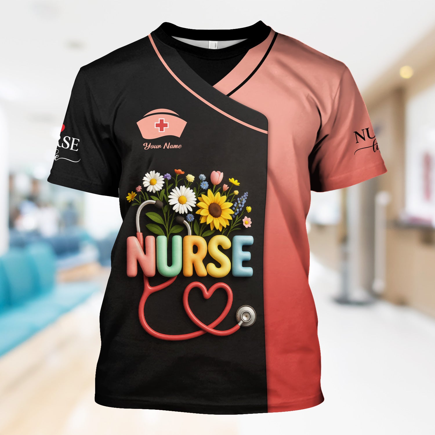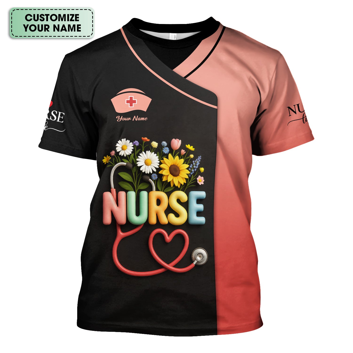 Colorful Floral Nurse Shirt - Personalized Scrub-Style Tee with Heart Stethoscope & Daisies - Gift for RN CNA LPN