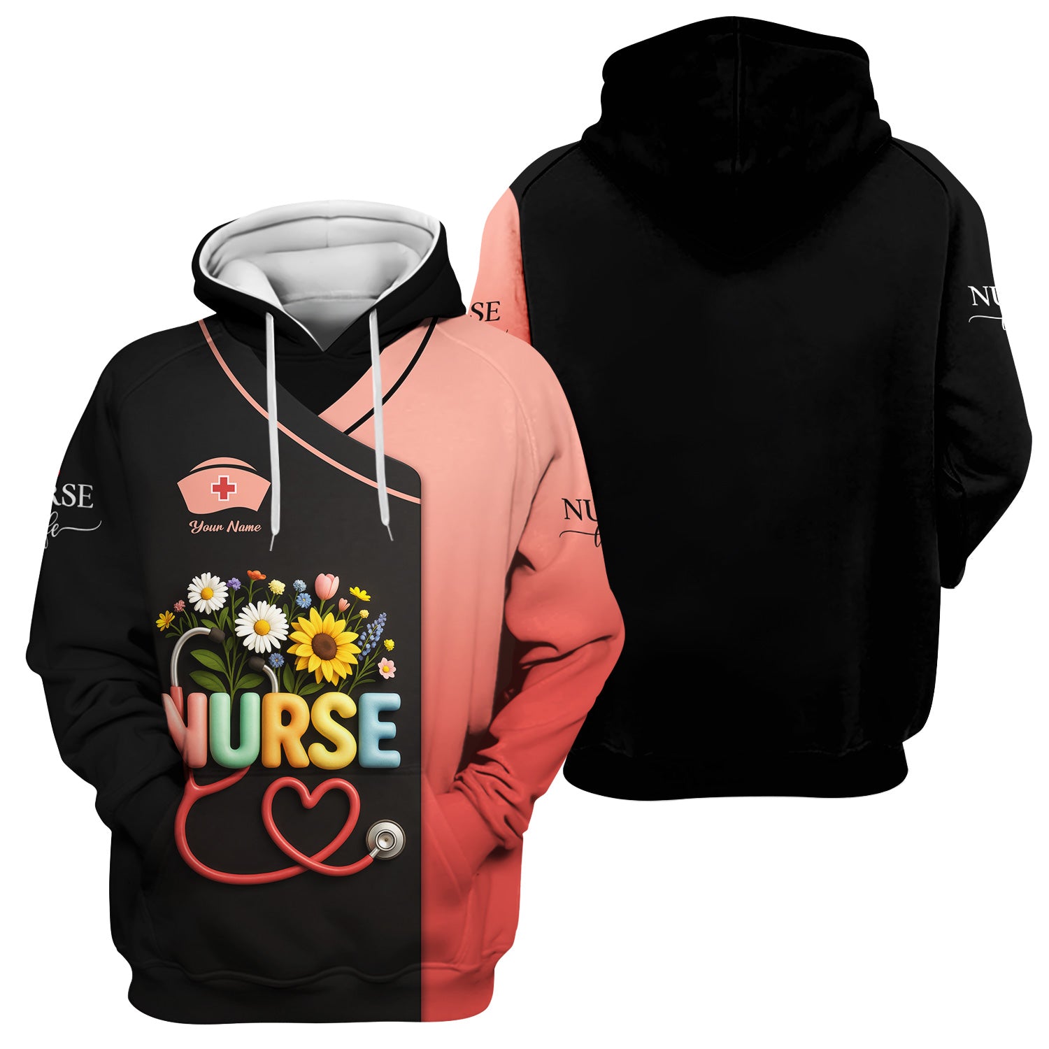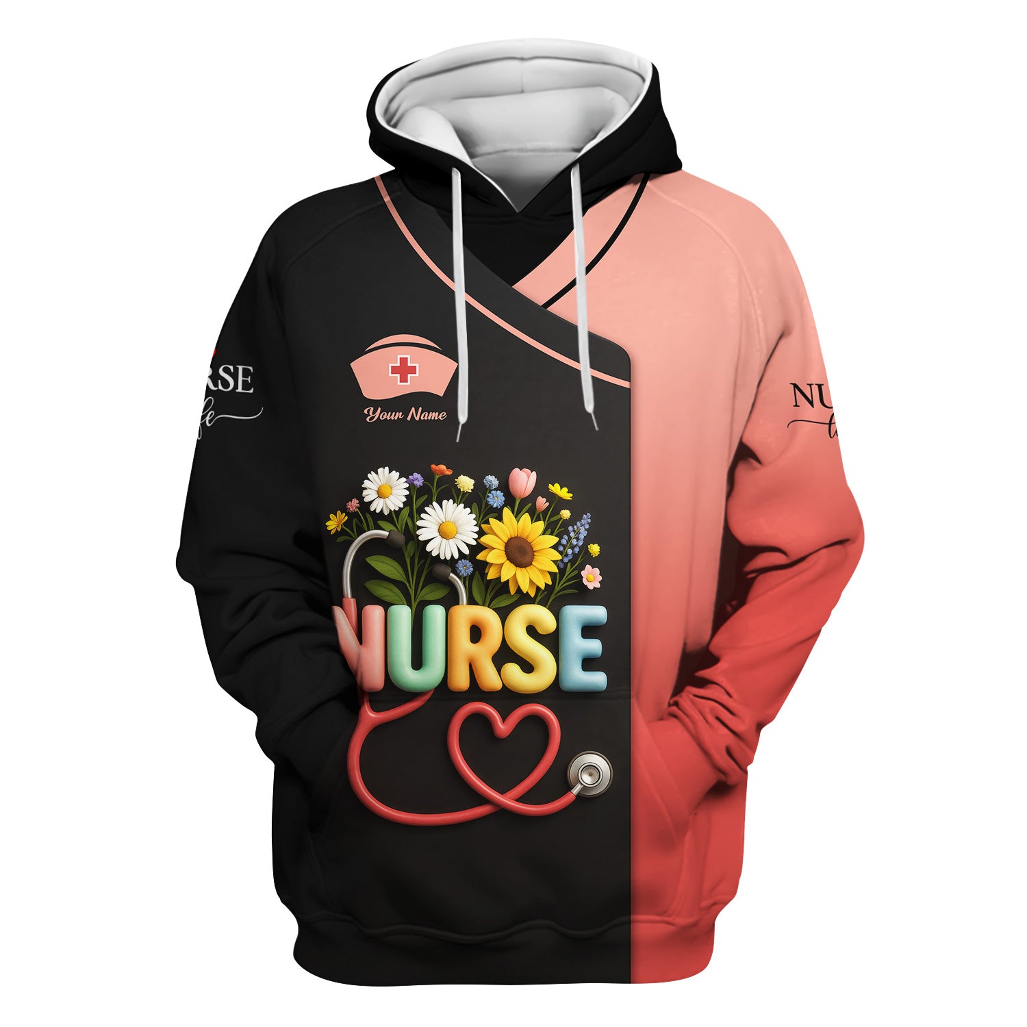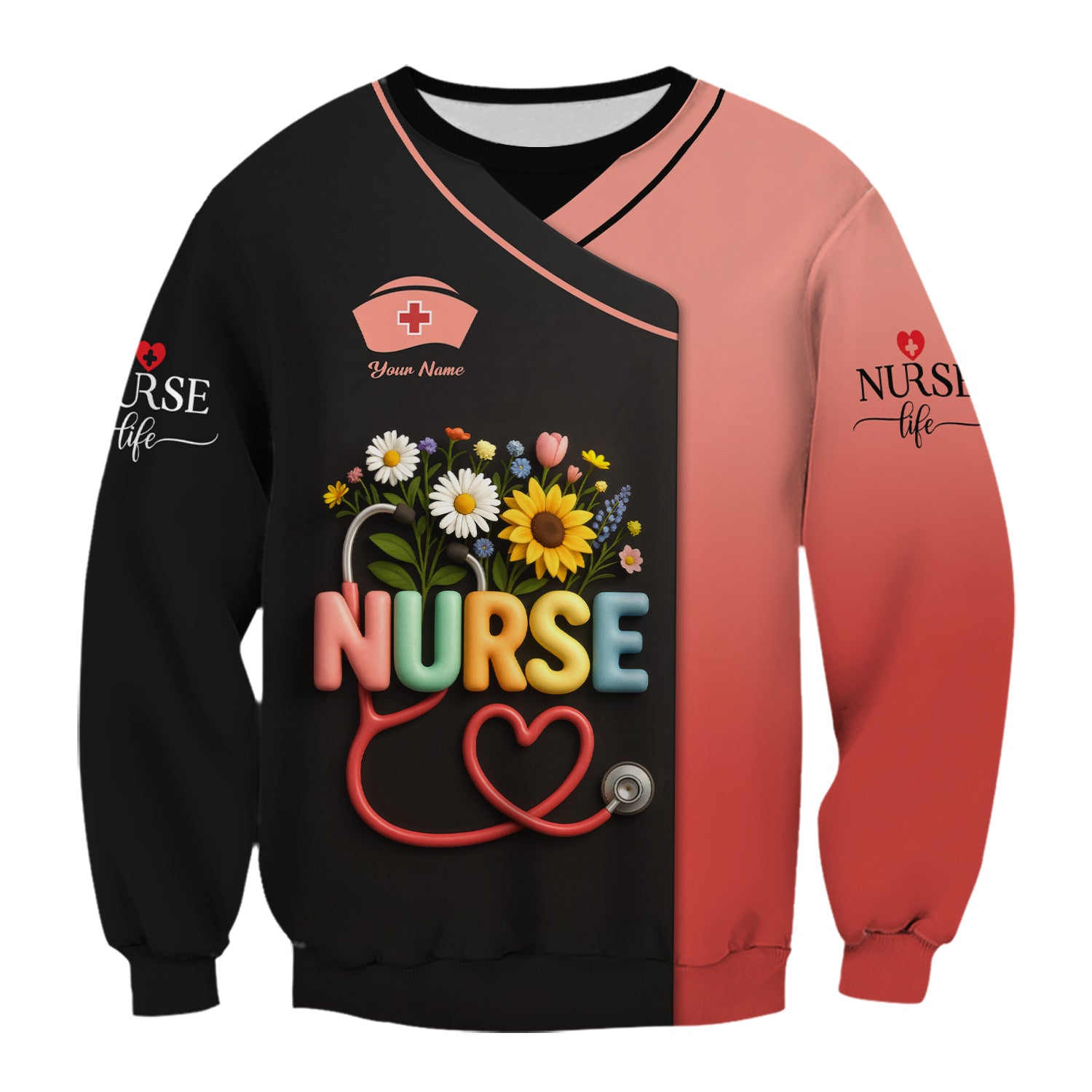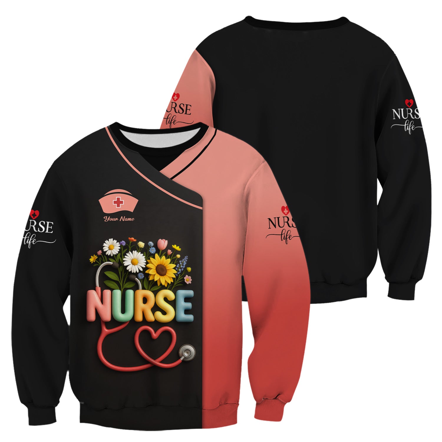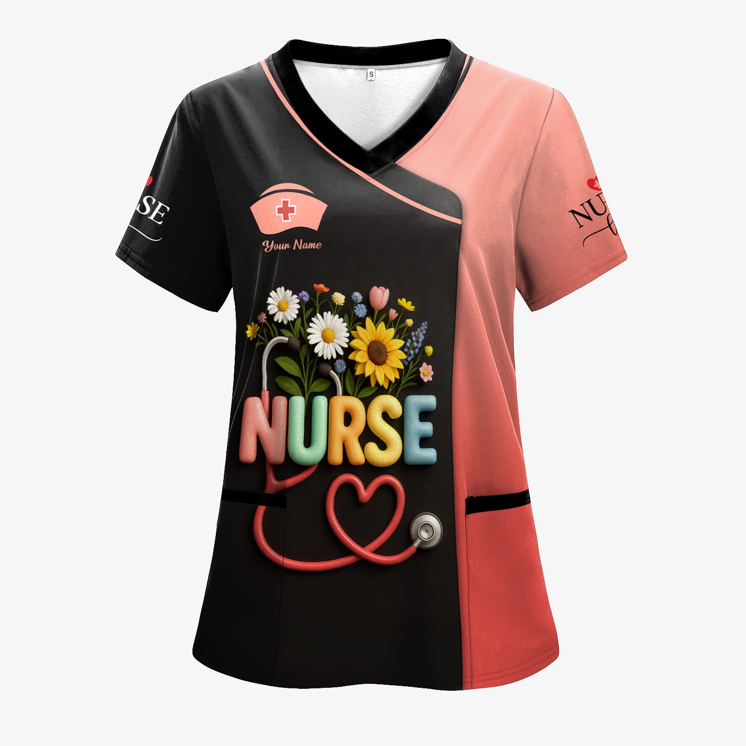 Colorful Floral Nurse Shirt - Personalized Scrub-Style Tee with Heart Stethoscope & Daisies - Gift for RN CNA LPN