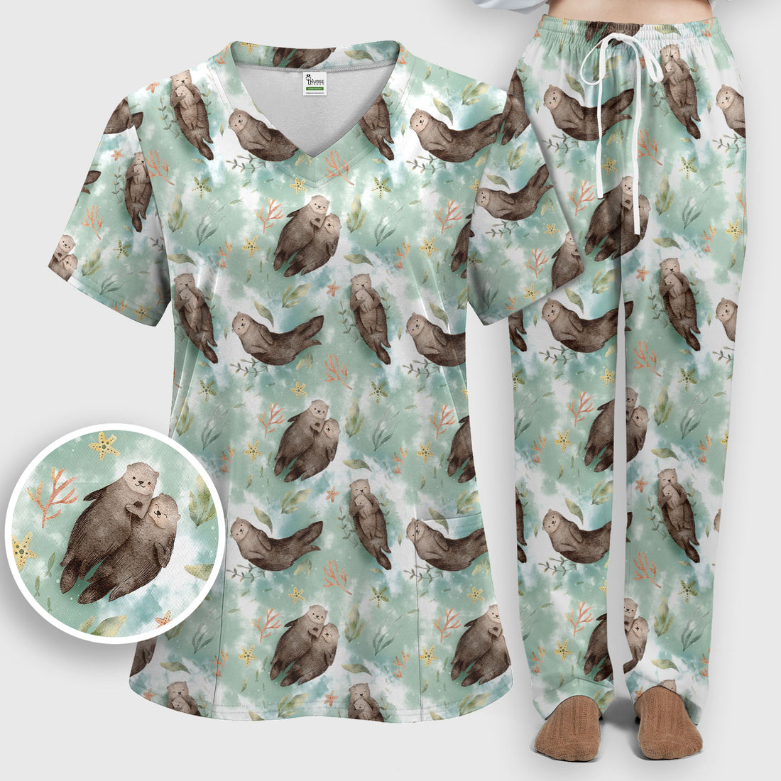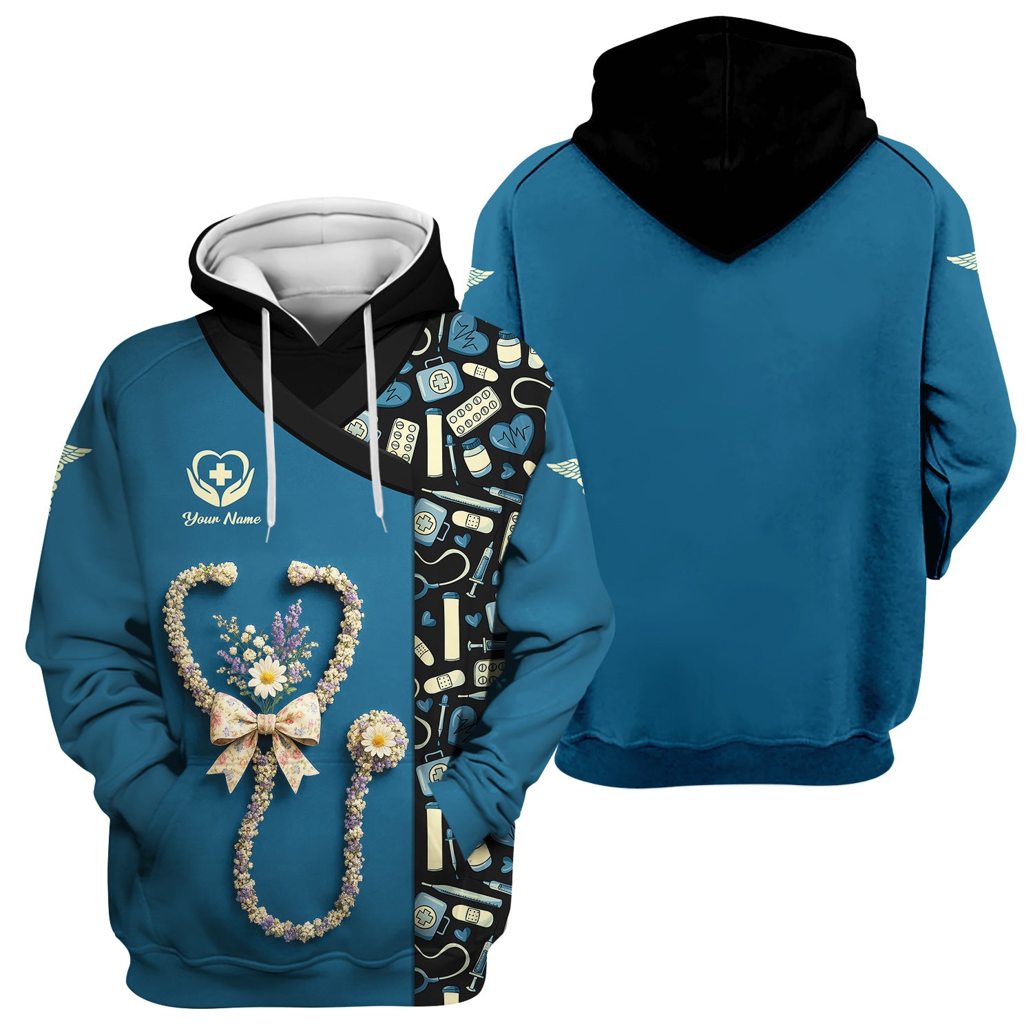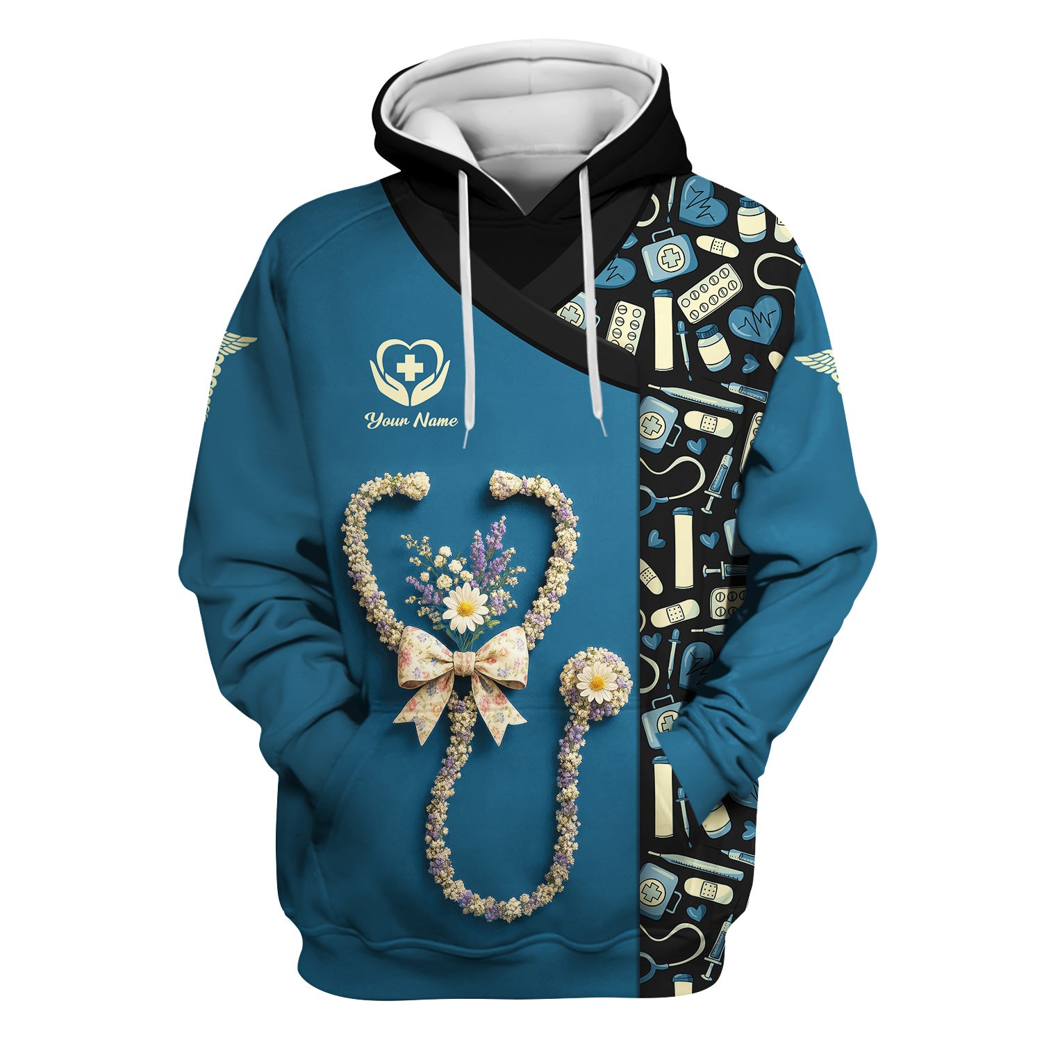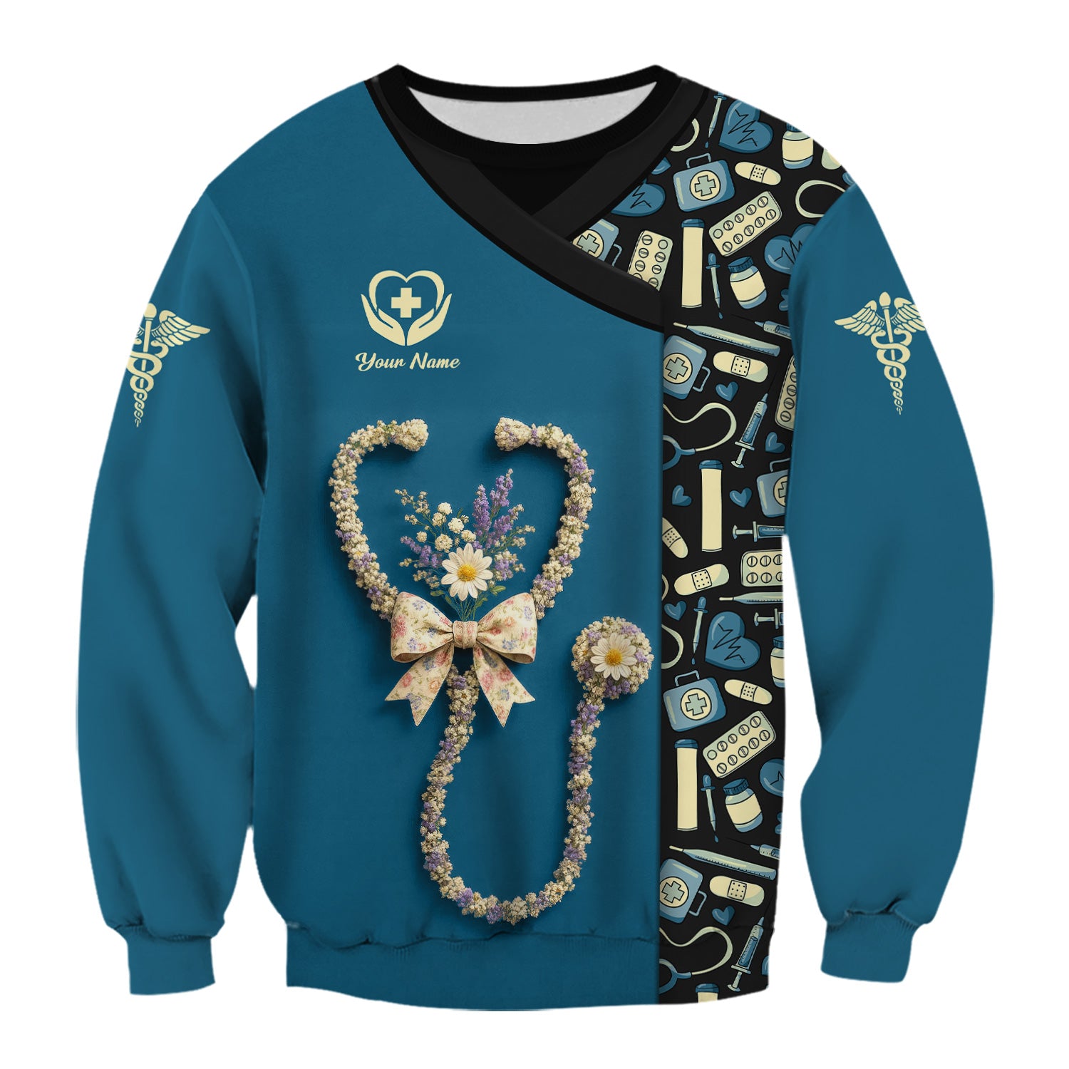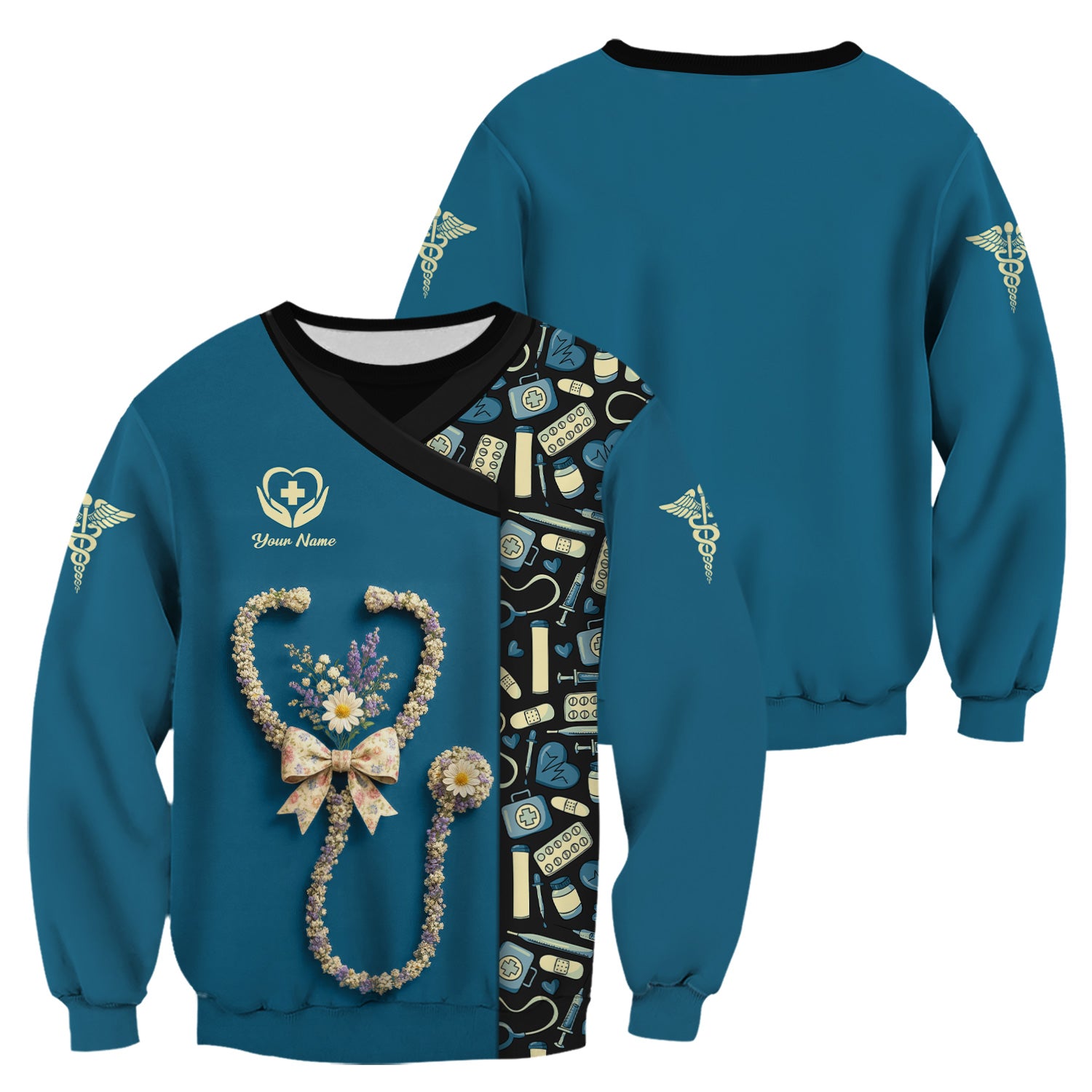Colorful Nurse Scrubs for Women RN CNA LPN - Inspirational Floral Stethoscope Top with Heart Design - Gift for Healthcare Workers with Custom Name