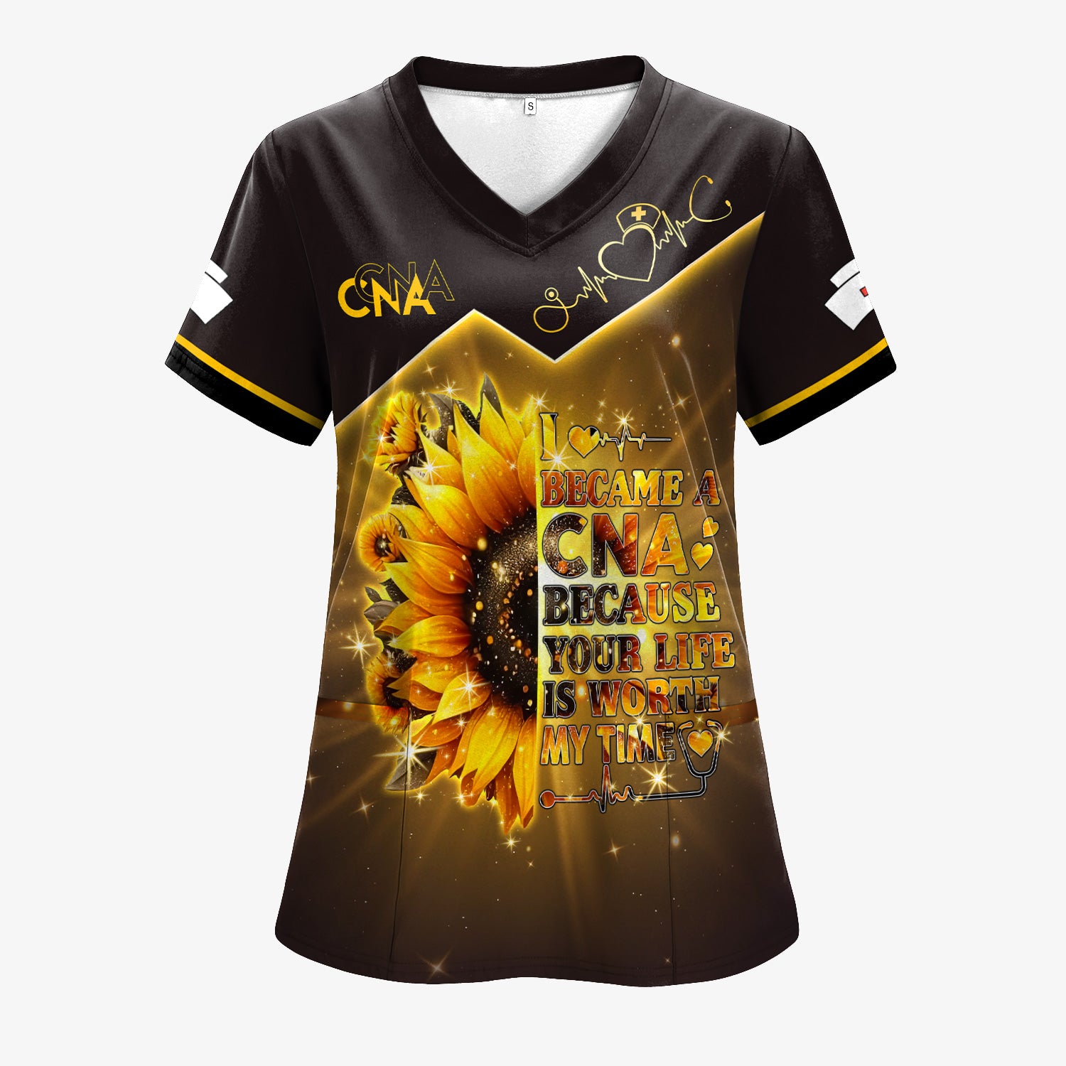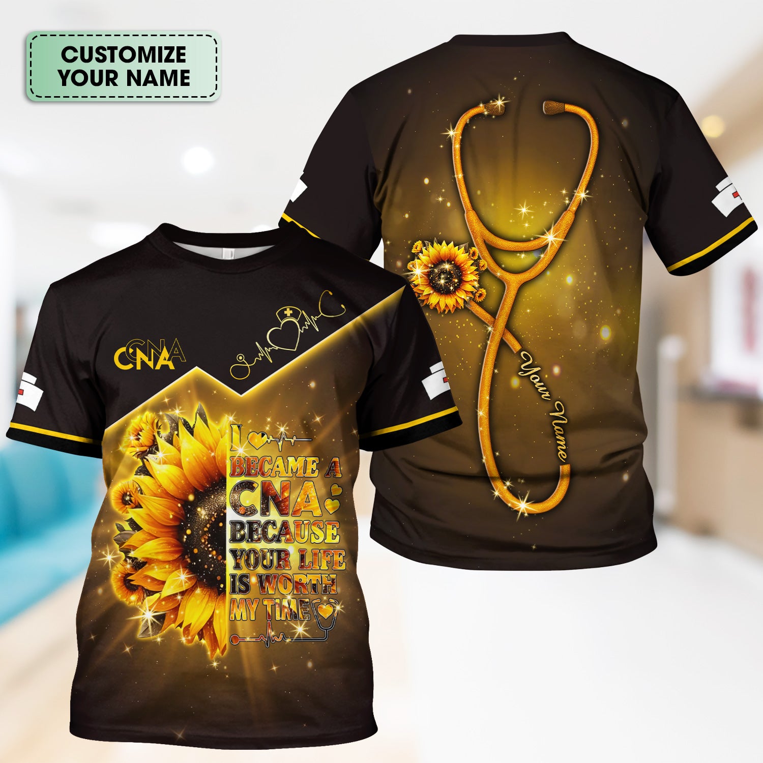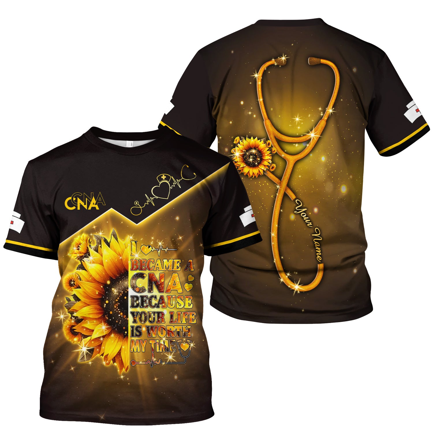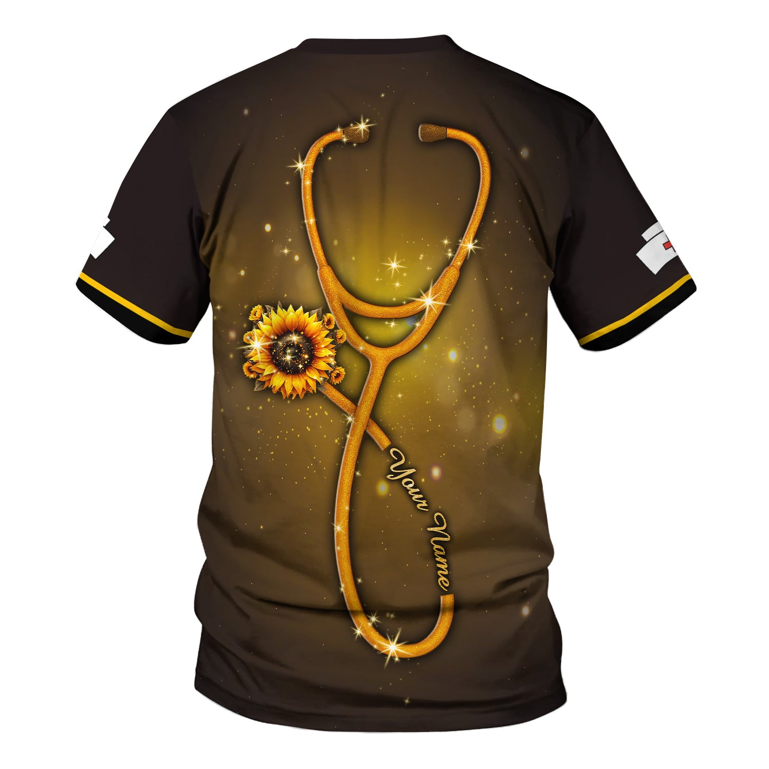 Custom Inspirational CNA T-Shirt - Golden Sunflower & Stethoscope Graphic Tee - Gift for RN LPN Healthcare Workers