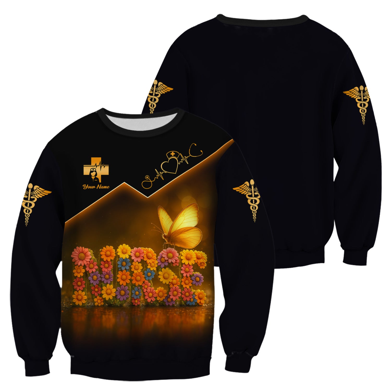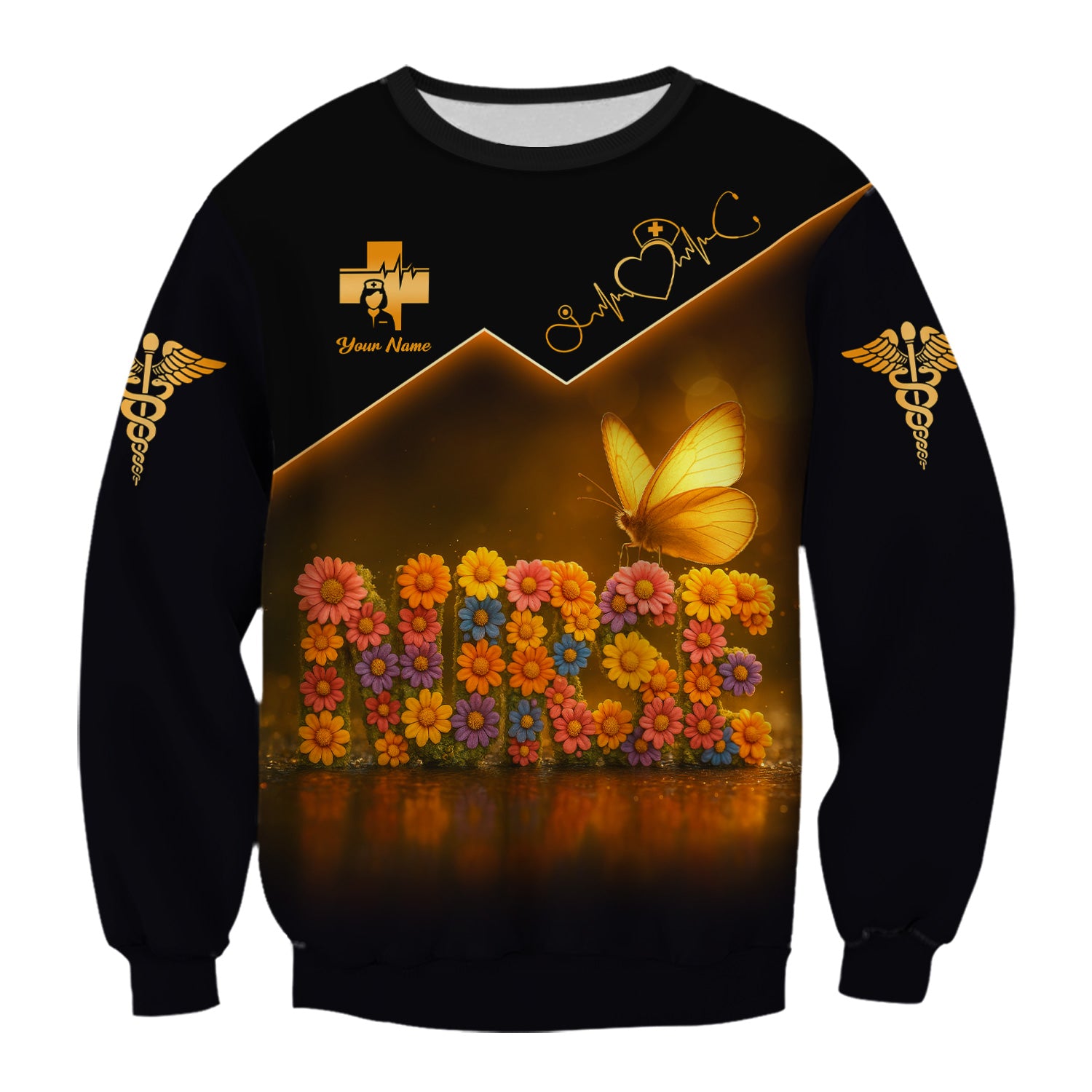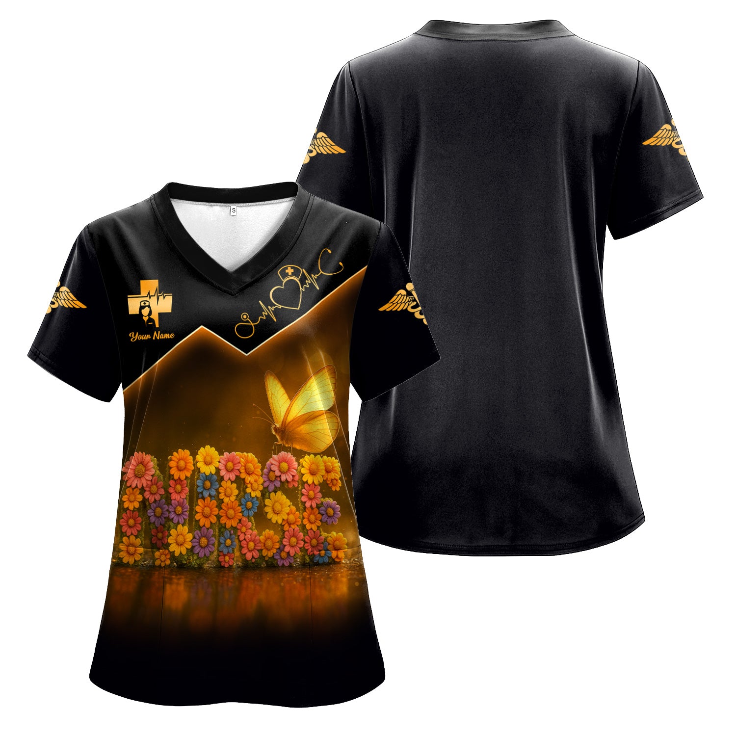 Custom Name Nurse Scrub Top for Women - Floral Butterfly Design with Golden Accents - Medical Uniform Gift for RN LPN CNA