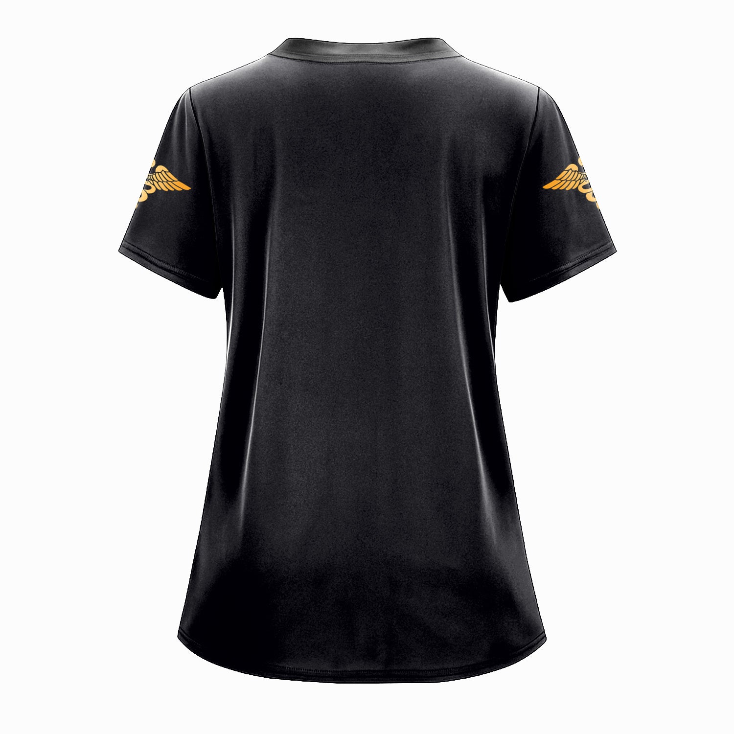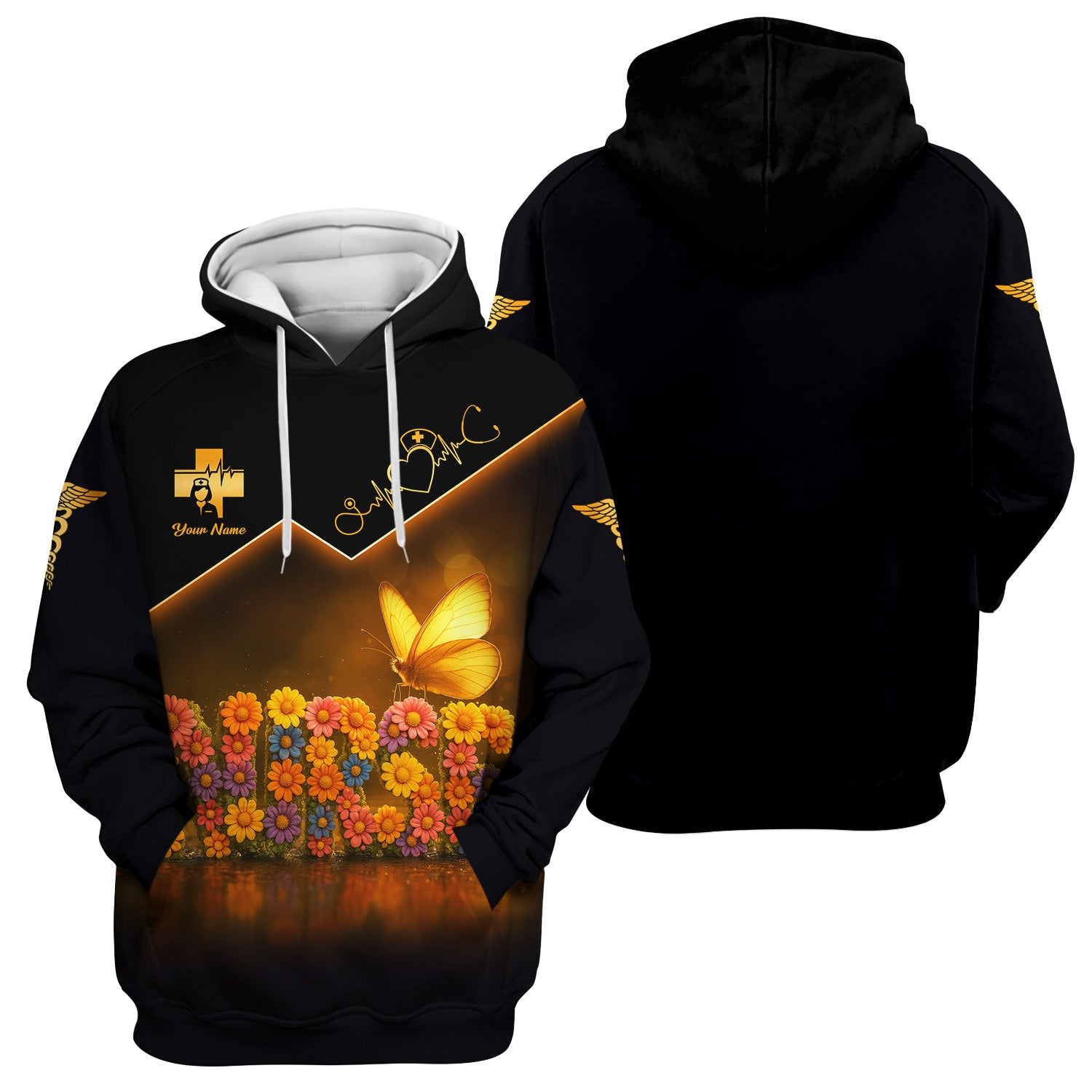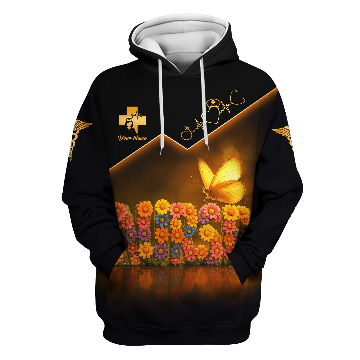 Custom Name Nurse Scrub Top for Women - Floral Butterfly Design with Golden Accents - Medical Uniform Gift for RN LPN CNA