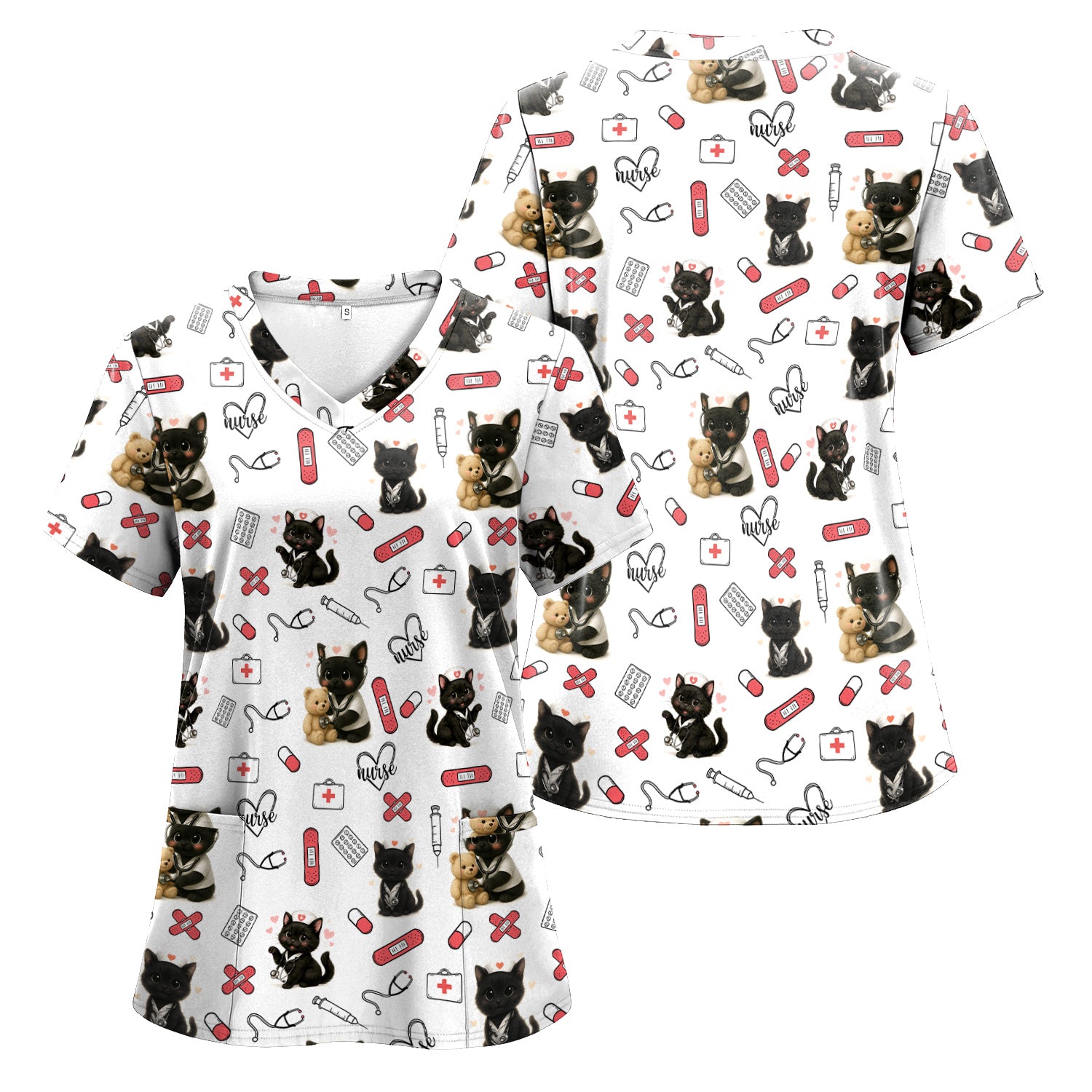 Cute Black Cat Nurse Scrub Top for RN CNA LPN - Funny Kitty Medical Pattern Uniform - Gift for Cat Loving Healthcare Women