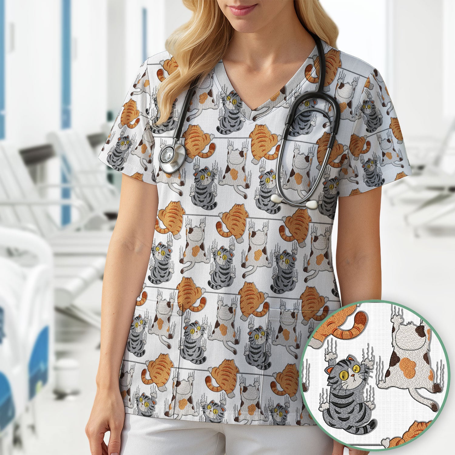 Cute Cat Pattern Nurse Scrub Top, Cats Medical Pattern Shirt, Breathable Fabrics Nursing Uniform