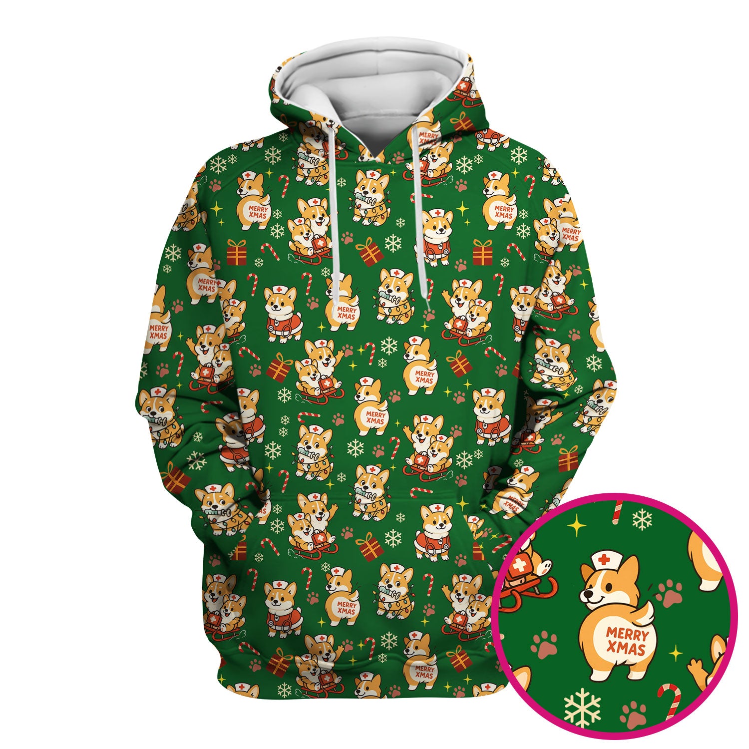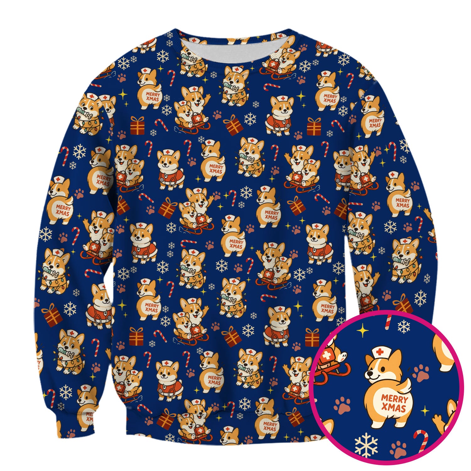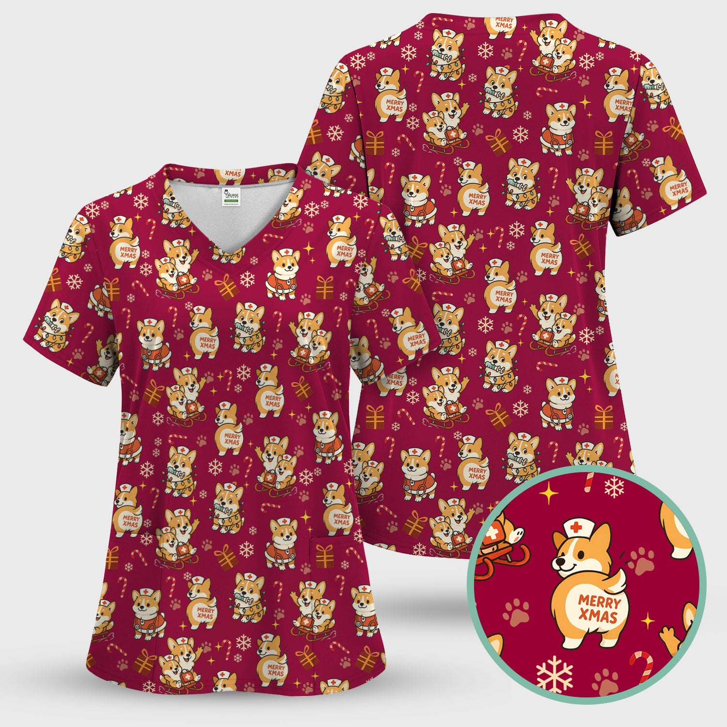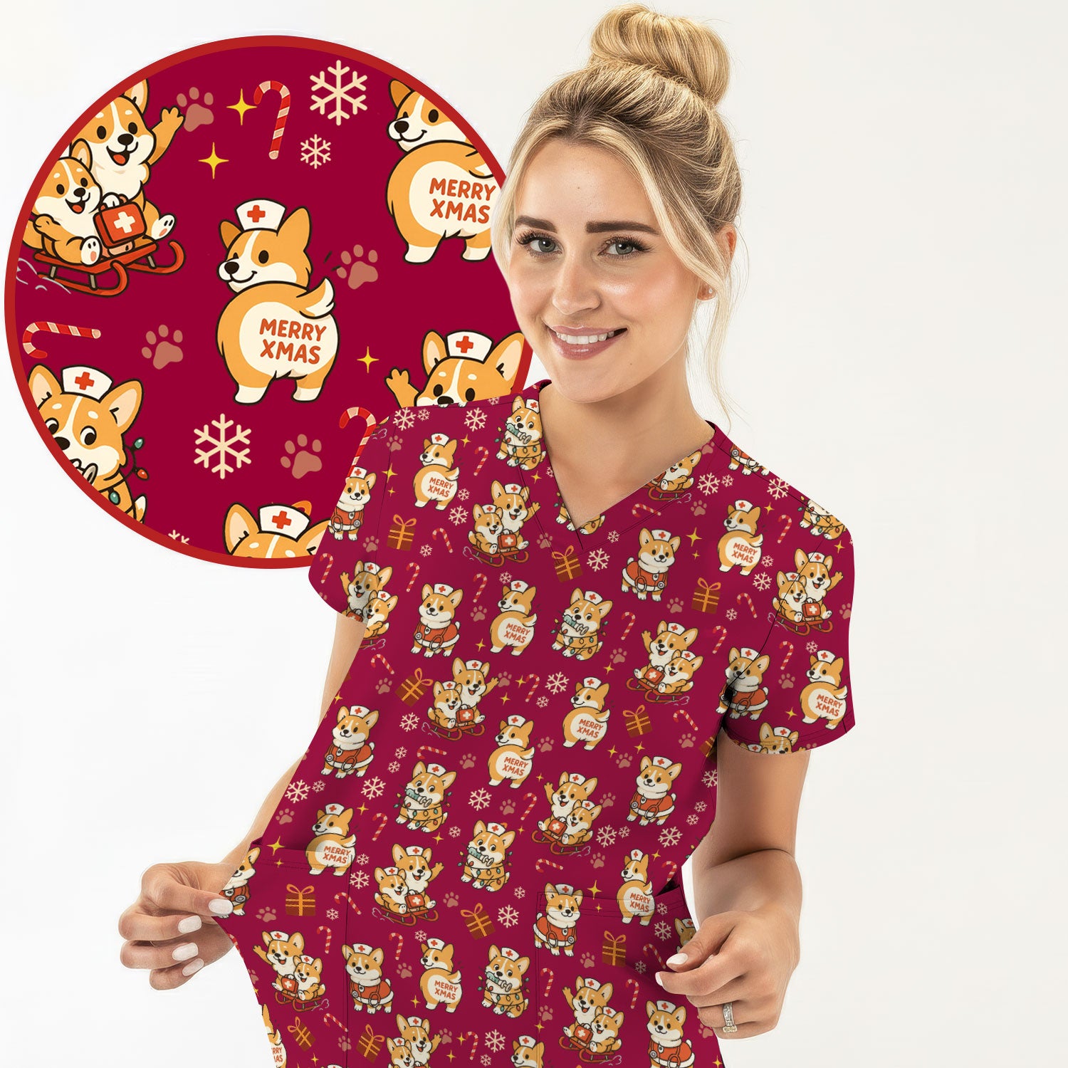 Cute Corgi Dog Scrubs for Christmas - Festive Puppy Pattern Medical Scrub Top - Holiday Christmas Scrubs with Charming Corgi Print