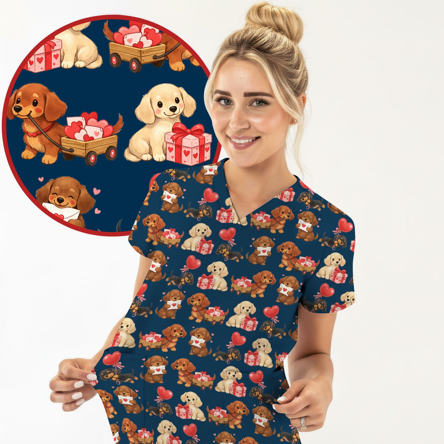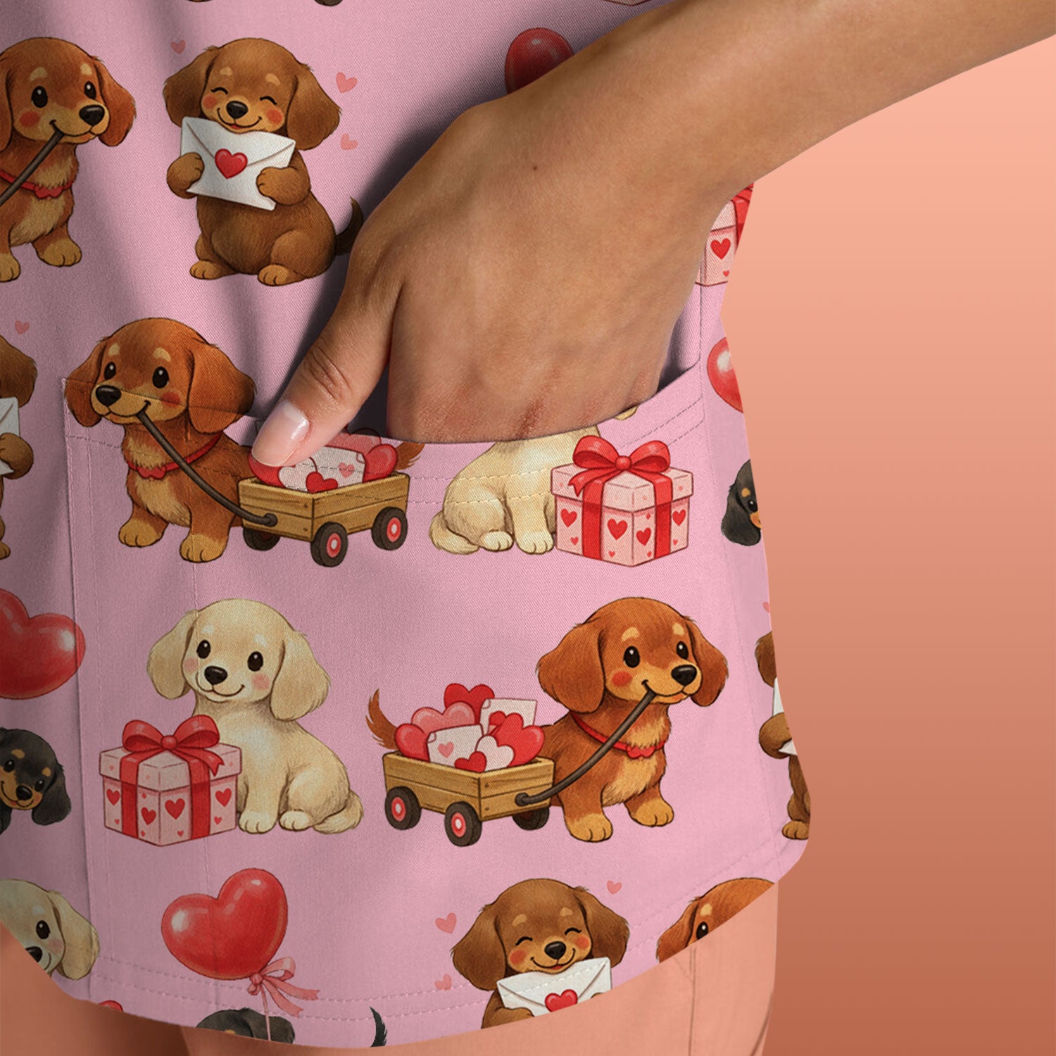 Cute Dachshund Nurse Scrub Top For Nurses, Wiener Dog Pattern Nurse Shirt, Breathable Fabrics Nursing Uniform