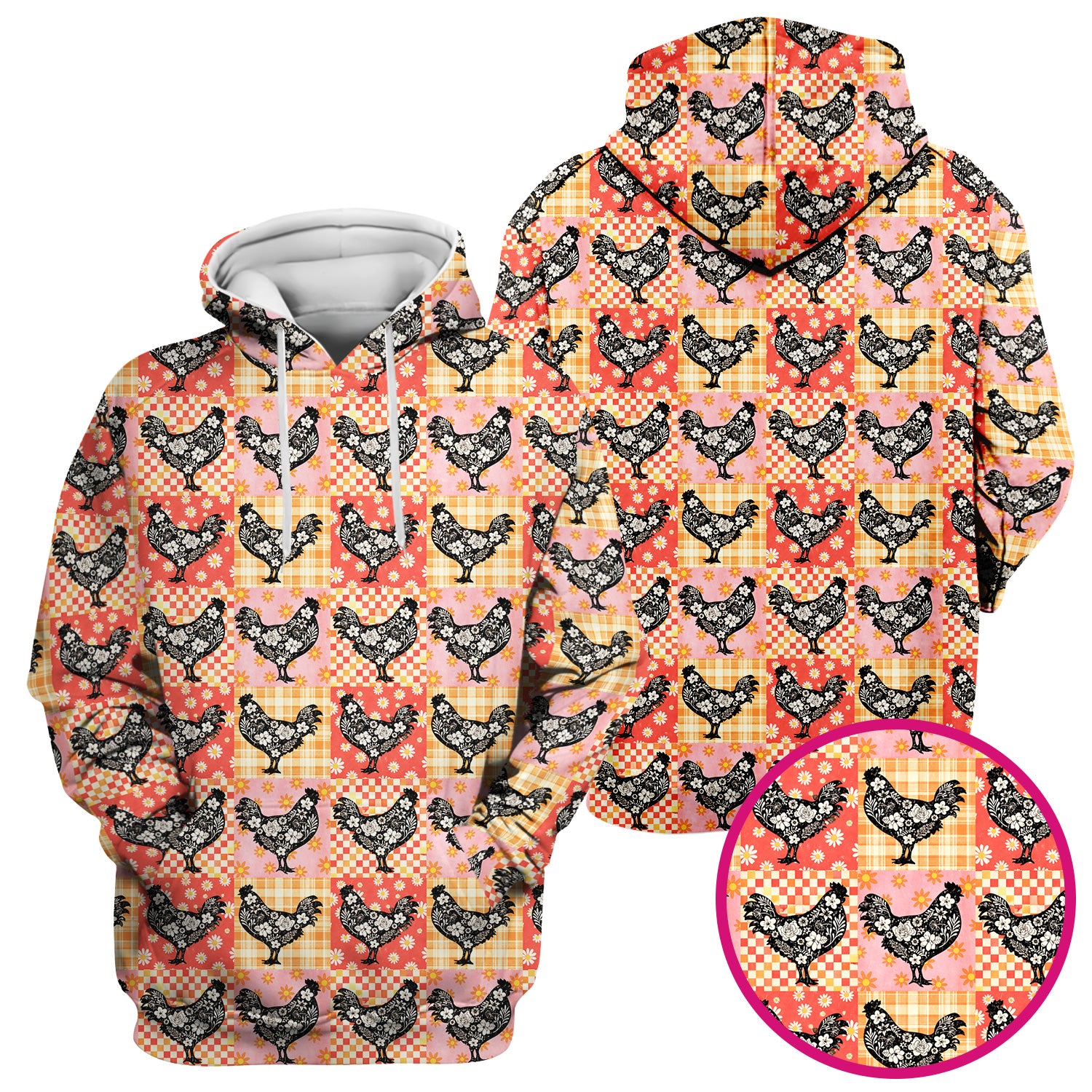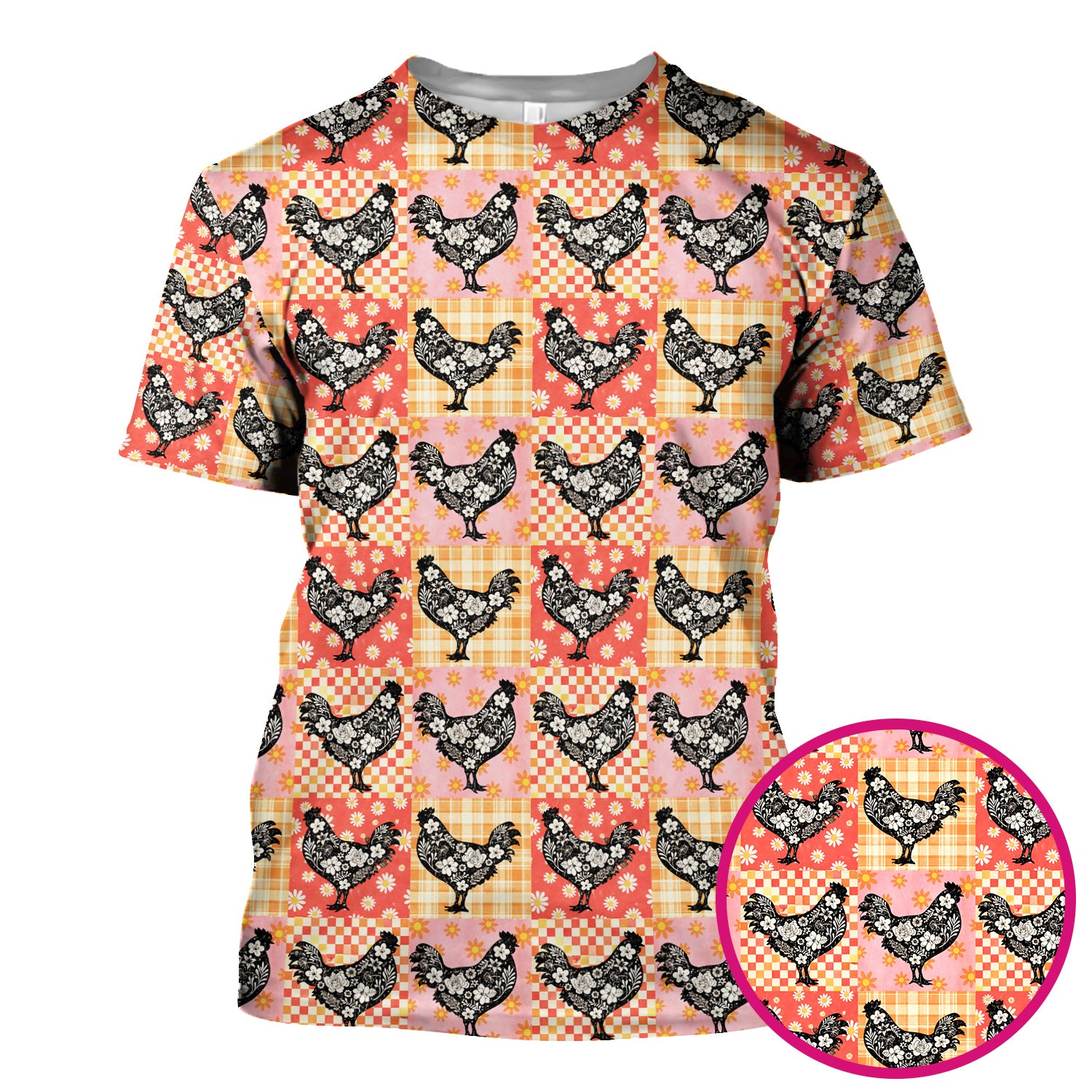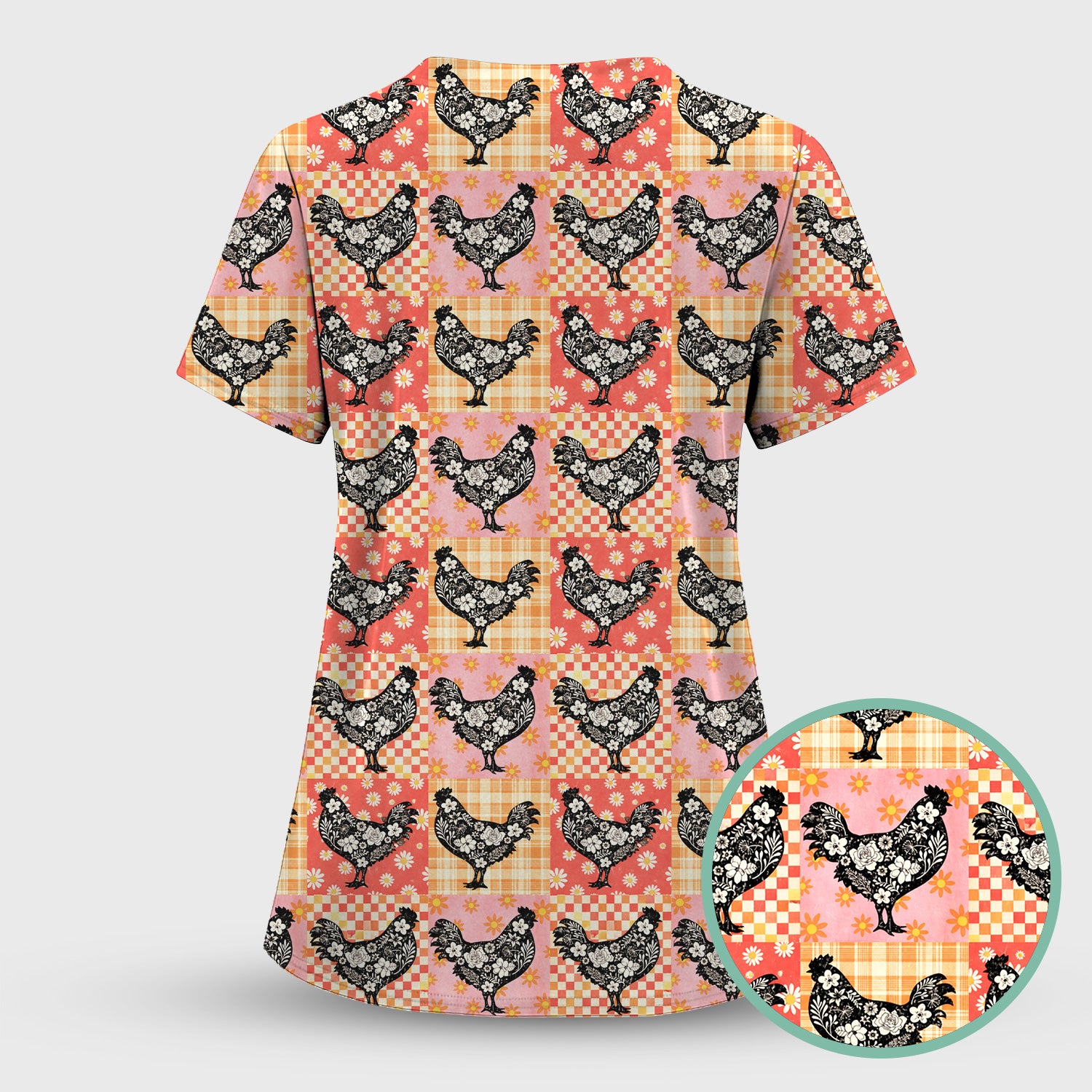 Cute Floral Chicken Patchwork Print Scrub Top, Comfortable Scrubs For Nurses