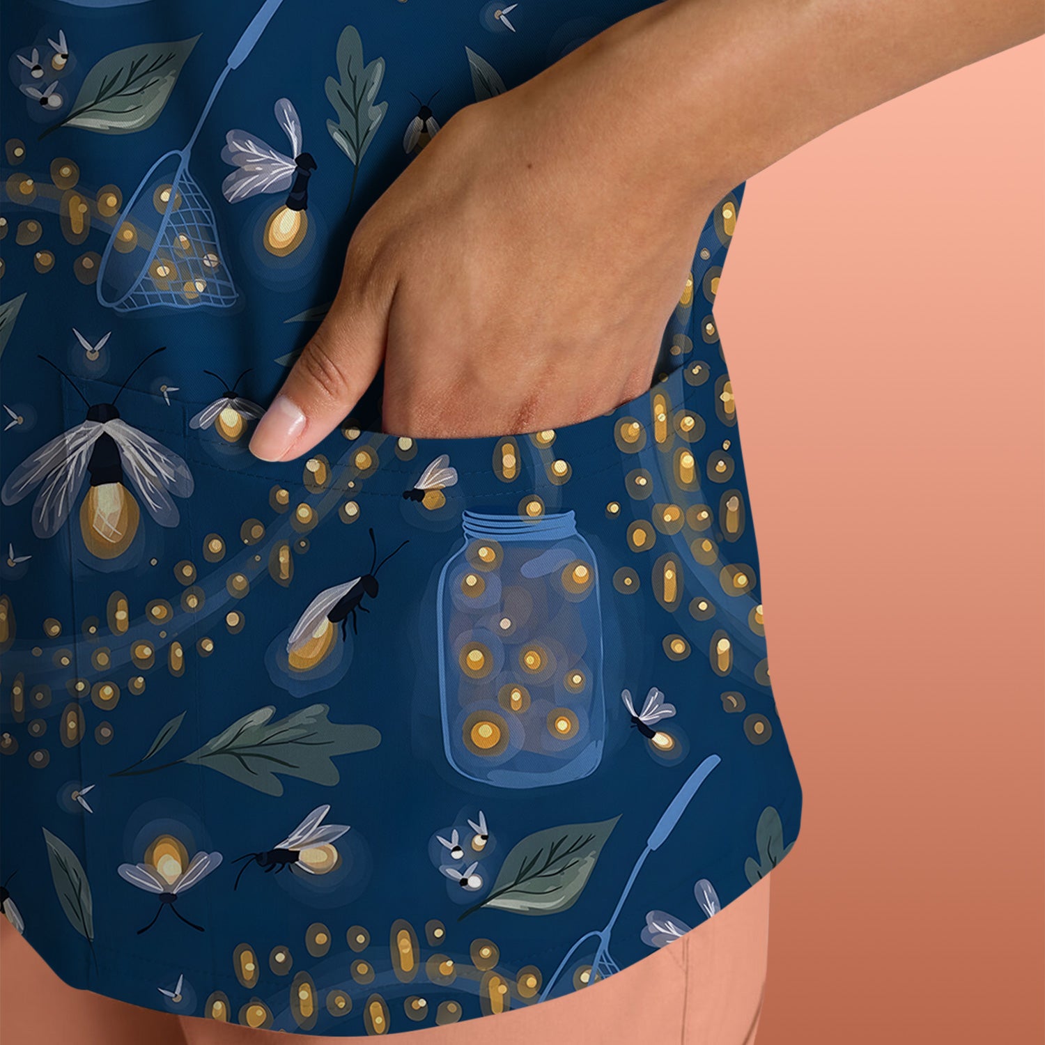 Cute Nurse Firefly Pattern Scrub Top, Comfortable Scrubs For Nurses