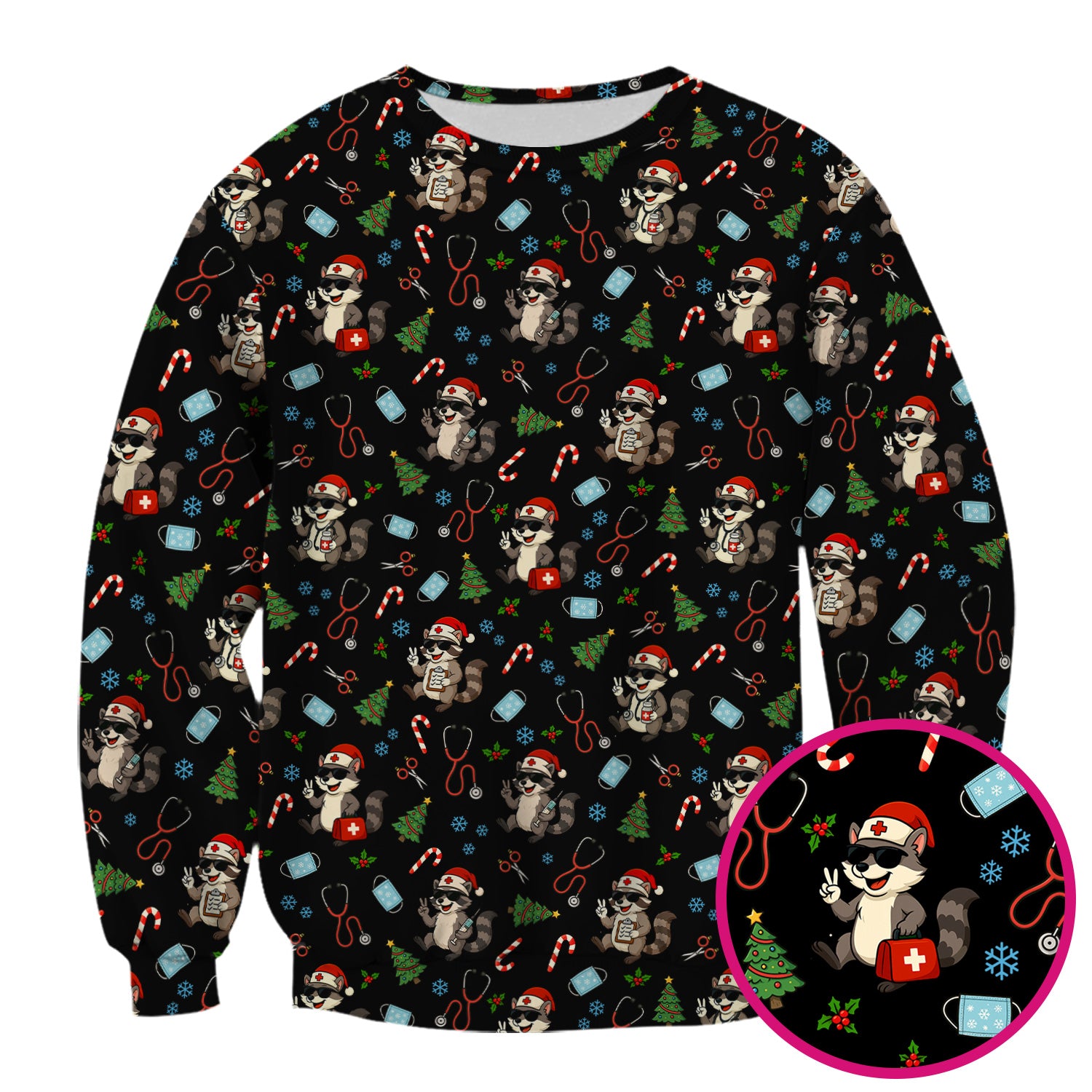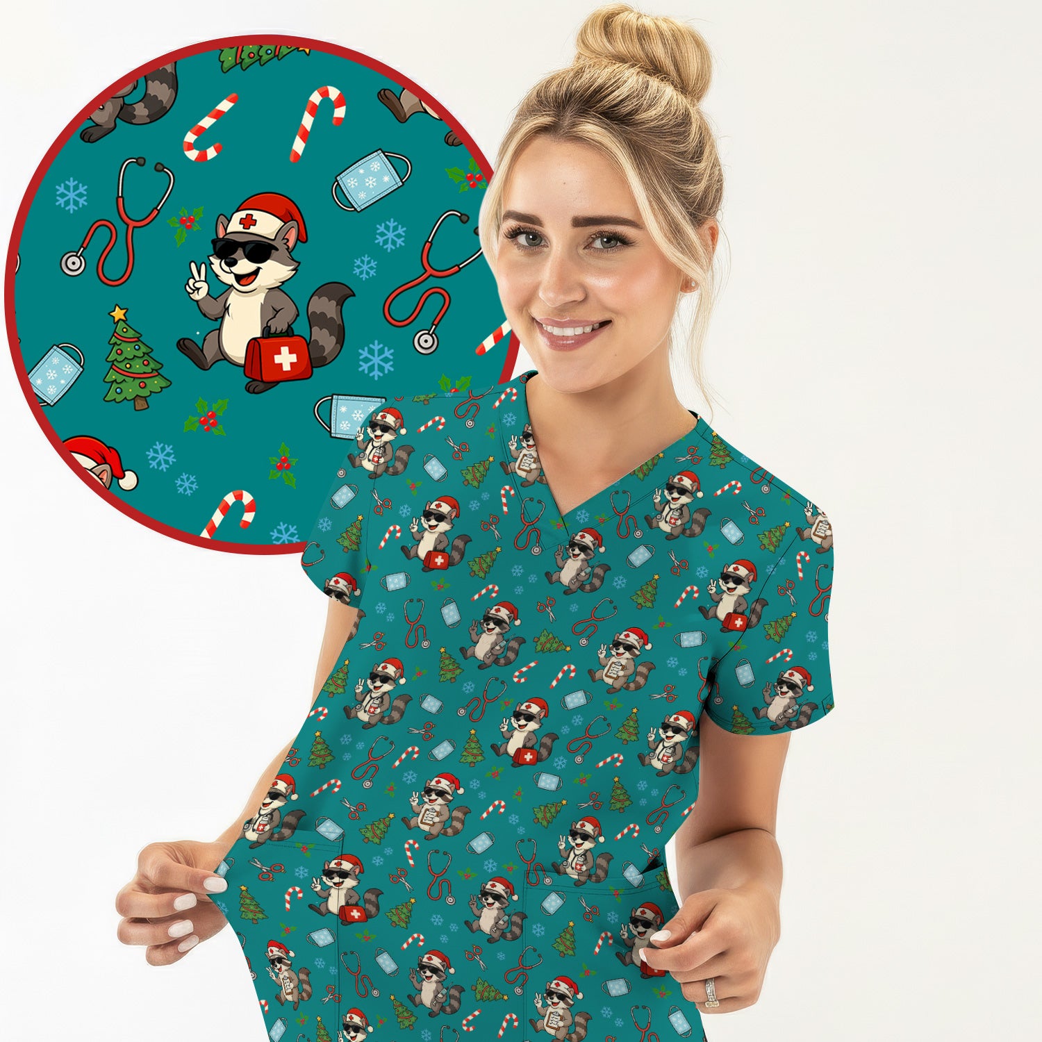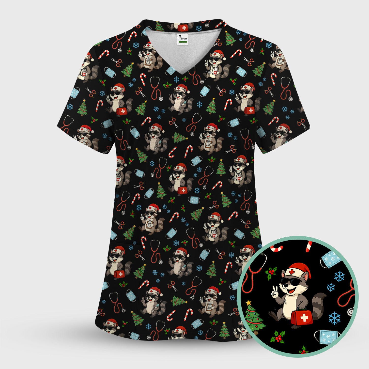 Cute Raccoon Christmas Scrub Top - Santa Hat and Stethoscope Pattern Nurse Scrubs - Funny Holiday Medical Shirt Gift for RN CNA LPN