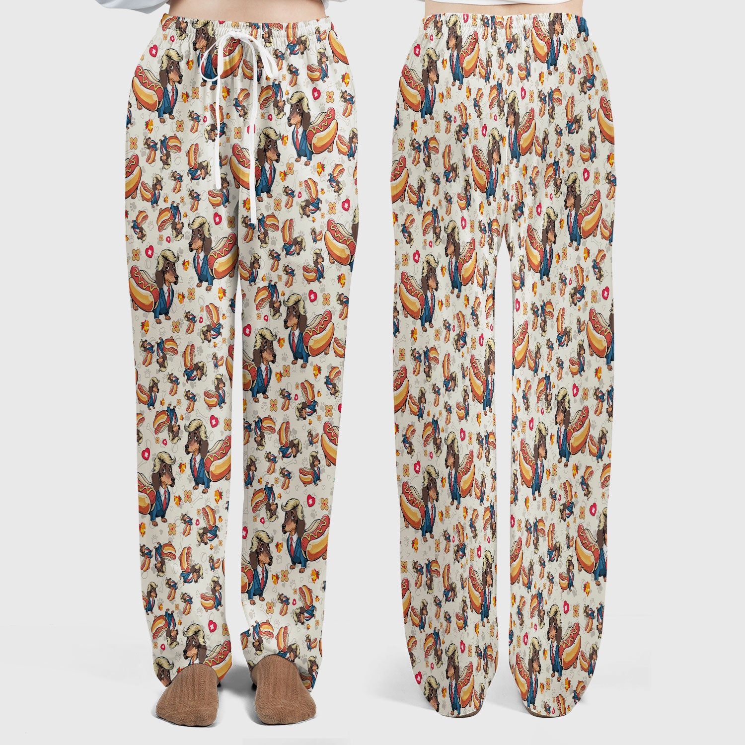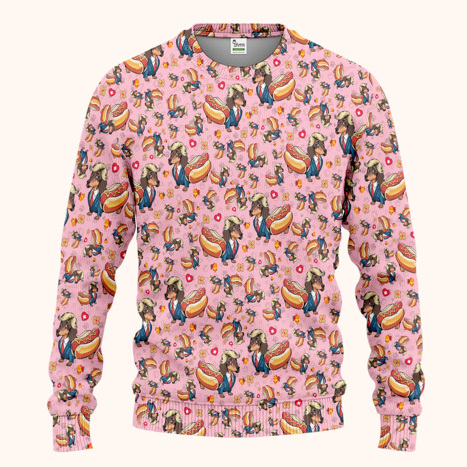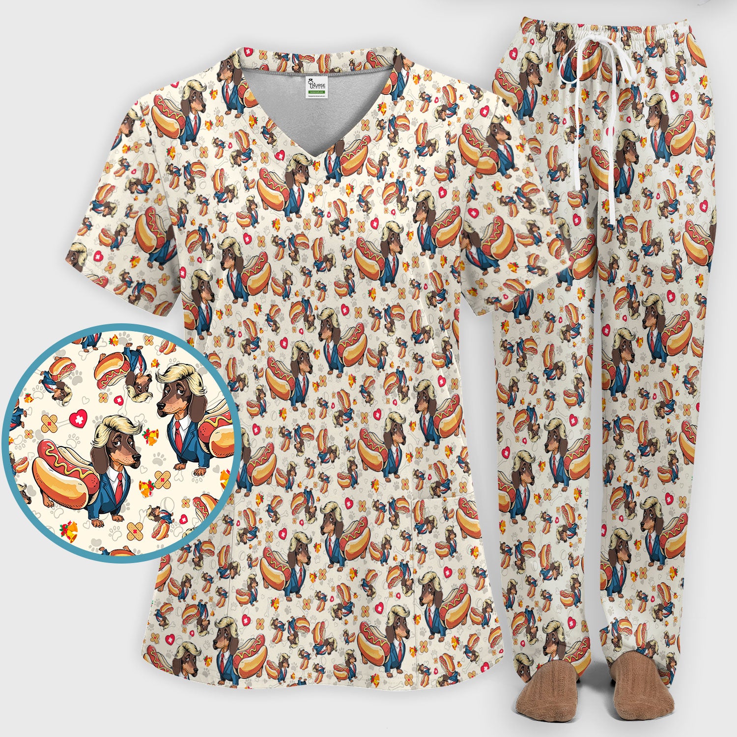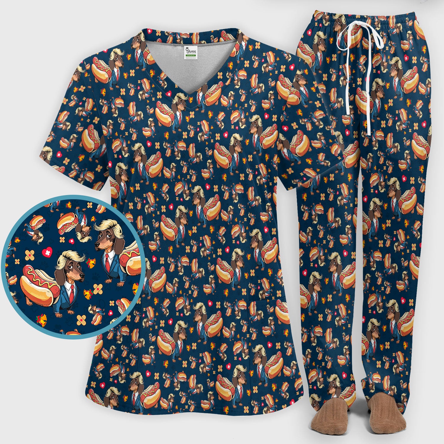 Dachshund Hot Dog Nurse Scrub Set - Funny Sausage Dog Pants and V Neck Top - Medical Uniform Gift