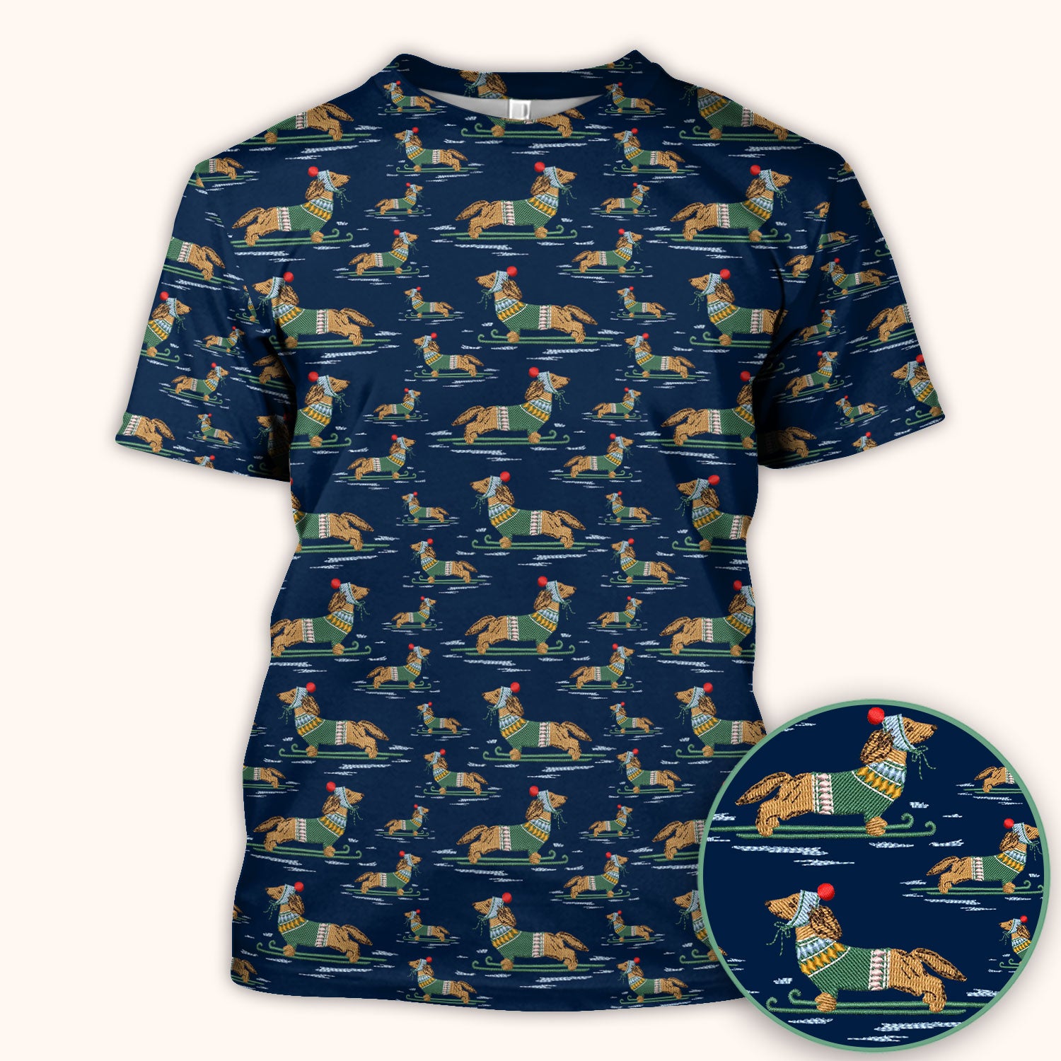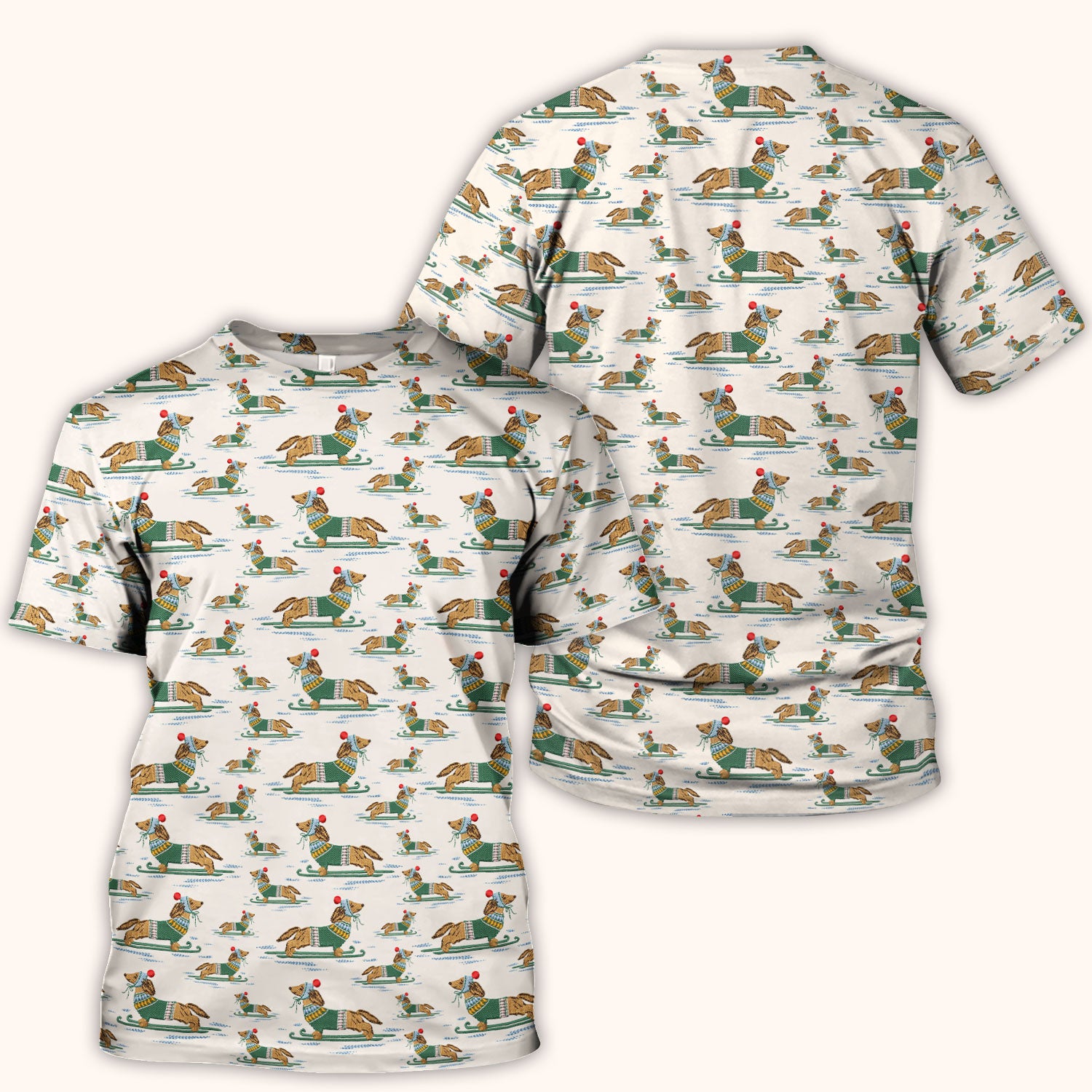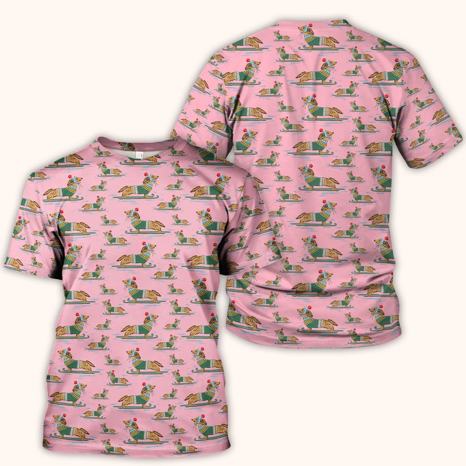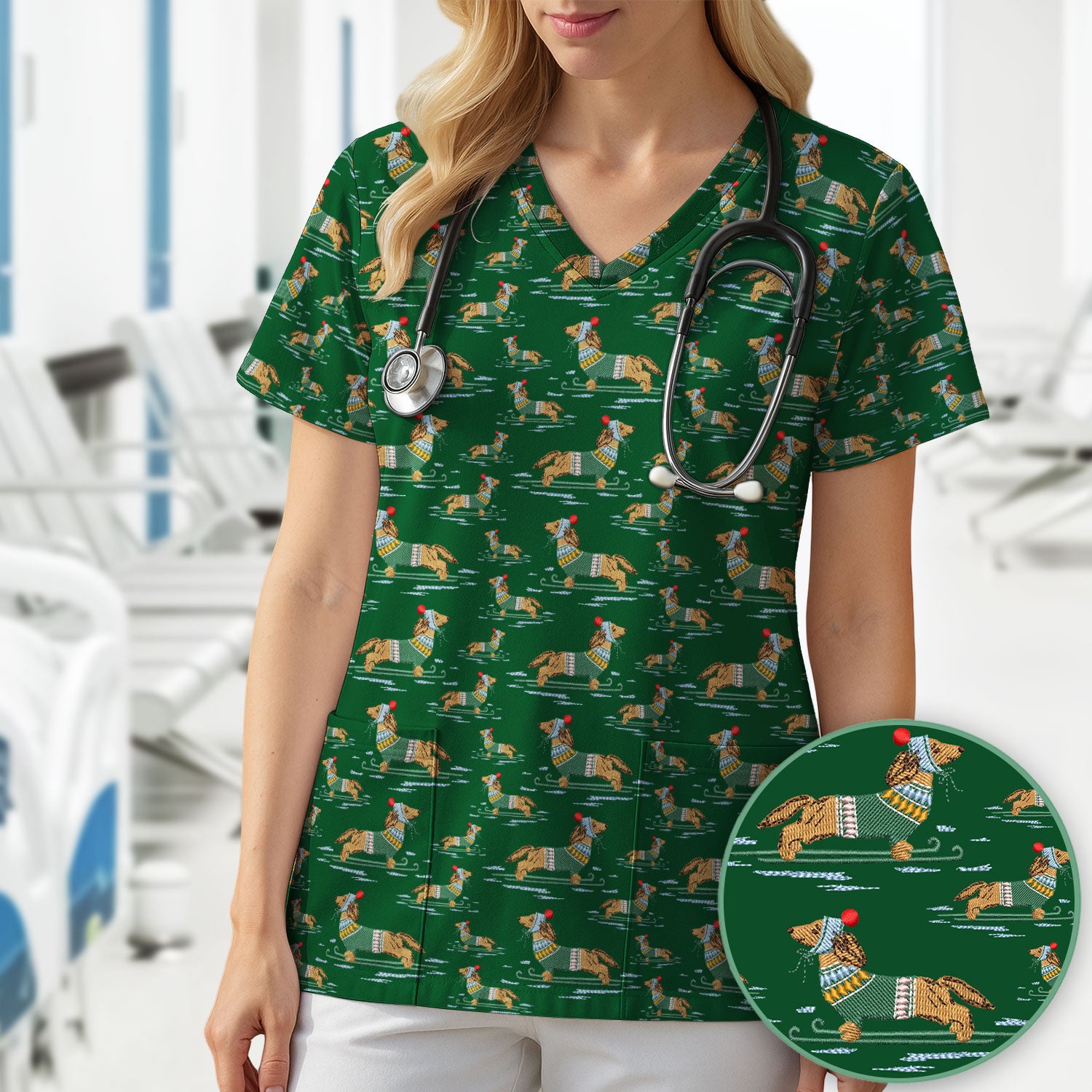 Dachshund Nurse Scrub Top, Wiener Dog Winter Pattern Shirt, Breathable Fabrics Nursing Uniform