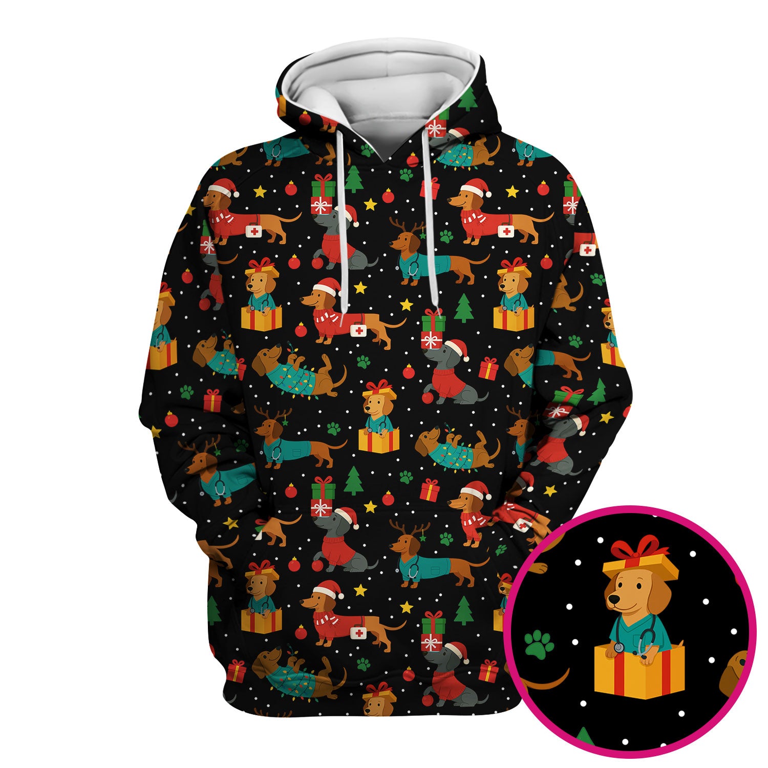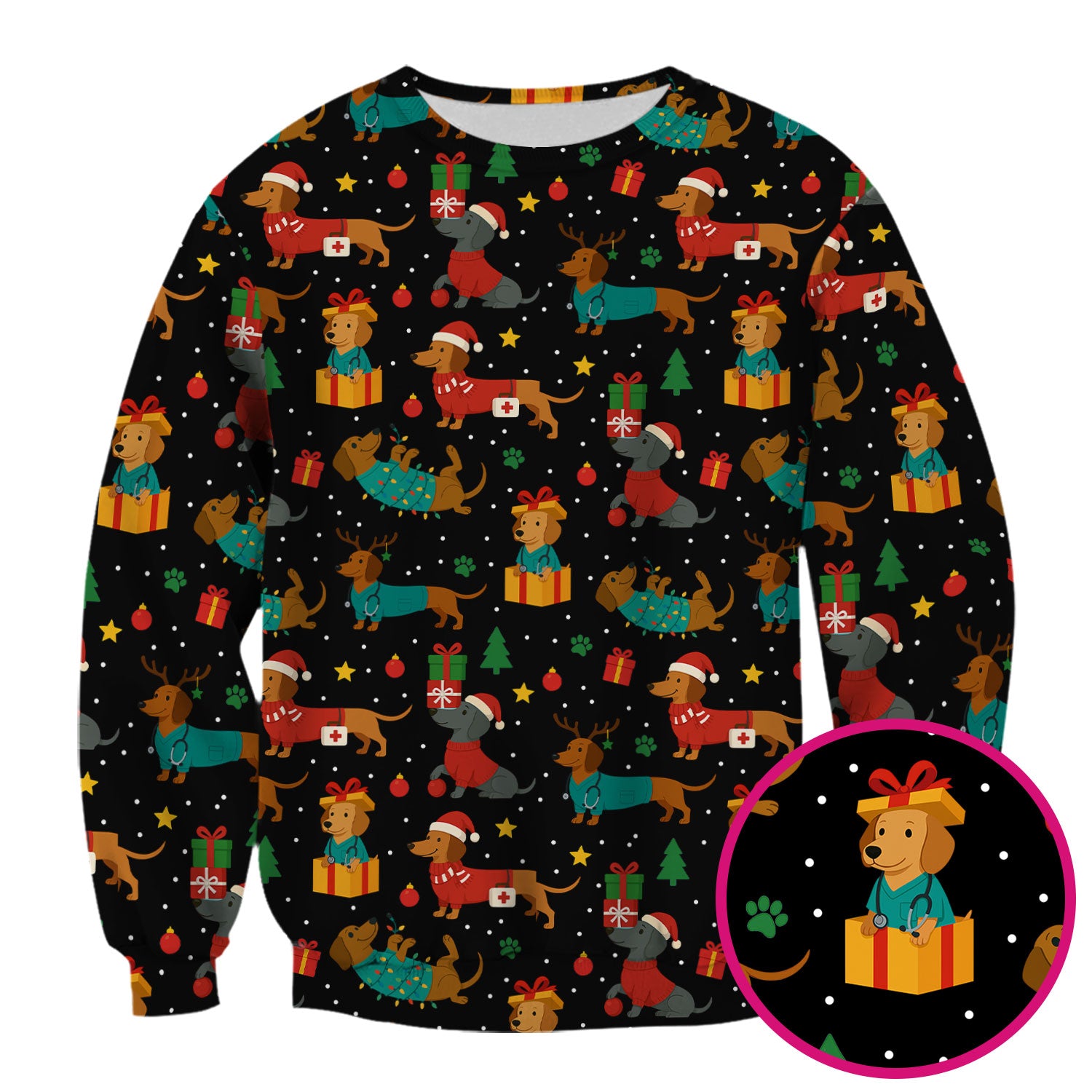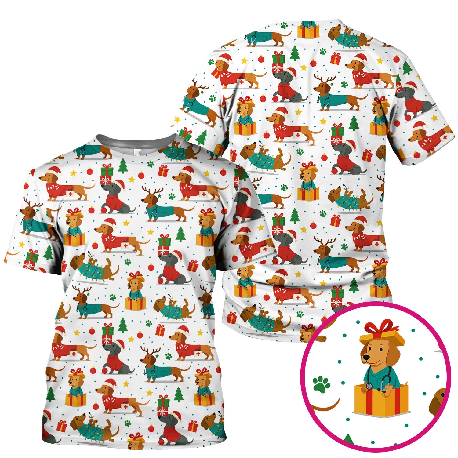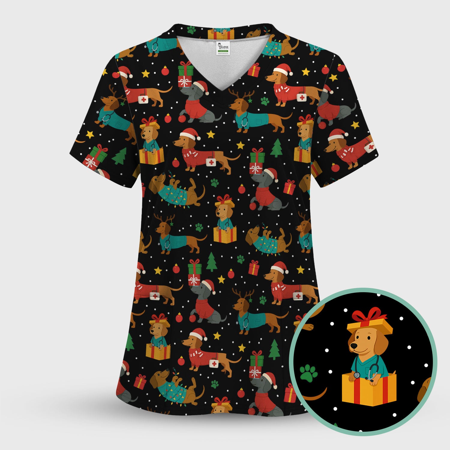 Dachshund Scrub Top Christmas - Cute Dog Nurse Shirt - Holiday Medical Scrubs Gift for Women CNA RN Doctor