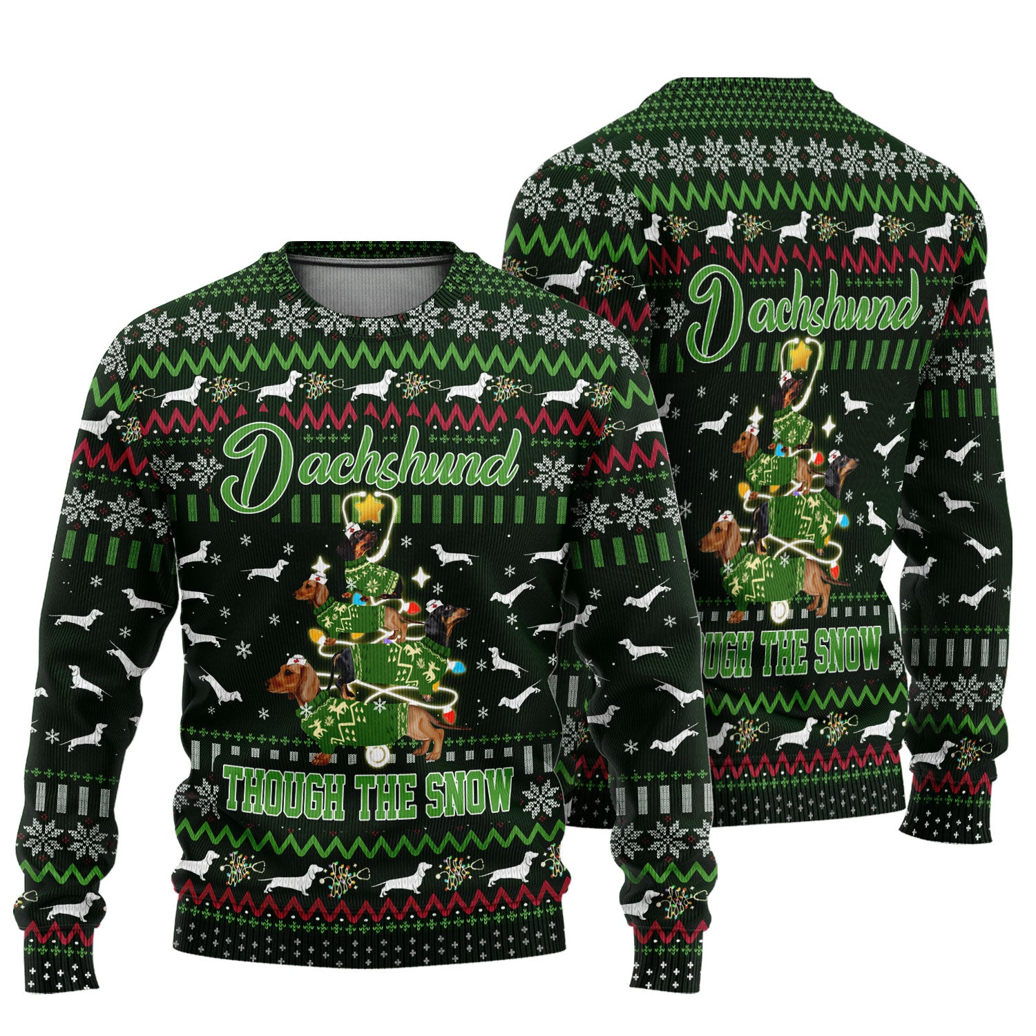 Dachshund Through The Snow Christmas Ugly Sweater - Funny Sausage Dog Xmas Tree Nurse Shirt - Cute Holiday Medical Uniform