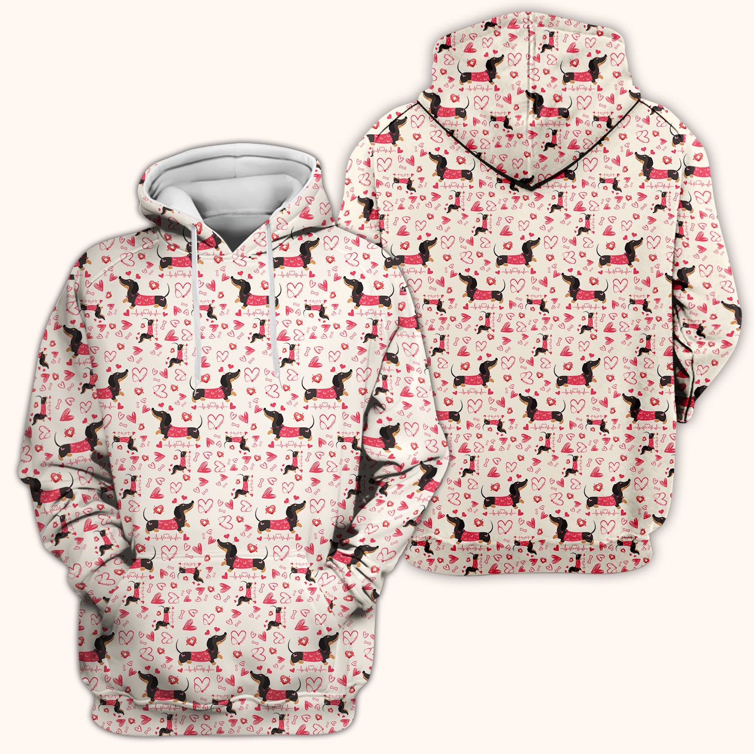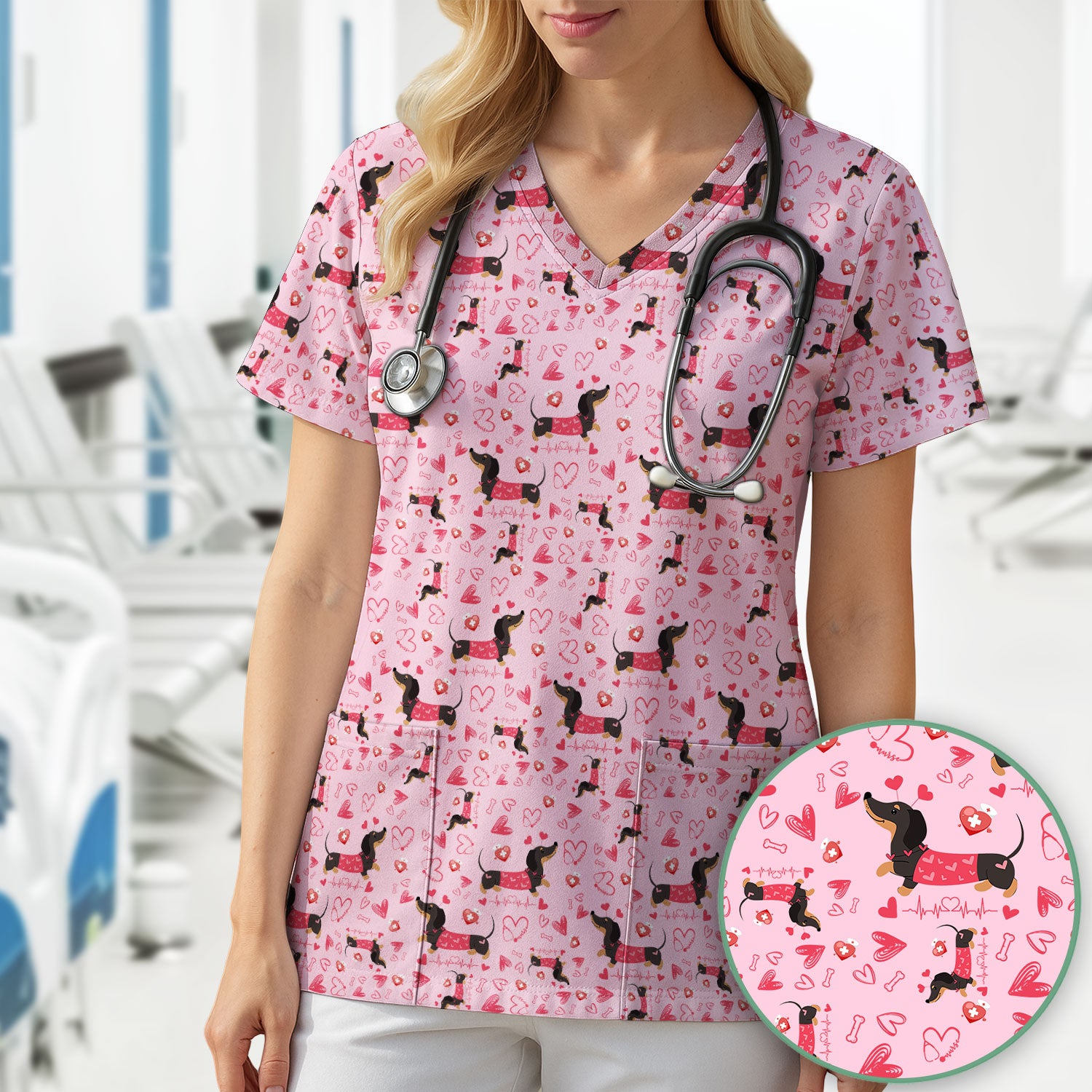 Dachshund Valentine Scrub Top, Cute Wiener Dog Heart Pattern Nurse Shirt, Breathable Fabrics Nursing Uniform