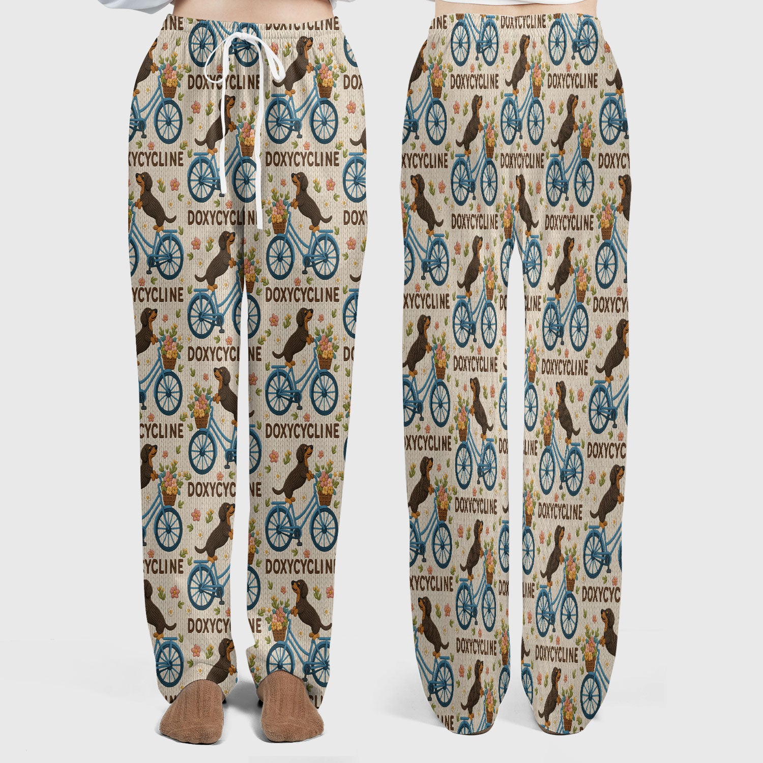 Doxycycline Pharmacy Pun Scrub Set - Dachshund on Bicycle Pharmacists Scrubs Pants and V Neck Top - Veterinary Technicians Gift
