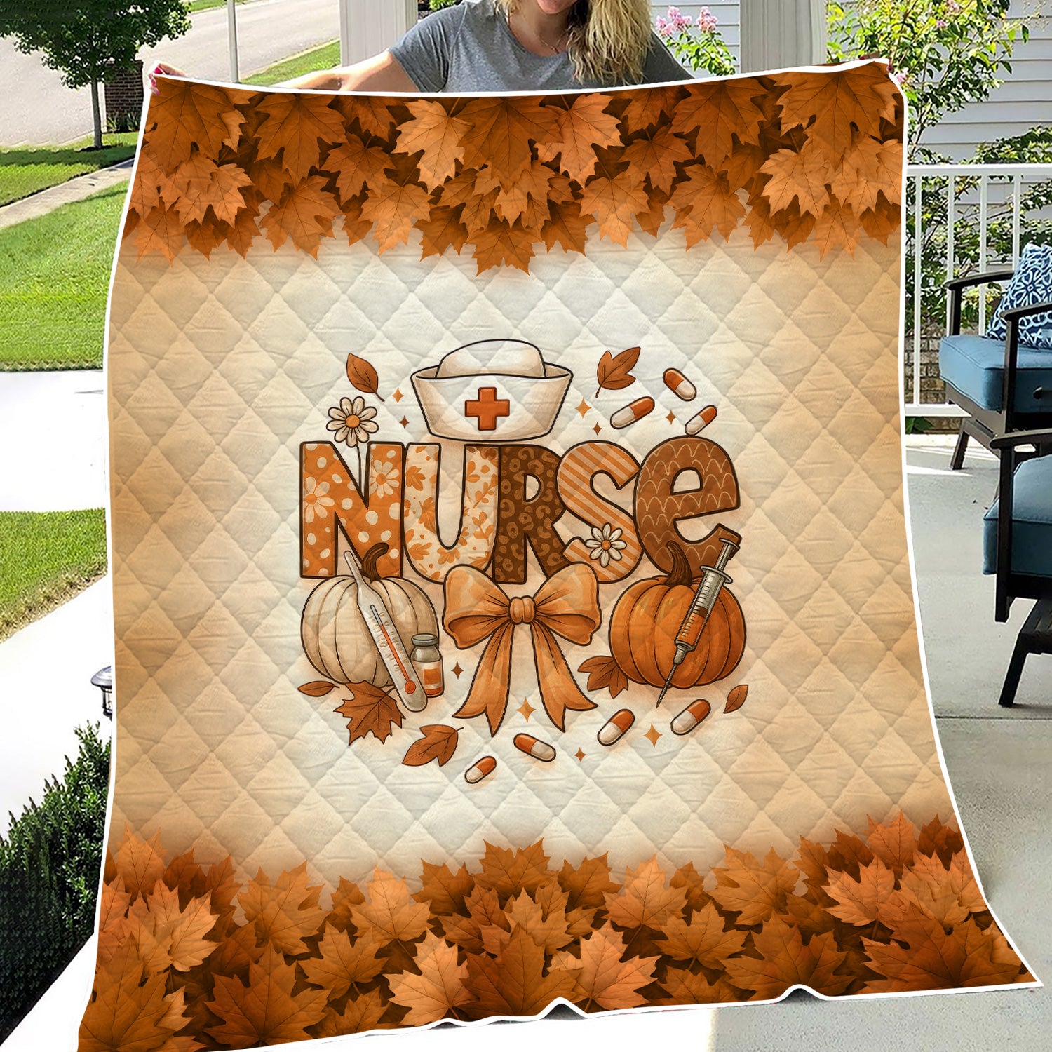 Fall Nurse Blanket with Pumpkins and Leaves - Cozy Autumn Throw for RN CNA LPN - Personalized Thanksgiving Gift for Medical Workers