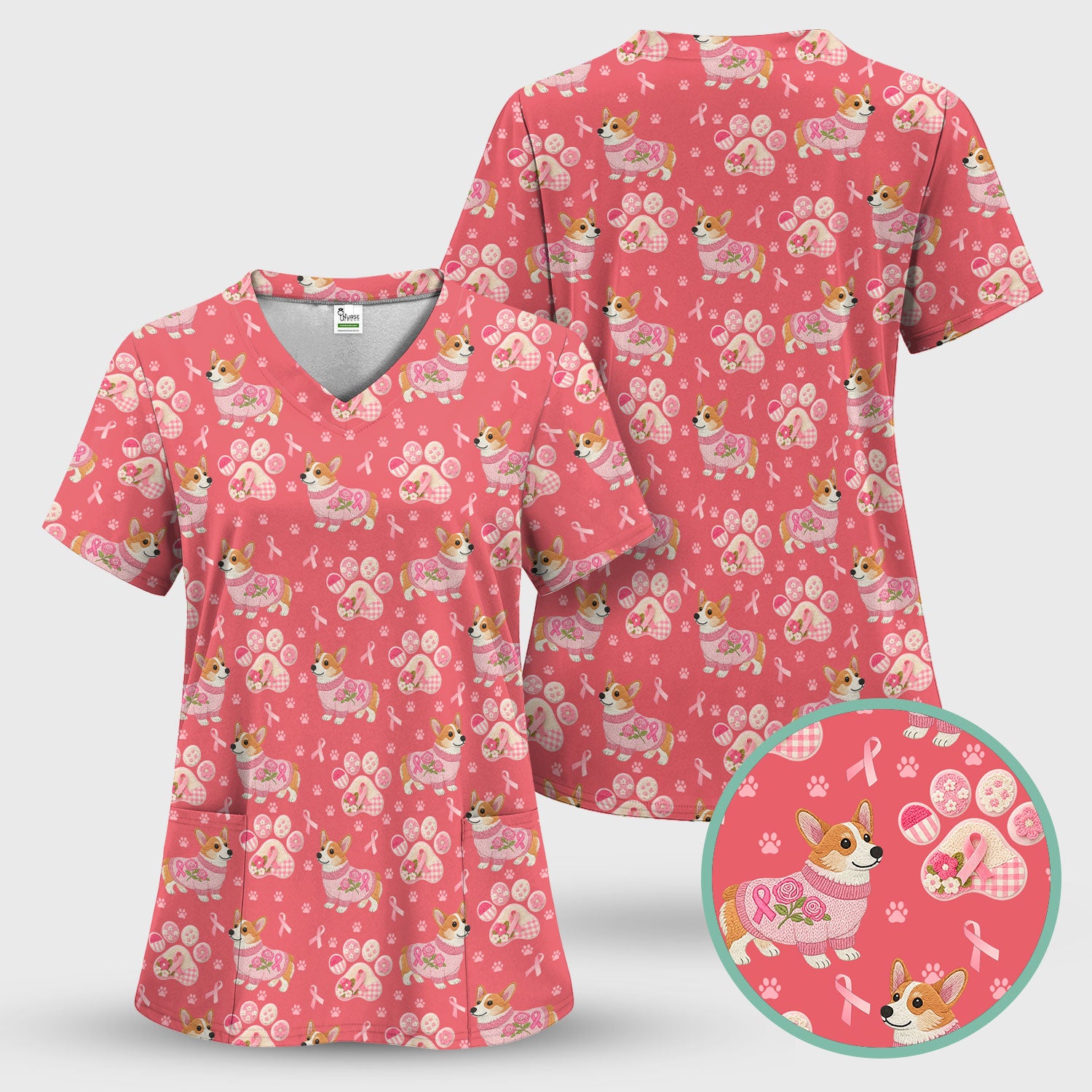 Floral Corgi Scrub Top for Women - Cute Dog Paw Print with Pink Ribbon Shirt - Breast Cancer Awareness October Gift