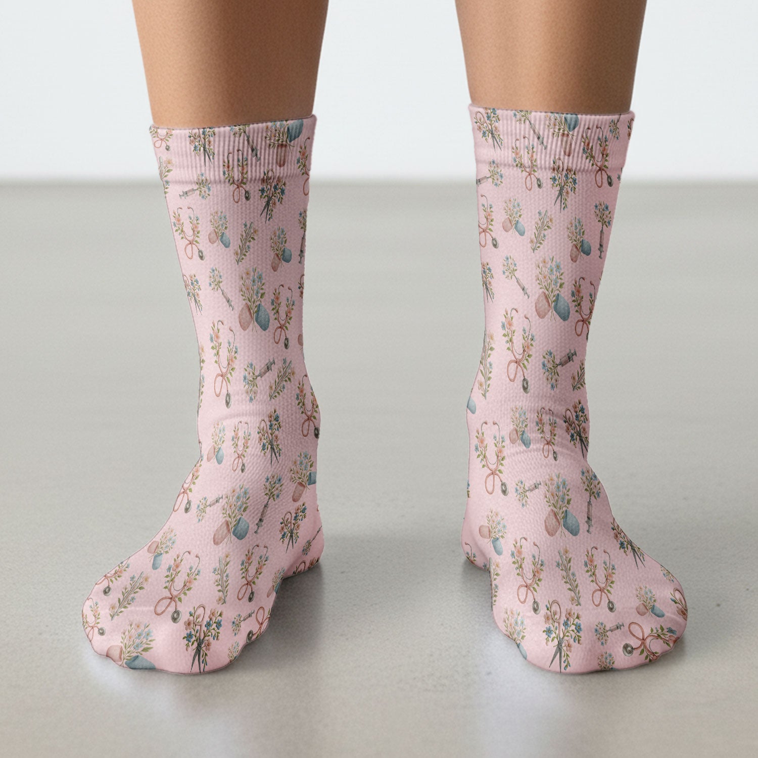 Floral Medical Scrub Socks, Elegant Stethoscope With Flower Nursing Sock, Breathable Fabrics Nurse Uniform