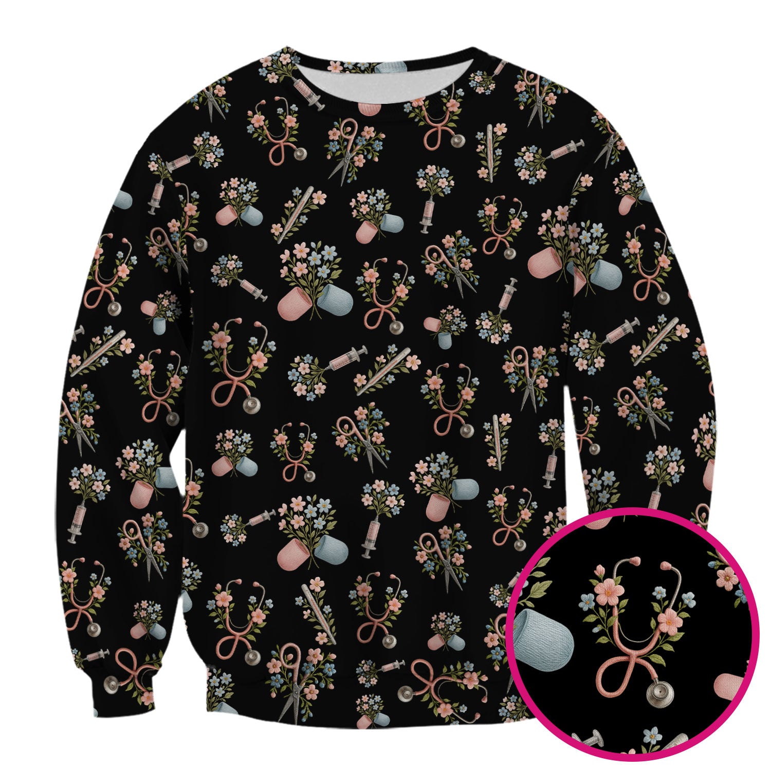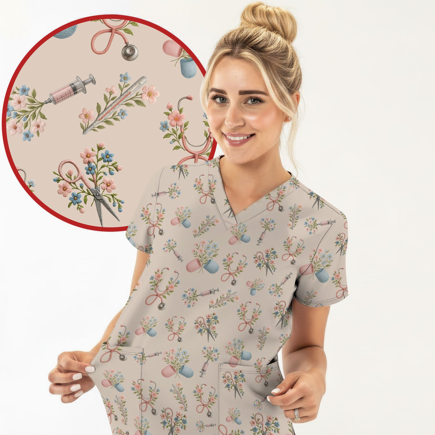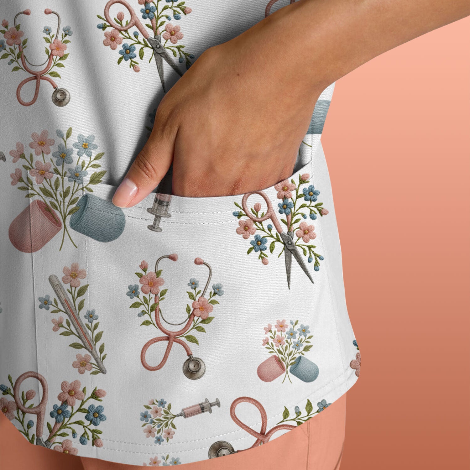 Floral Medical Scrub Top, Elegant Stethoscope With Flower Nursing Shirt, Breathable Fabrics Nurse Uniform