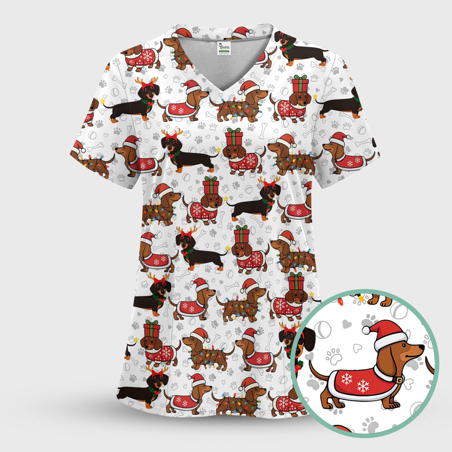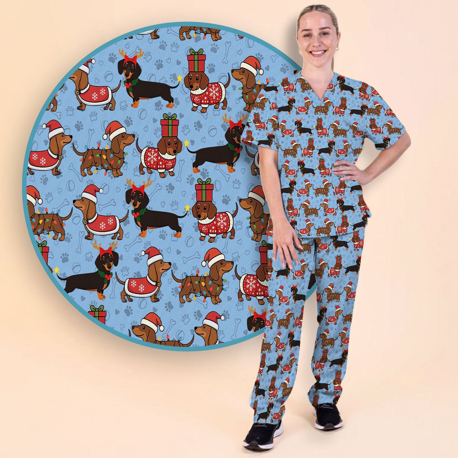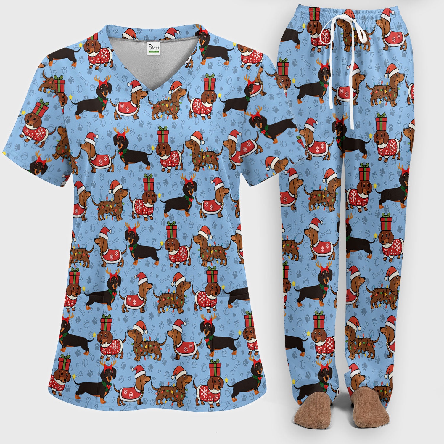 Funny Dachshund Dog Nursing Scrub Pants for Women - Wiener Santa Scrub Set for Nurse - Funny Medical Uniform for RN CNA LPN