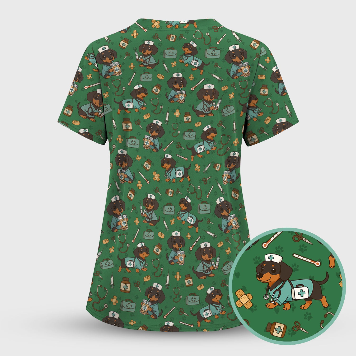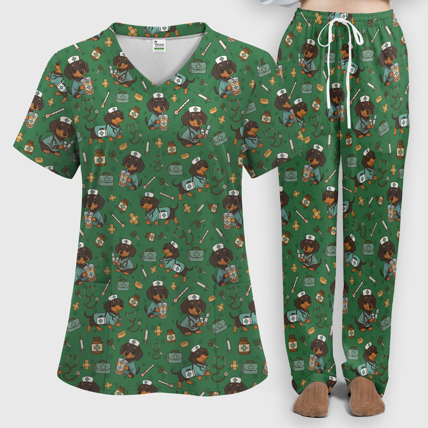 Funny Dachshund Nurse Scrubs Set - Cute Dog Print Medical Shirt - Holiday Nurse Scrub Top Gift for RN CNA Doctor, Women & Men