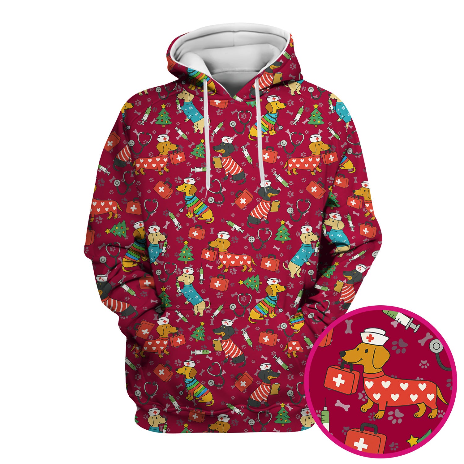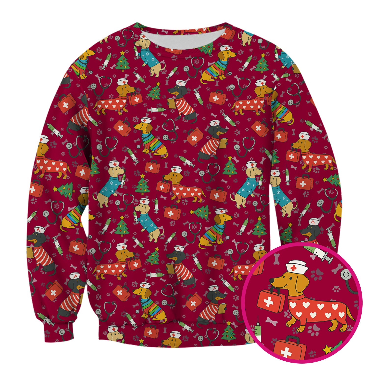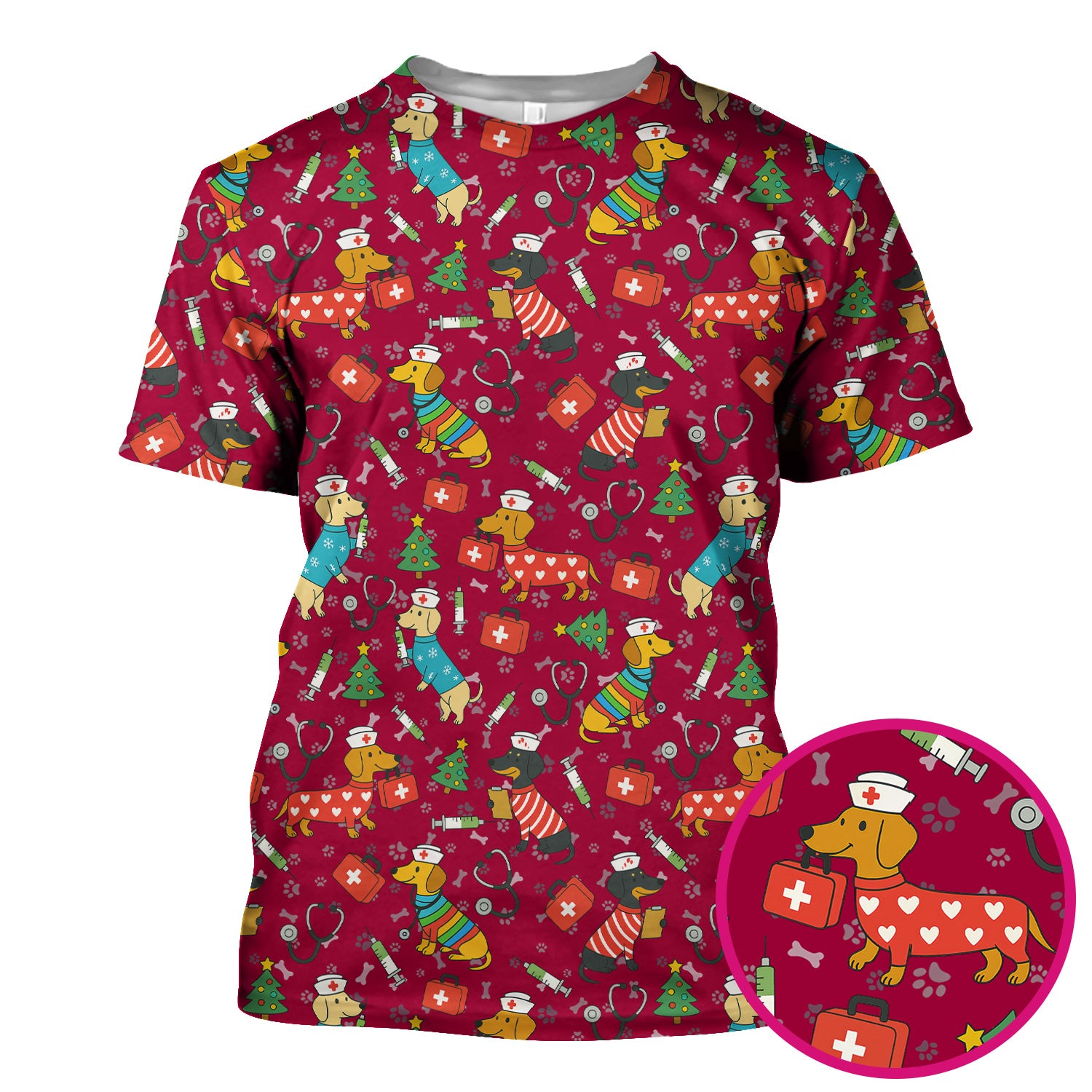 Funny Dachshund Scrub Shirt - Christmas Dog Print Scrubs Multi Color - Holiday Nurse Scrub Top Gift for Women, Men, CNA, RN, Medical Staff