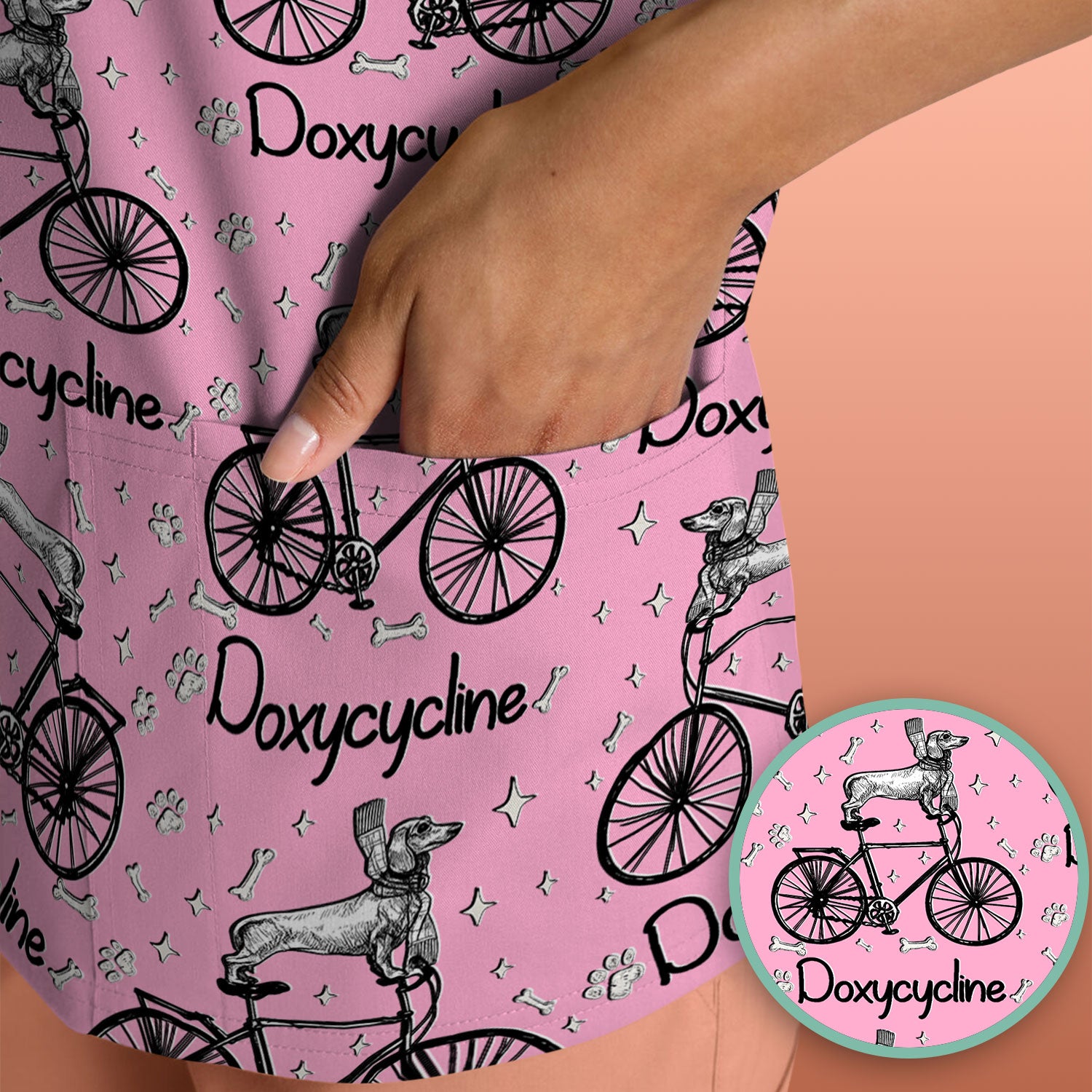 Funny Doxycycline Dog Bicycle Print Scrub Top, Comfortable Scrubs for Nurses