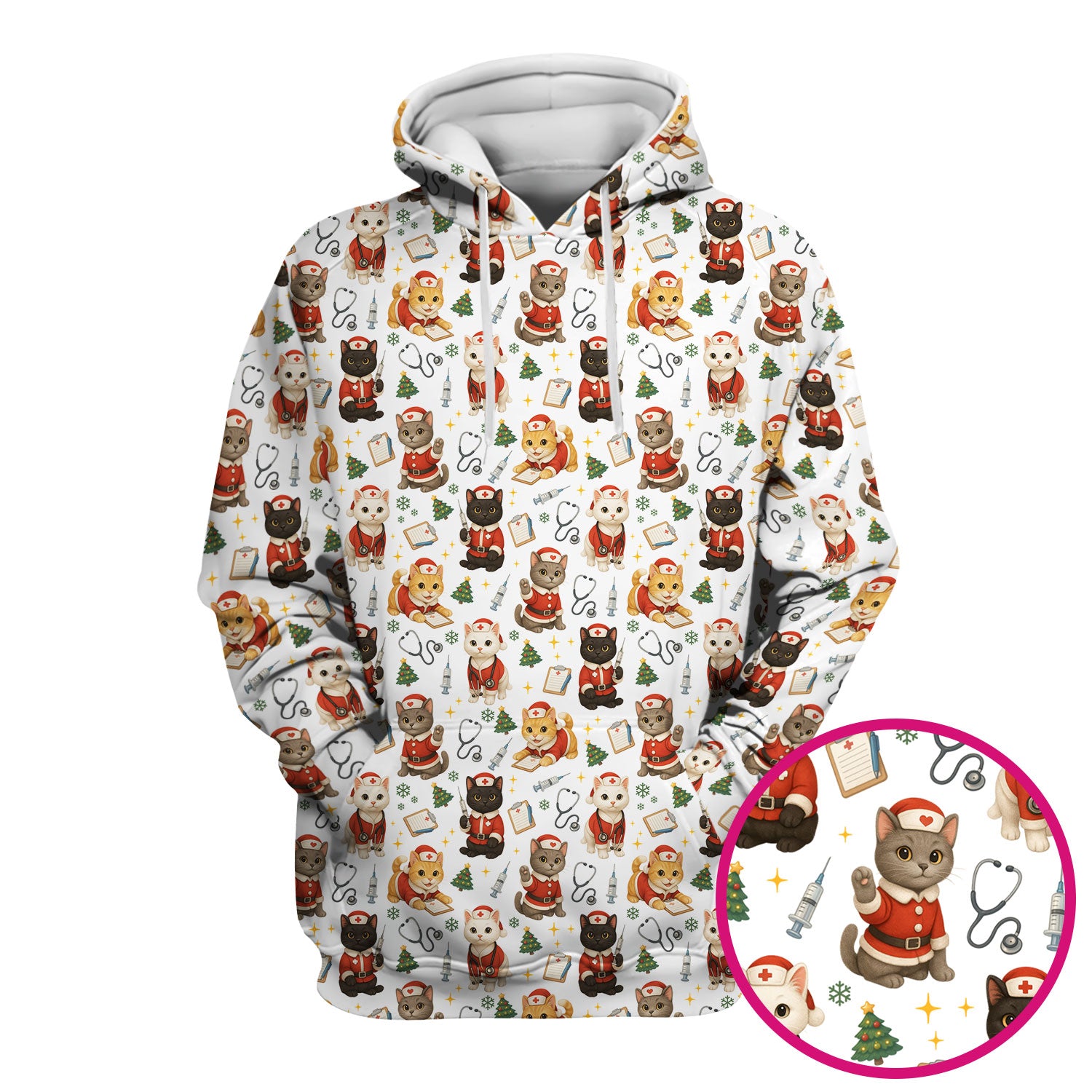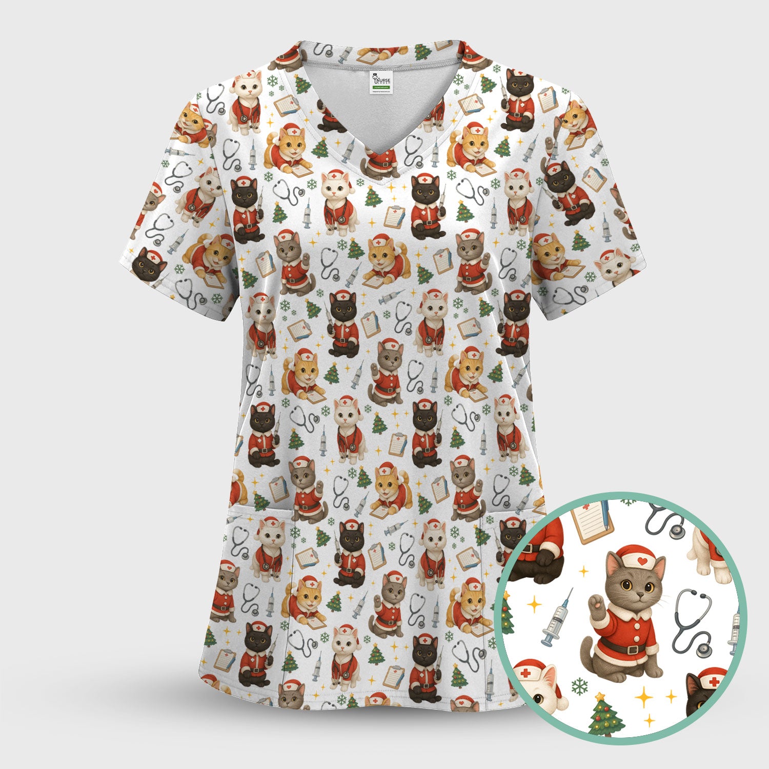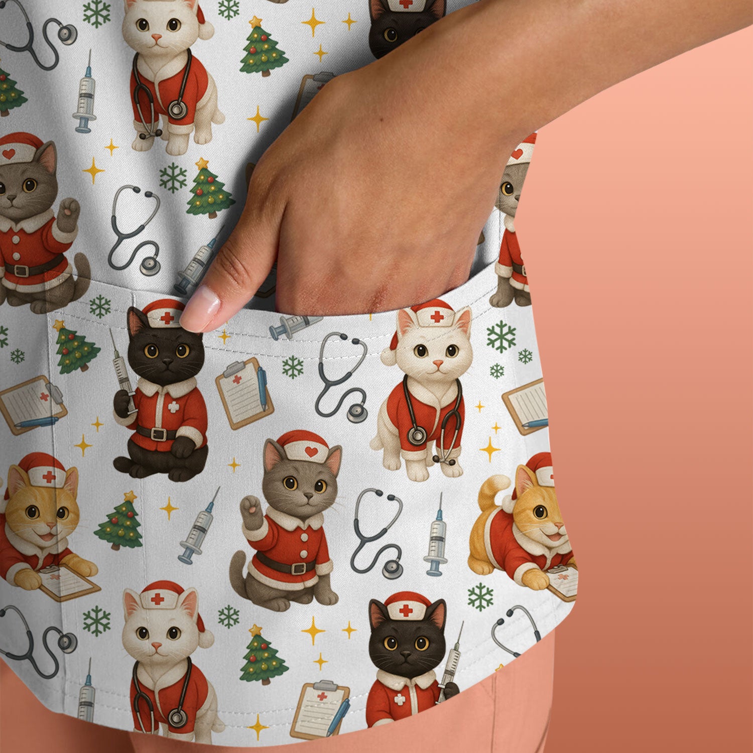 Funny Nurse Scrub Top for Women - Christmas Lucky Cat Design - Cute Holiday Nursing Shirt Gift for RN LPN CNA