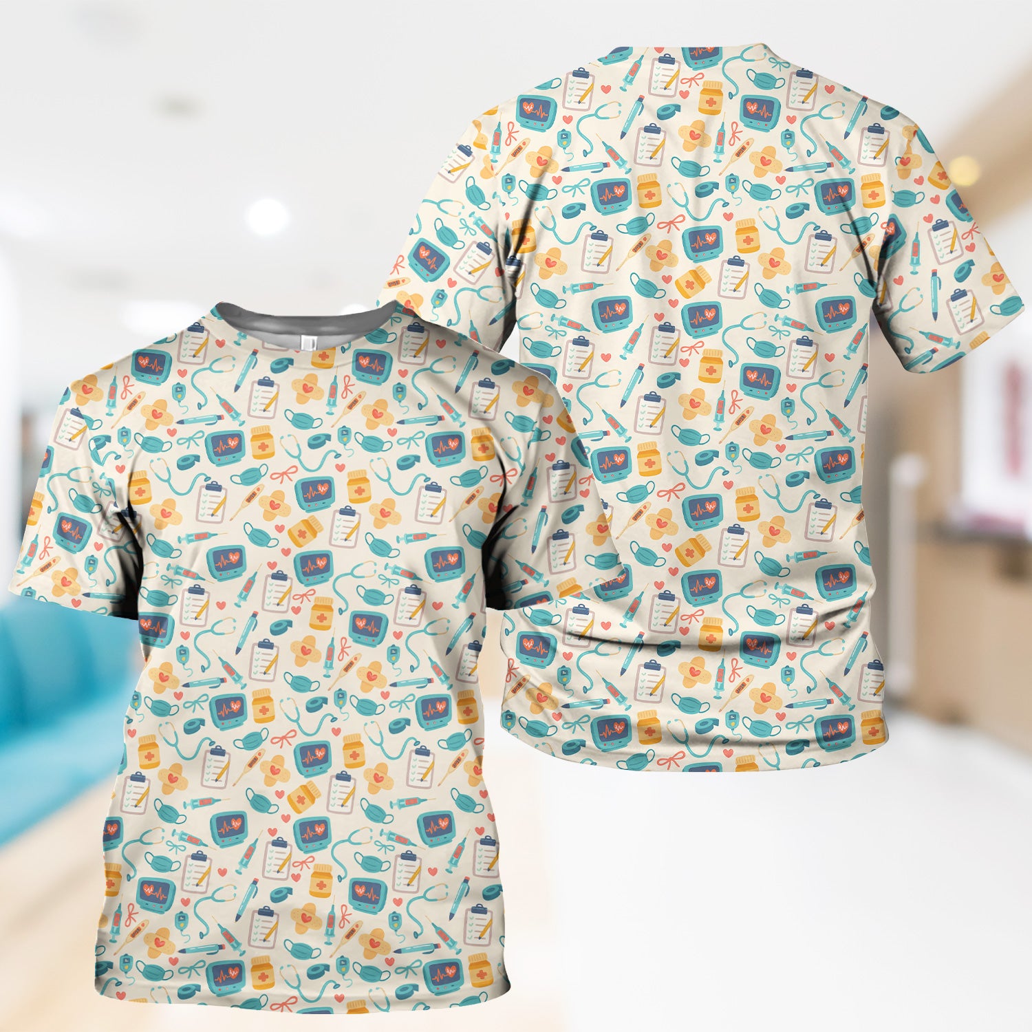 Funny Nurse Shirt with Medical Icons - Stethoscope Mask & Pills Graphic Tee - Gift for Women RN LPN CNA Workers