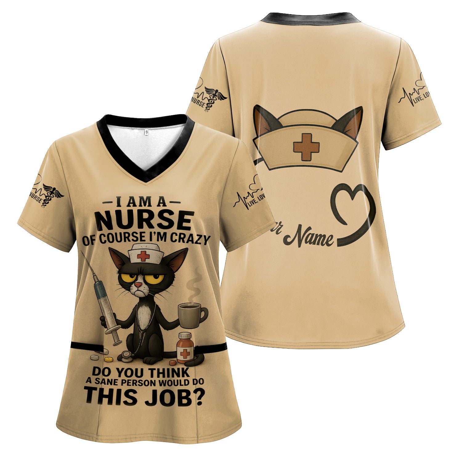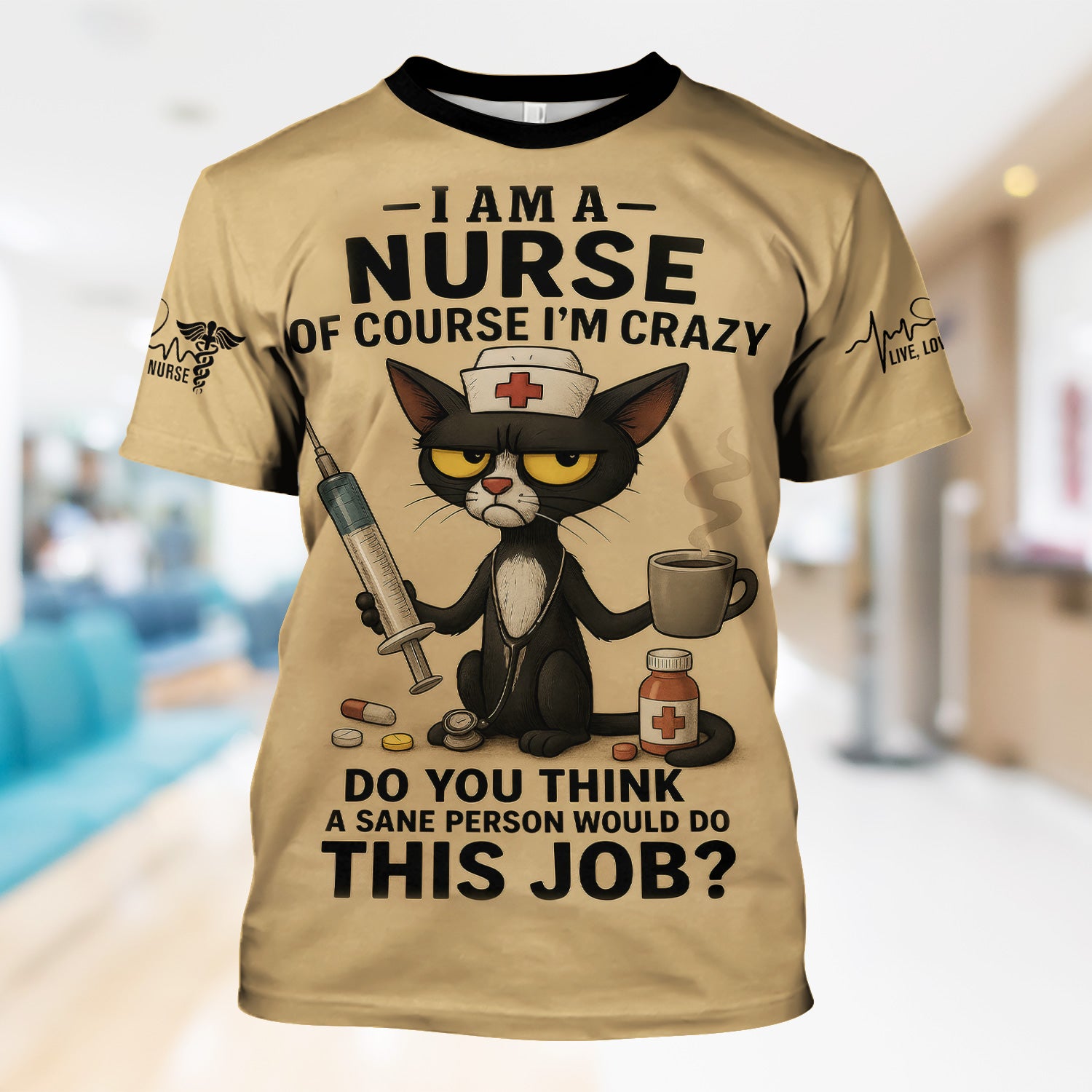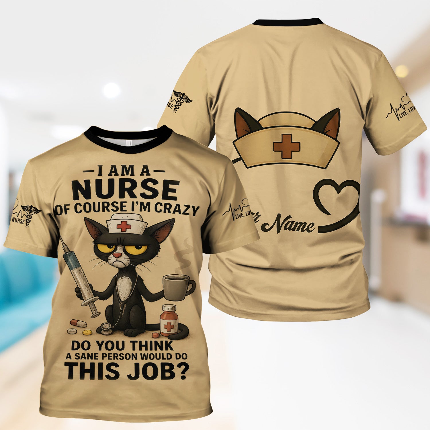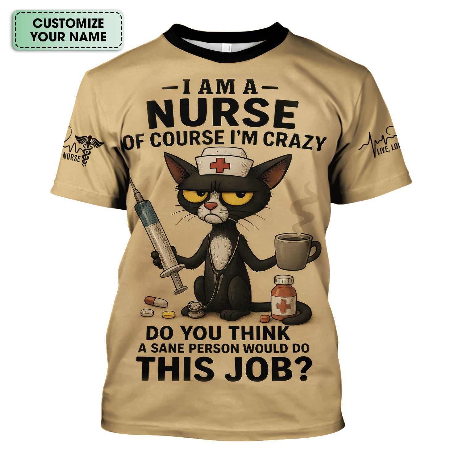 Funny Personalized Nurse Shirt - Crazy Cat & Syringe Graphic with Do You Think A Sane Person Would Do This Job Quote - Custom Gift for RN CNA LPN Women