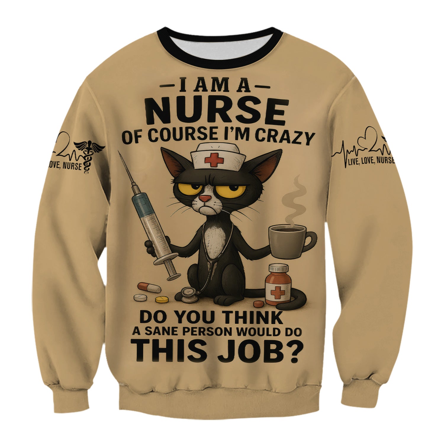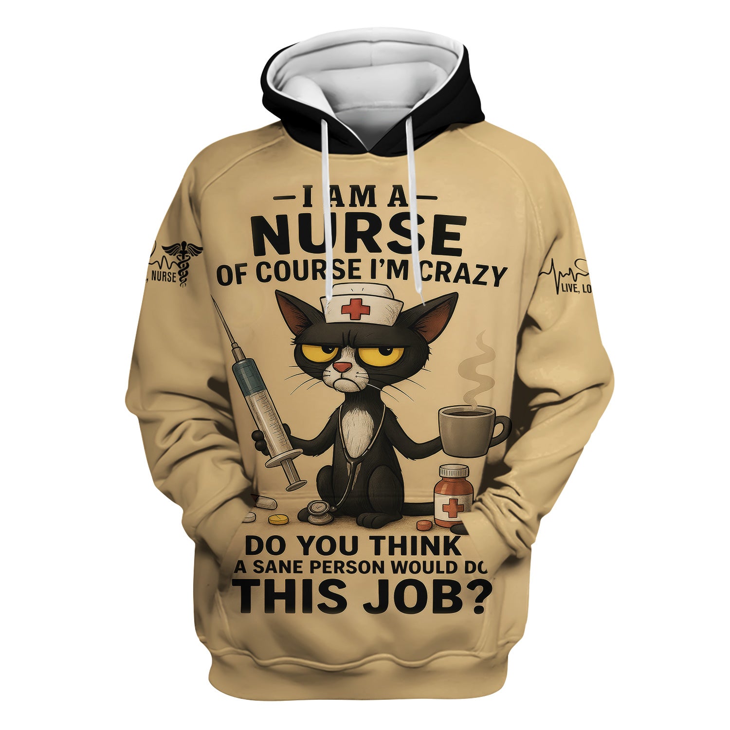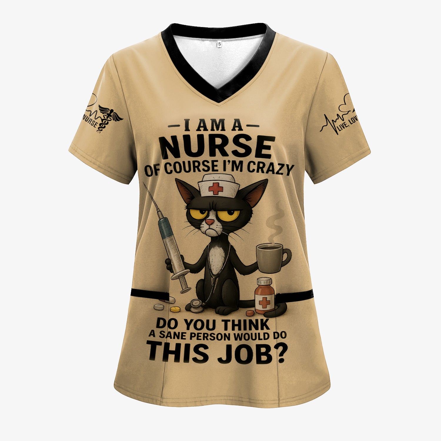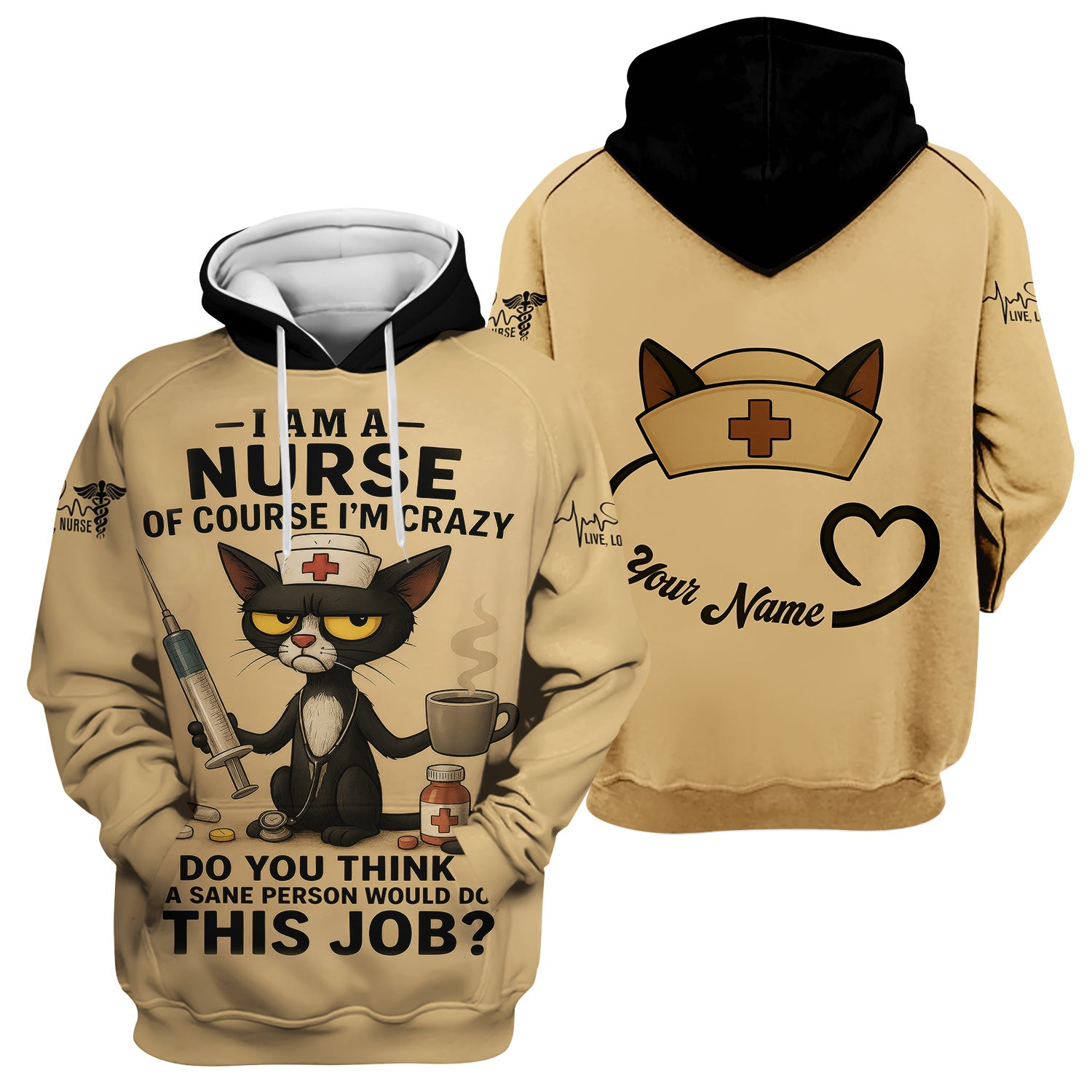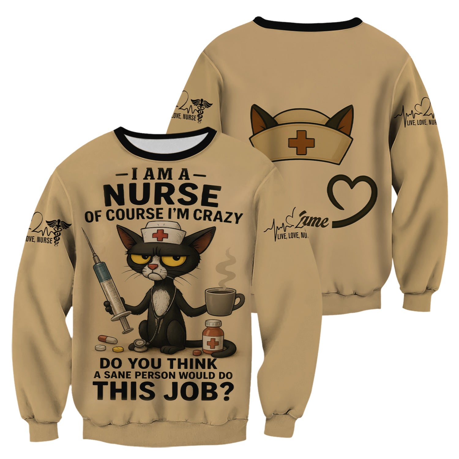 Funny Personalized Nurse Shirt - Crazy Cat & Syringe Graphic with Do You Think A Sane Person Would Do This Job Quote - Custom Gift for RN CNA LPN Women