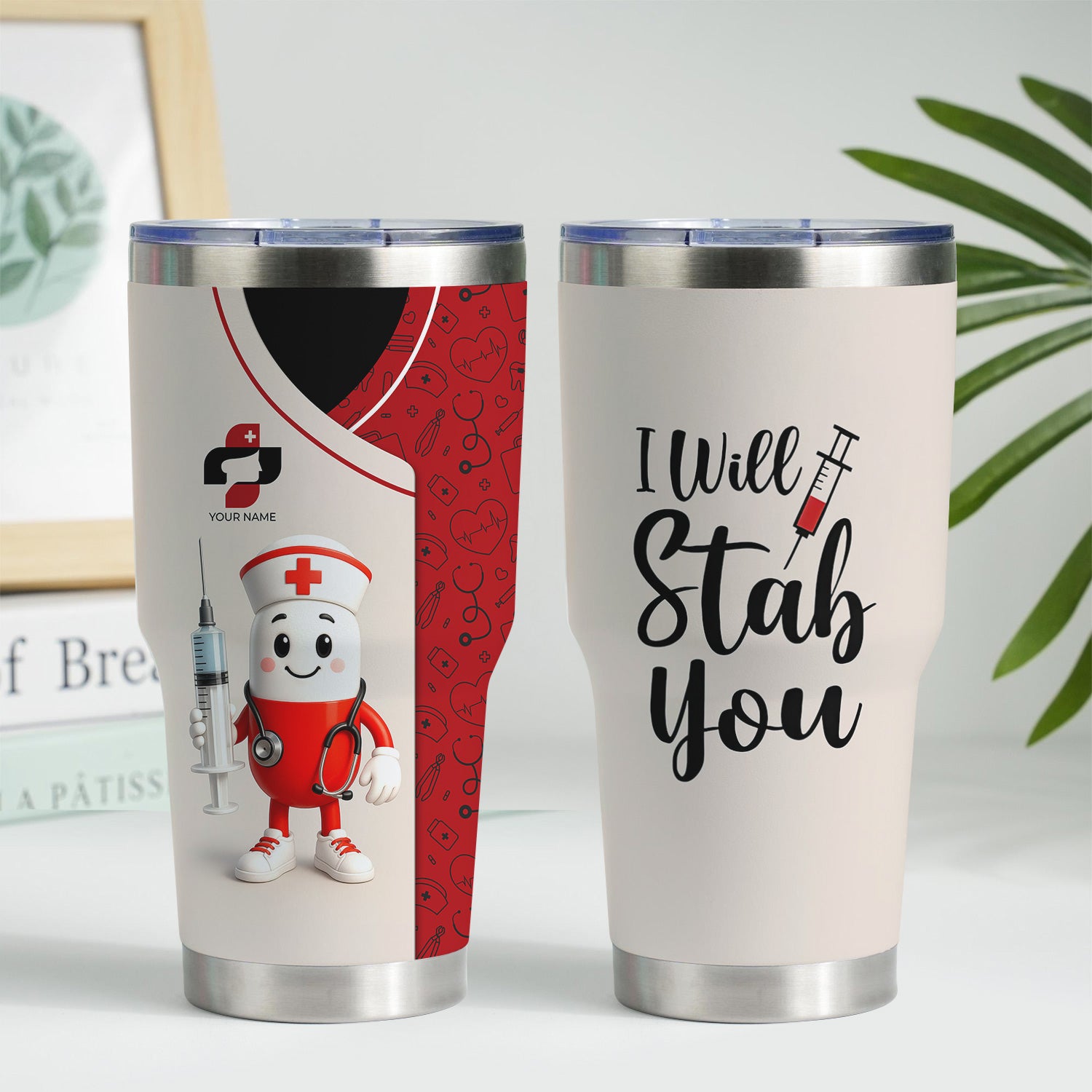 Funny Personalized Nurse Tumbler - Cartoon Pill Design Stainless Steel Travel Mug - RN CNA Healthcare Gift Multiple Color Options