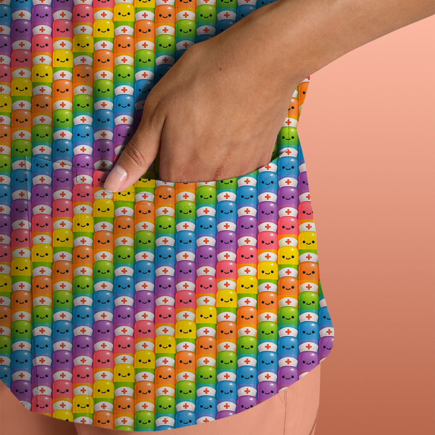 Funny Rainbow Nurse Scrub - Pill Cartoon with Syringe Graphic Tee - Gift for RN CNA LPN or Nursing Student