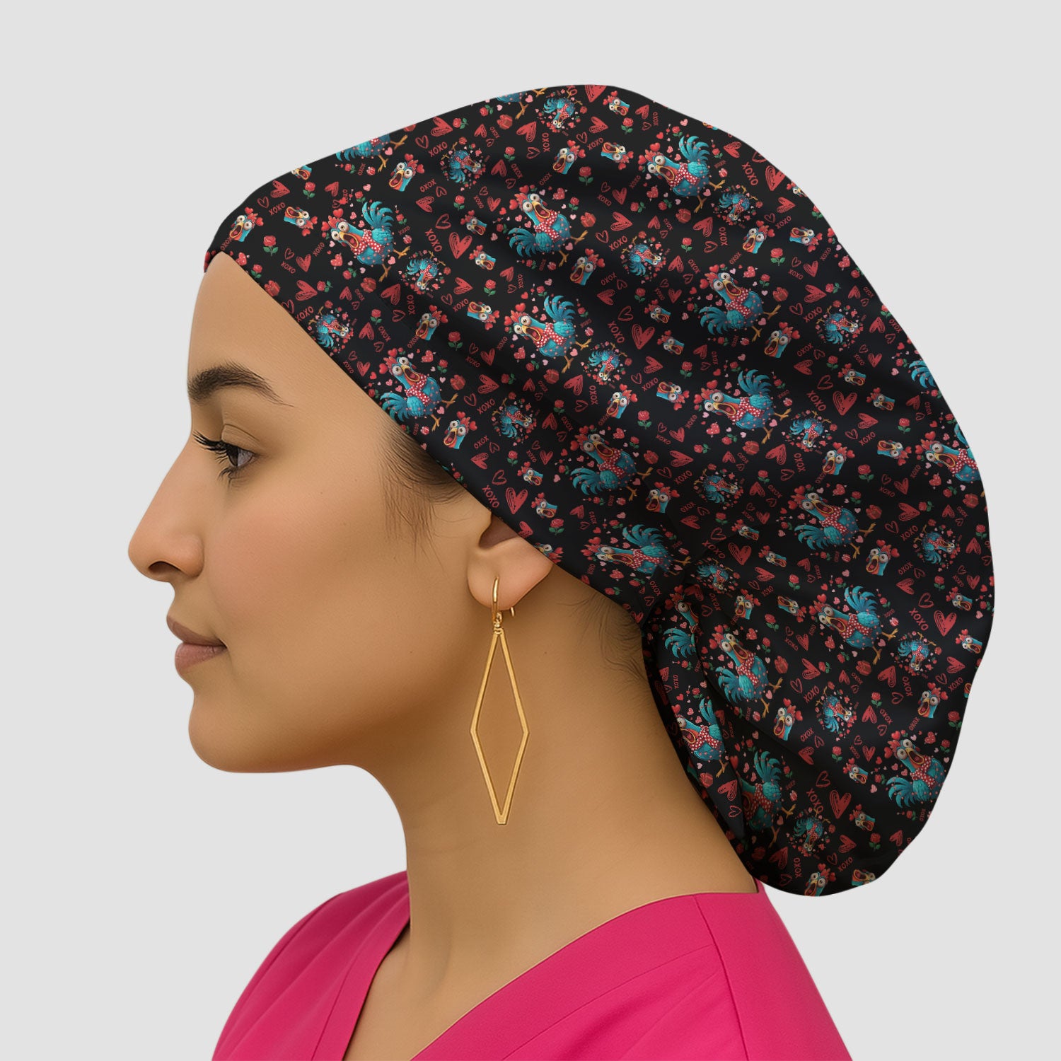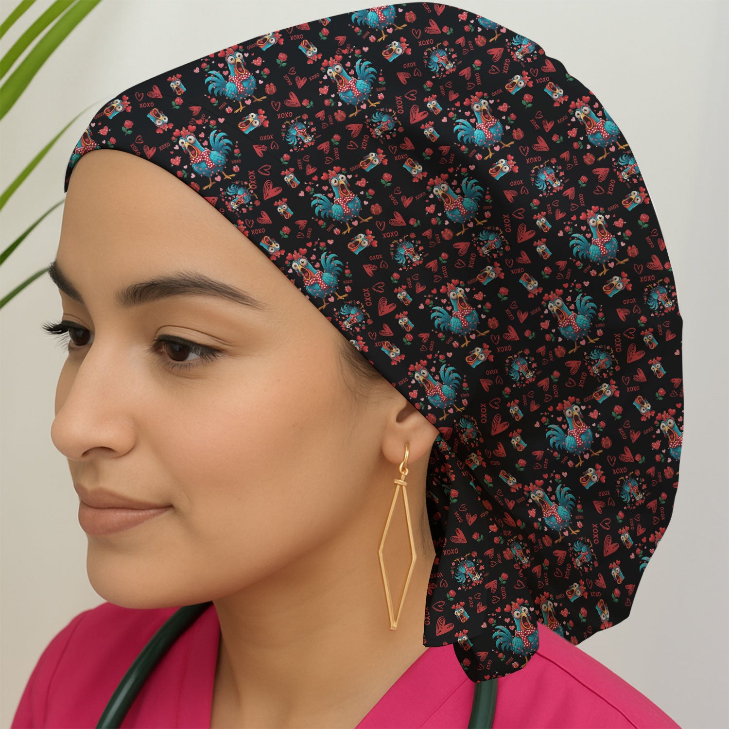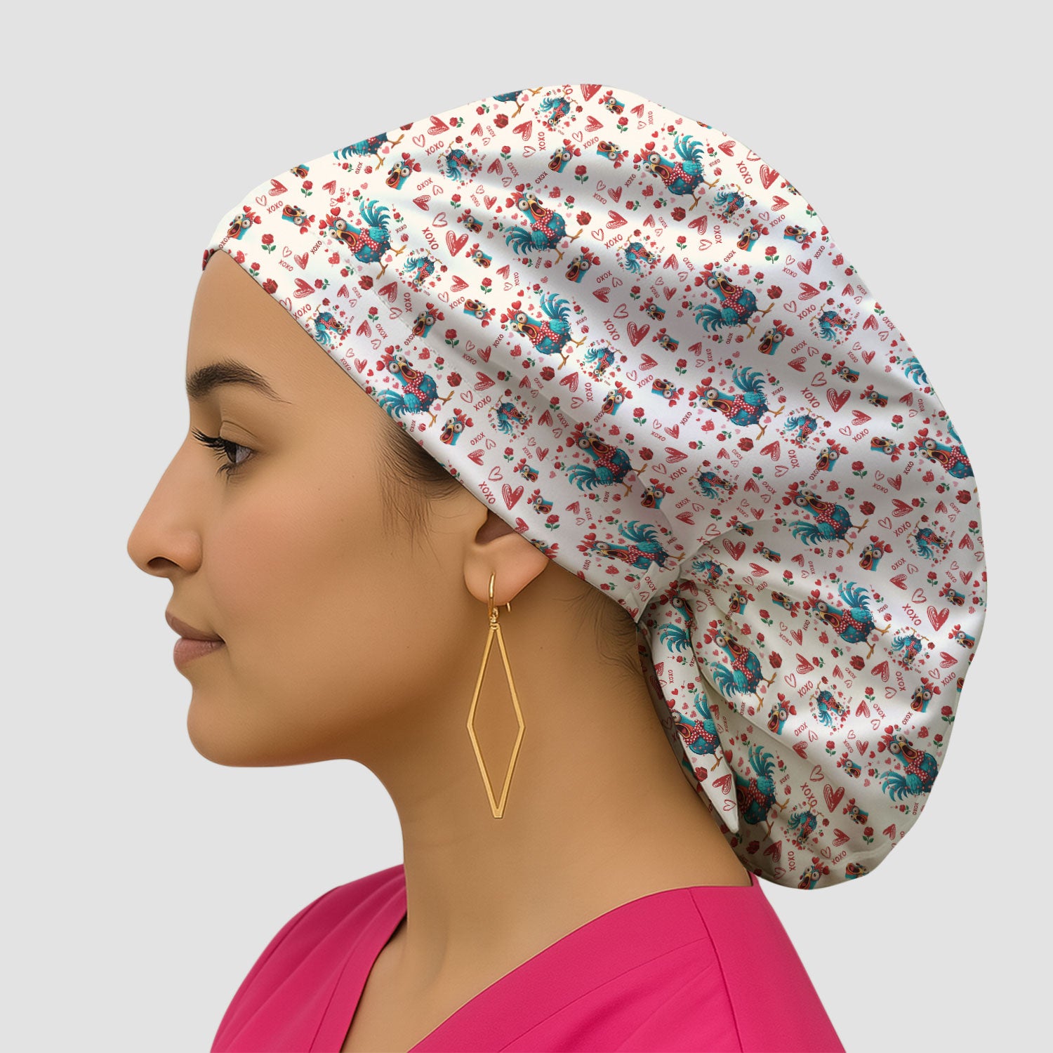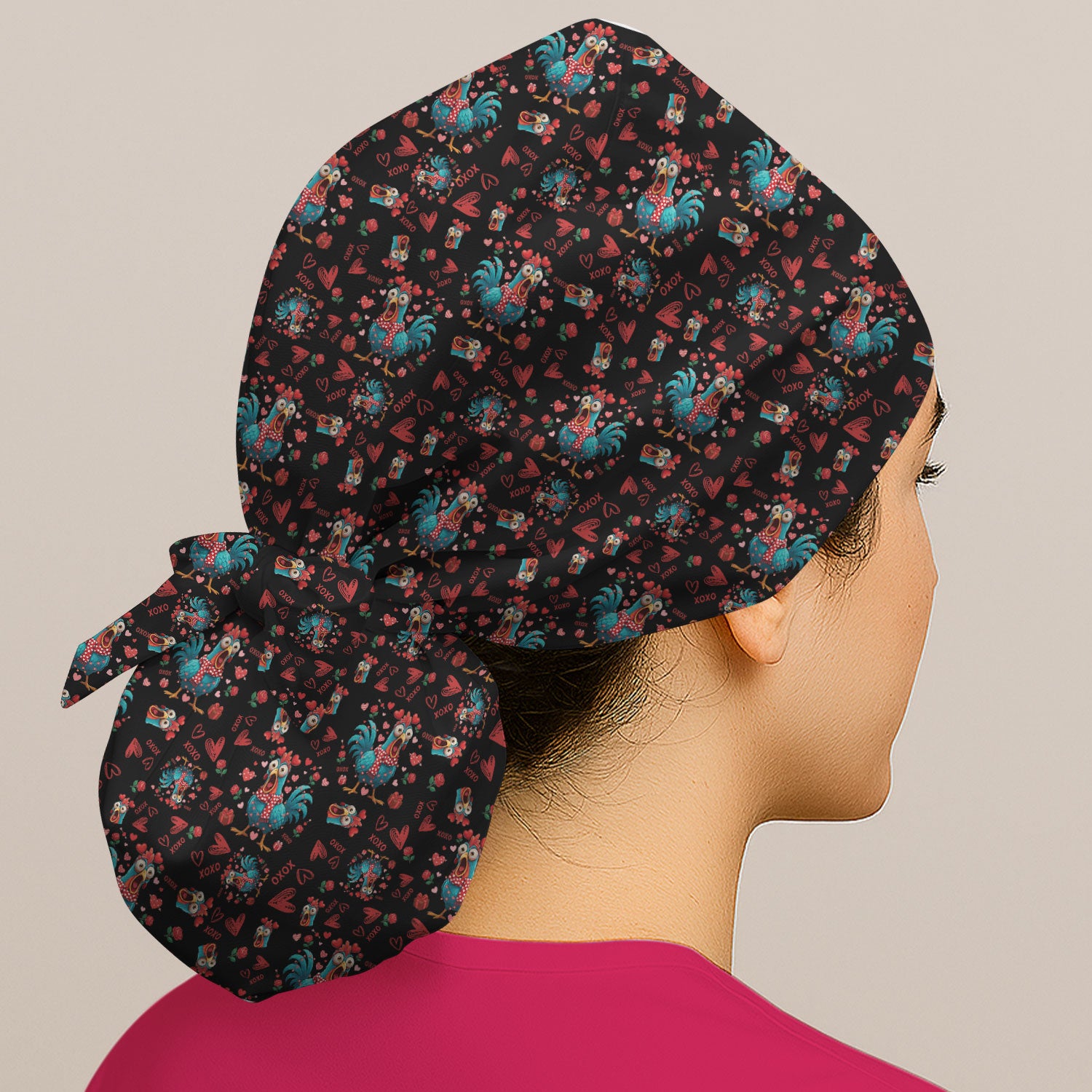 Funny Rooster Valentine Scrub Cap, Cute Chicken XOXO Heart Pattern Nurse Hat, Breathable Fabrics Nursing Uniform